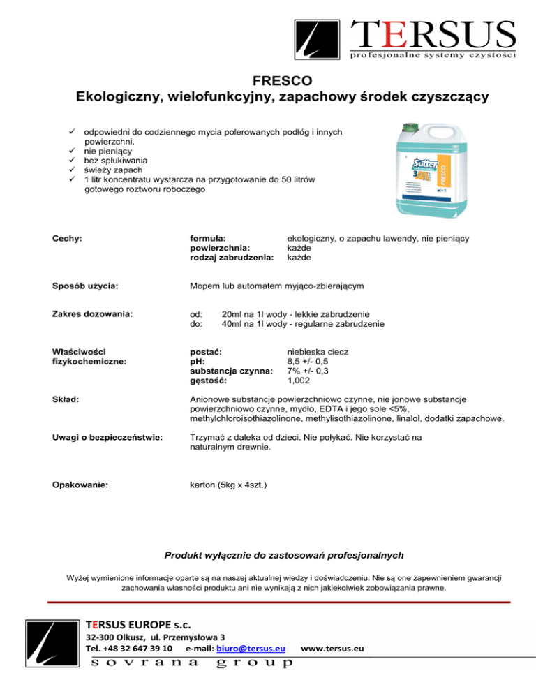 FRESCO Ekologiczny, wielofunkcyjny, zapachowy środek czyszczący odpowiedni do codziennego mycia polerowanych podłóg i innych powierzchni. nie pieniący bez spłukiwania świeży zapach 1 litr koncentratu wystarcza na przygotowanie do 50 litrów gotowego roztworu roboczego Cechy: formuła: powierzchnia: rodzaj zabrudzenia: Sposób użycia: Mopem lub automatem myjąco-zbierającym Zakres dozowania: od: do: Właściwości fizykochemiczne: postać: pH: substancja czynna: gęstość: Skład: Anionowe substancje powierzchniowo czynne, nie jonowe substancje powierzchniowo czynne, mydło, EDTA i jego sole <5%, methylchloroisothiazolinone, methylisothiazolinone, linalol, dodatki zapachowe. Uwagi o bezpieczeństwie: Trzymać z daleka od dzieci. Nie połykać. Nie korzystać na naturalnym drewnie. Opakowanie: karton (5kg x 4szt.) ekologiczny, o zapachu lawendy, nie pieniący każde każde 20ml na 1l wody - lekkie zabrudzenie 40ml na 1l wody - regularne zabrudzenie niebieska ciecz 8,5 +/- 0,5 7% +/- 0,3 1,002 Produkt wyłącznie do zastosowań profesjonalnych Wyżej wymienione informacje oparte są na naszej aktualnej wiedzy i doświadczeniu. Nie są one zapewnieniem gwarancji zachowania własności produktu ani nie wynikają z nich jakiekolwiek zobowiązania prawne. TERSUS EUROPE s.c. 32-300 Olkusz, ul. Przemysłowa 3 Tel. +48 32 647 39 10 e-mail: [email protected] www.tersus.eu