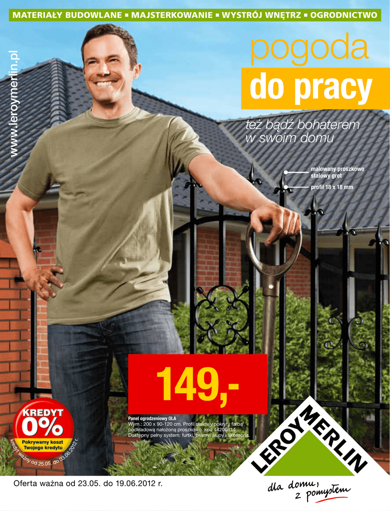 MATERIAŁY BUDOWLANE ■ MAJSTERKOWANIE ■ WYSTRÓJ WNĘTRZ ■ OGRODNICTWO www.leroymerlin.pl pogoda do pracy też bądź bohaterem w swoim domu malowany proszkowo stalowy grot profil 18 x 18 mm 149,k re 20 12 r. Panel ogrodzeniowy OLA Wym.: 200 x 90-120 cm. Profil stalowy pokryty farbą podkładową nałożoną proszkowo. kod 44200814 Dostępny pełny system: furtki, bramy, słupy i akcesoria. dy ny o 6. t w aż d 25.05. do .0 03 Oferta ważna od 23.05. do 19.06.2012 r. grillowanie akcesoria grillowe 2490 29,90 TANIEJ O 17 % Zestaw sztućców do grillowania W komplecie: łopatka, szczypce i widelec. Materiał: stal nierdzewna. kod 42823186 KORZYSTNY 69,Grill węglowy żeliwny prostokątny Wym.: 42 x 23 x 62 cm. Wym. rusztu: 41 x 23 cm. kod 42657503 114,- 139 TANIEJ O 25 zł Grill węglowy owalny ruchomy Wym.: 88 x 71 x 48 cm. Wym. rusztu: 55,5 x 38 cm kod 42813435 369 299 TANIEJ O 70 zł Grill węglowy żeliwny NATERIAL CORFOU Wym.: 90 x 83 cm. Wym. rusztu: 52 x 37,5 cm. kod 44044245 Dolna półka z 3 otworami na butelki. Elementy stalowe chromowane. 779,- 979 TANIEJ O TANIEJ O 10 zł Zestaw sztućców do grillowania W komplecie: łopatka, szczypce i widelec. Materiał: stal szlachetna. kod 43711591 2 deski w opakowaniu 200 zł 3490 Meble z drewna akacjowego BOLTON W komplecie: stół i 4 krzesła. Stół. Wym.: 70 x 120 x 72 cm 343 69 59,- 263,- kod 43966706 Krzesło. Wym.: 47,5 x 58 x 92 cm 159 129,- 39,90 TANIEJ O 12 % kod 43973230 rozkładany blat Cedrowa deska do grillowania Materiał: cedr libański. Namoczona deska służy jako podkład do grillowania delikatnych mięs i ryb. Pod wpływem ciepła deska zaczyna dymić, aromatyzując potrawę. kod 44264206 ZNAKOMITY 499,Grill węglowy ONE TOUCH® ORIGINAL Śr.: 47 cm. Wys.: 89 cm. Materiał: stal. Grill z popielnikiem, termometrem w pokrywie oraz z systemem One-Touch® do szybkiego i łatwego usuwania popiołu. Kolor: czarny. kod 44253566 Dostępne inne kolory. wędzarka 749,Zestaw Mebli rattanowych Borobudur W komplecie: stół i 2 fotele. Stół. Wym.: 66 x 55 cm. Fotel. Wym.: 77 x 72 x 88 cm. kod 43953035 wędzarka wyposażona jest w termometr, system regulacji powietrza, zamykane górne i dolne drzwi 1848,- 2398 TANIEJ O 399,- 550 zł Meble z drewna akacjowego HUSTON W komplecie: stół i 6 krzeseł. Stół rozkładany. Wym.: 90 x 150-200 x 74,5 cm Krzesło 5-pozycyjne. Wym.: 74,5 x 56 x 107 cm 849,Grill betonowy MUSALLA Szer.: 99 cm. Wys.: 190 cm. Gł. stołu: 72 cm. Wym. rusztu: 70 x 40 cm. Ruszt ze stali nierdzewnej, rożen, szuflada na popiół. kod 41984845 Wędzarka z funkcją grillowania Wym.: 49 x 46 x 110 cm. Materiał: stal. Ruszt: 33 x 33,5 cm. kod 44211496 654,- kod 44169041 269 199,- kod 43966804 2 3 KREDYT 0% od 25.05. do 03.06.2012 r. 4890 58,90 TANIEJ O 10 zł Stojak do grillowania faszerowanych warzyw Materiał: stal nierdzewna. W zestawie: obierak, który jednocześnie służy do wydrążania. kod 44264304 plac zabaw Wszystkie naonszane e produkty wykowego z drewna sosn at FSC ® posiadają certyfik 57 47,TANIEJ O 10 zł 259,- 339 TANIEJ O 99 80 zł 88,- 8980 Piasek do piaskownicy Opak.: 20 kg. kod 43249374 Piaskownica SERCE Kolor: żółty. Materiał: plastik. kod 43756195 3550 79,TANIEJ O 45,50 TANIEJ O 10 zł Stół dziecięcy plastikowy Wym.: 46 x 46 x 42 cm. Kolor: niebieski. kod 43755796 Dostępne różne kolory. 20 zł 79,impregnowany ciśnieniowo 429,- 529 TANIEJ O 100 zł Piaskownica i stół wodny w jednym Wym.: 136 x 112 x 55 cm. Pokrywa chroniąca piasek przed zanieczyszczeniem oraz parasol osłaniający dzieci przed słońcem. kod 44273124 295,TANIEJ O 790 kod 44233091 trampoliny 375 1430 impregnowana ciśnieniowo Koń na biegunach MAGENTA Kolor: różowy. Materiał: plastik. kod 44277541 Dostępny również kolor: niebieski 99 kod 44277555 Basen w kształcie statku Wym.: 101,5 x 71 x 79 cm. Na pokładzie znajdują się liczne pirackie akcesoria oraz urządzenie do unoszenia fal wodnych. kod 44273131 posiada atest PZH Krzesło dziecięce plastikowe Wym.: 52 x 33 x 35 cm. Kolor: niebieski. kod 43755824 Dostępne różne kolory. Piaskownica BASIC Wym.: 120 x 120 x 19,5 cm. Materiał: sosna. kod 44233063 Dostępna również o wym.: 120 x 120 x 25 cm 98 mebelki dziecięce 80 zł Trampolina MINI z siatką Śr.: 144 cm. Odporna na promienie UV i wilgoć. Maks. obciążenie: 50 kg. kod 44233175 6895 średnica: 305 cm maks. obciążenie: 150 kg 645,Trampolina z siatką Odporna na promienie UV i wilgoć. kod 44233196 Dostępna również o śr.: 360 cm 965 895,kod 44233203 85,95 TANIEJ O 17 zł Zestaw dziecięcych mebli plastikowych W komplecie: stół i 4 krzesła. Stół. Wym.: 45 x 60 x 50 cm 29,95 Krzesło. Wym.: 55 x 35 x 35 cm. 365,- 489 TANIEJ O 24,95 kod 44316384 Kolor: różowy 14 11,- kod 44316272 Dostępne różne kolory. 124 zł 999,- Zestaw huśtawek Huśtawka pojedyncza, konik. Wym. po zmontowaniu: 194 x 155 x 200 cm. W zestawie łączniki stalowe i mocowania. Maks. obciążenie na huśtawkę: 34 kg. Przeznaczone dla dzieci w wieku 3-10 lat. kod 44233210 Dostępny również: Zestaw huśtawek ze zjeżdżalnią 668 568,Wym. po zmontowaniu: 246 x 192 x 200 cm. kod 44233224 1198 TANIEJ O 199 zł Domek z tarasem dla dzieci JUNIOR Wym.: 110 x 171 x 290 cm. Miejsce do montażu ślizgu. Materiał: sosna. kod 44253951 4 5 1149,- 1299 TANIEJ O 150 zł Domek SOCZYSTA ZIELEŃ Wym.: 140 x 124 x 147 cm. Innowacyjny domek oferujący niezrównane możliwości interaktywnej zabawy. kod 44273194 KREDYT 0% od 25.05. do 03.06.2012 r. pielęgnacja moc: 1,7 KM szelki i metalowa tarcza w komplecie trawnika 277,Kosa spalinowa PNBC415-2T Poj. skokowa silnika: 42,7 cm3. Szer. robocza żyłki tnącej: 42 cm. Szer. robocza tarczy tnącej: 23 cm. kod 44191035 17 90 58 38,TANIEJ O 20 zł 89 Wąż ogrodowy GEOLIA Śr.: 1/2’’ (12,5 mm). Dł.: 20 m. kod 44186912 18 OFERTA SPECJALNA Hortensja Poj. doniczki: 1,25 l. Wys.: 35 cm. Min. 3 pąki kwiatowe. kod 44276666 Dostępne również: wys. 30 cm z min. 5 pąkami kwiatowym