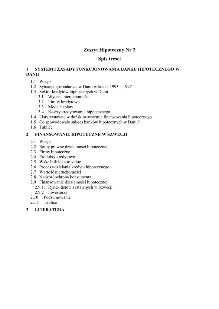Zeszyt Hipoteczny Nr 2 Spis treści 1 SYSTEM I ZASADY FUNKCJONOWANIA BANKU HIPOTECZNEGO W DANII 1.1 Wstęp 1.2 Sytuacja gospodarcza w Danii w latach 1993 – 1997 1.3 Sektor kredytów hipotecznych w Danii 1.3.1 Wycena nieruchomości 1.3.2 Limity kredytowe 1.3.3 Modele spłaty 1.3.4 Koszty kredytowania hipotecznego 1.4 Listy zastawne w duńskim systemie finansowania hipotecznego 1.5 Co spowodowało sukces banków hipotecznych w Danii? 1.6 Tablice 2 FINANSOWANIE HIPOTECZNE W SZWECJI 2.1 Wstęp 2.2 Ramy prawne działalności hipotecznej 2.3 Firmy hipoteczne 2.4 Produkty kredytowe 2.5 Wskaźnik loan to value 2.6 Proces udzielania kredytu hipotecznego 2.7 Wartość nieruchomości 2.8 Nadzór/ ochrona konsumenta 2.9 Finansowanie działalności hipotecznej 2.9.1. Rynek listów zastawnych w Szwecji 2.9.2 Inwestorzy 2.10 Podsumowanie 2.11 Tablice 3 LITERATURA