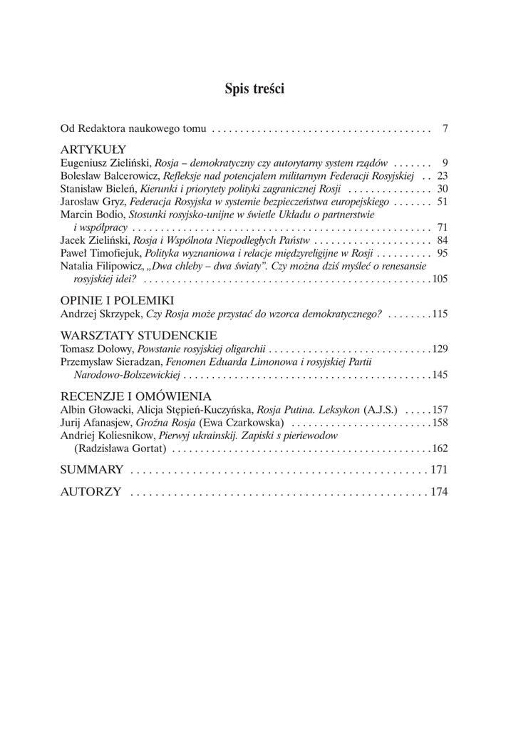 Spis treÊci Od Redaktora naukowego tomu . . . . . . . . . . . . . . . . . . . . . . . . . . . . . . . . . . . . . . . 7 ARTYKU¸Y Eugeniusz Zieliƒski, Rosja – demokratyczny czy autorytarny system rzàdów . . . . . . . 9 Boles∏aw Balcerowicz, Refleksje nad potencja∏em militarnym Federacji Rosyjskiej . . 23 Stanis∏aw Bieleƒ, Kierunki i priorytety polityki zagranicznej Rosji . . . . . . . . . . . . . . . 30 Jaros∏aw Gryz, Federacja Rosyjska w systemie bezpieczeƒstwa europejskiego . . . . . . . 51 Marcin Bodio, Stosunki rosyjsko-unijne w Êwietle Uk∏adu o partnerstwie i wspó∏pracy . . . . . . . . . . . . . . . . . . . . . . . . . . . . . . . . . . . . . . . . . . . . . . . . . . . . . 71 Jacek Zieliƒski, Rosja i Wspólnota Niepodleg∏ych Paƒstw . . . . . . . . . . . . . . . . . . . . . 84 Pawe∏ Timofiejuk, Polityka wyznaniowa i relacje mi´dzyreligijne w Rosji . . . . . . . . . . 95 Natalia Filipowicz, „Dwa chleby – dwa Êwiaty”. Czy mo˝na dziÊ myÊleç o renesansie rosyjskiej idei? . . . . . . . . . . . . . . . . . . . . . . . . . . . . . . . . . . . . . . . . . . . . . . . . . . . 105 OPINIE I POLEMIKI Andrzej Skrzypek, Czy Rosja mo˝e przystaç do wzorca demokratycznego? . . . . . . . . 115 WARSZTATY STUDENCKIE Tomasz Do∏owy, Powstanie rosyjskiej oligarchii . . . . . . . . . . . . . . . . . . . . . . . . . . . . . 129 Przemys∏aw Sieradzan, Fenomen Eduarda Limonowa i rosyjskiej Partii Narodowo-Bolszewickiej . . . . . . . . . . . . . . . . . . . . . . . . . . . . . . . . . . . . . . . . . . . . 145 RECENZJE I OMÓWIENIA Albin G∏owacki, Alicja St´pieƒ-Kuczyƒska, Rosja Putina. Leksykon (A.J.S.) . . . . . 157 Jurij Afanasjew, Groêna Rosja (Ewa Czarkowska) . . . . . . . . . . . . . . . . . . . . . . . . . 158 Andriej Koliesnikow, Pierwyj ukrainskij. Zapiski s pieriewodow (Radzis∏awa Gortat) . . . . . . . . . . . . . . . . . . . . . . . . . . . . . . . . . . . . . . . . . . . . . . 162 SUMMARY . . . . . . . . . . . . . . . . . . . . . . . . . . . . . . . . . . . . . . . . . . . . . . . . 171 AUTORZY . . . . . . . . . . . . . . . . . . . . . . . . . . . . . . . . . . . . . . . . . . . . . . . . 174 Contents From the Academic Editor of the volume . . . . . . . . . . . . . . . . . . . . . . . . . . . . . . . . 7 ARTICLES Eugeniusz Zieliƒski, Russia: a Democratic or Autocratic System of Government . . . 9 Boles∏aw Balcerowicz, Reflecting on the Military Potential of the Russian Federation 23 Stanis∏aw Bieleƒ, Directions and Priorities of Russia’s Foreign Policy . . . . . . . . . . . . 30 Jaros∏aw Gryz, The Russian Federation in the European Security System . . . . . . . . . 51 Marcin Bodio, The Russian – EU Relations Within Partnership and Cooperation Agreement . . . . . . . . . . . . . . . . . . . . . . . . . . . . . . . . . . . . . . . . . . . . . . . . . . . . . . 71 Jacek Zieliƒski, Russia and the Commonwealth of Independent States . . . . . . . . . . . 84 Pawe∏ Timofiejuk, Religious Creed Policy and Inter-Religious Relations in Russia . . . 95 Natalia Filipowicz, “Two Breads – Two Worlds”. Are We Justified Today in Thinking About the Renaissance of the Russian Idea? . . . . . . . . . . . . . . . . . . . . . . . . . . . . . 105 VIEWS AND POLEMICS Andrzej Skrzypek, Does Russia fit the Democratic Pattern? . . . . . . . . . . . . . . . . . . . 115 STUDENTS’ WORKSHOPS Tomasz Do∏owy, The Emergence of Russian Oligarchy . . . . . . . . . . . . . . . . . . . . . . . 129 Przemys∏aw Sieradzan, The Phenomenon of Eduard Limonov and the Russian National – Bolshevik Party . . . . . . . . . . . . . . . . . . . . . . . . . . . . . . . . . . . . . . . . . . 145 REVIEWS AND COMMENTARIES Albin G∏owacki, Alicja St´pieƒ-Kuczyƒska, Rosja Putina. Leksykon (A.J.S.) . . . . . 157 Jurij Afanasjew, Groêna Rosja (Ewa Czarkowska) . . . . . . . . . . . . . . . . . . . . . . . . . 158 Andrej Kolsnikow, Pierwyj ukrainskij. Zapiski s pieriewoda (Radzis∏awa Gortat) . . 162 SUMMARY . . . . . . . . . . . . . . . . . . . . . . . . . . . . . . . . . . . . . . . . . . . . . . . . 171 CONTRIBUTORS . . . . . . . . . . . . . . . . . . . . . . . . . . . . . . . . . . . . . . . . . . . 174
