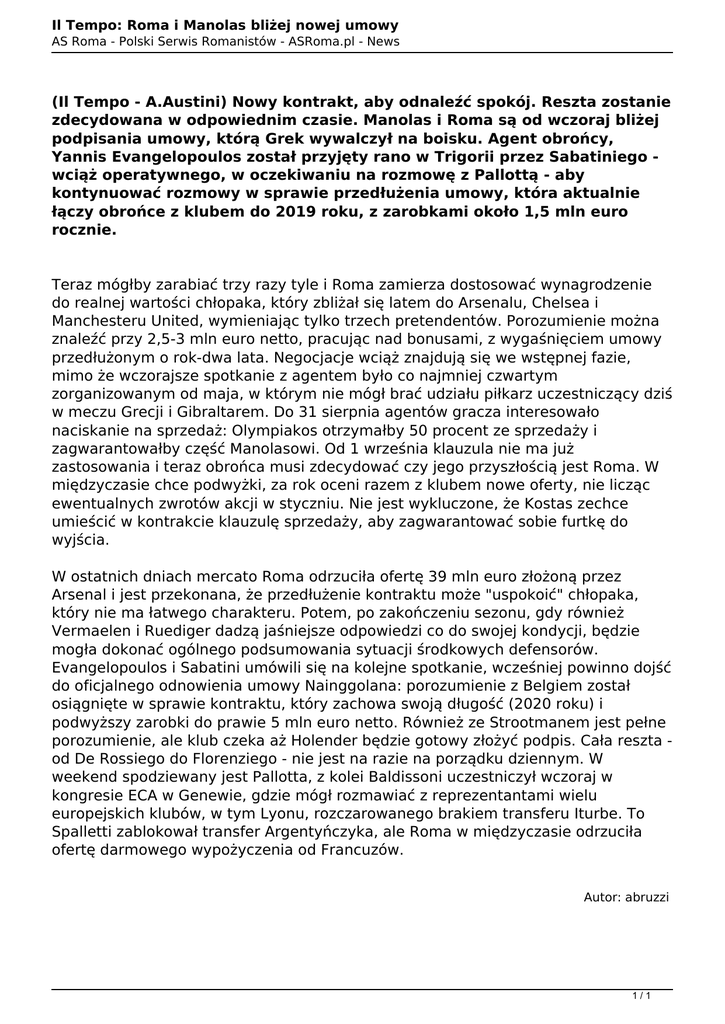 Il Tempo: Roma i Manolas bliżej nowej umowy AS Roma - Polski Serwis Romanistów - ASRoma.pl - News (Il Tempo - A.Austini) Nowy kontrakt, aby odnaleźć spokój. Reszta zostanie zdecydowana w odpowiednim czasie. Manolas i Roma są od wczoraj bliżej podpisania umowy, którą Grek wywalczył na boisku. Agent obrońcy, Yannis Evangelopoulos został przyjęty rano w Trigorii przez Sabatiniego wciąż operatywnego, w oczekiwaniu na rozmowę z Pallottą - aby kontynuować rozmowy w sprawie przedłużenia umowy, która aktualnie łączy obrońce z klubem do 2019 roku, z zarobkami około 1,5 mln euro rocznie. Teraz mógłby zarabiać trzy razy tyle i Roma zamierza dostosować wynagrodzenie do realnej wartości chłopaka, który zbliżał się latem do Arsenalu, Chelsea i Manchesteru United, wymieniając tylko trzech pretendentów. Porozumienie można znaleźć przy 2,5-3 mln euro netto, pracując nad bonusami, z wygaśnięciem umowy przedłużonym o rok-dwa lata. Negocjacje wciąż znajdują się we wstępnej fazie, mimo że wczorajsze spotkanie z agentem było co najmniej czwartym zorganizowanym od maja, w którym nie mógł brać udziału piłkarz uczestniczący dziś w meczu Grecji i Gibraltarem. Do 31 sierpnia agentów gracza interesowało naciskanie na sprzedaż: Olympiakos otrzymałby 50 procent ze sprzedaży i zagwarantowałby część Manolasowi. Od 1 września klauzula nie ma już zastosowania i teraz obrońca musi zdecydować czy jego przyszłością jest Roma. W międzyczasie chce podwyżki, za rok oceni razem z klubem nowe oferty, nie licząc ewentualnych zwrotów akcji w styczniu. Nie jest wykluczone, że Kostas zechce umieścić w kontrakcie klauzulę sprzedaży, aby zagwarantować sobie furtkę do wyjścia. W ostatnich dniach mercato Roma odrzuciła ofertę 39 mln euro złożoną przez Arsenal i jest przekonana, że przedłużenie kontraktu może "uspokoić" chłopaka, który nie ma łatwego charakteru. Potem, po zakończeniu sezonu, gdy również Vermaelen i Ruediger dadzą jaśniejsze odpowiedzi co do swojej kondycji, będzie mogła dokonać ogólnego podsumowania sytuacji środkowych defensorów. Evangelopoulos i Sabatini umówili się na kolejne spotkanie, wcześniej powinno dojść do oficjalnego odnowienia umowy Nainggolana: porozumienie z Belgiem został osiągnięte w sprawie kontraktu, który zachowa swoją długość (2020 roku) i podwyższy zarobki do prawie 5 mln euro netto. Również ze Strootmanem jest pełne porozumienie, ale klub czeka aż Holender będzie gotowy złożyć podpis. Cała reszta od De Rossiego do Florenziego - nie jest na razie na porządku dziennym. W weekend spodziewany jest Pallotta, z kolei Baldissoni uczestniczył wczoraj w kongresie ECA w Genewie, gdzie mógł rozmawiać z reprezentantami wielu europejskich klubów, w tym Lyonu, rozczarowanego brakiem transferu Iturbe. To Spalletti zablokował transfer Argentyńczyka, ale Roma w międzyczasie odrzuciła ofertę darmowego wypożyczenia od Francuzów. Autor: abruzzi 1/1 Powered by TCPDF (www.tcpdf.org)