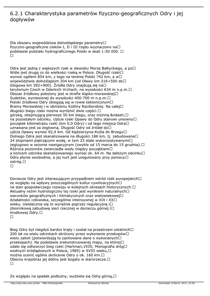 6.2.1 Charakterystyka parametrów fizyczno-geograficznych Odry i jej dopływów Dla obszaru województwa dolnośląskiego parametry fizyczno-geograficzne cieków I, II i III rzędu wyznaczono na podstawie podziału hydrograficznego Polski w skali 1:50 000. Odra jest jedną z większych rzek w zlewisku Morza Bałtyckiego, a po Wiśle jest drugą co do wielkości rzeką w Polsce. Długość rzeki wynosi ogółem 854 km, z tego na terenie Polski 742 km, a w województwie dolnośląskim 204 km (od Oławy km 216+500 do Głogowa km 392+900). Źródła Odry znajdują się na terytorium Czech w Oderkich Vrchach, na wysokości 634 m n.p.m. Obszar źródłowy położony jest w strefie śląsko-morawskiej Sudetów, wyniesionej do wysokości 400-700 m n.p.m. Potoki źródłowe Odry zbiegają się w rowie tektonicznym Bramy Morawskiej i w obniżeniu Kotliny Raciborskiej. Na całej długości biegu rzeki można wyróżnić dwie części: górską, obejmującą pierwsze 50 km biegu, oraz nizinną – na pozostałym odcinku. Ujście rzeki Opawy do Odry stanowi umowny początek kilometrażu rzeki (km 0,0 Odry) i od tego miejsca Odra uznawana jest za żeglowną. Długość Odry od źródeł do ujścia Opawy wynosi 92,4 km. Od Kędzierzyna-Koźla do Brzegu Dolnego Odra jest skanalizowana na długości 186 km, tj. zabudowana 24 stopniami piętrzącymi wodę, w tym 23 stale wykorzystywanymi żeglugowo w sezonie nawigacyjnym (zwykle od 15 marca do 15 grudnia). Różnica poziomów zwierciadła wody między początkiem a końcem odcinka skanalizowanego wynosi ok. 64 m. Na dalszym odcinku Odra płynie swobodnie, a jej nurt jest uregulowany przy pomocy ostróg. Dorzecze Odry jest interesującym przypadkiem wśród rzek europejskich ze względu na wpływy poszczególnych kultur cywilizacyjnych na stan gospodarczego rozwoju w kolejnych okresach historycznych. Aktualny reżim hydrologiczny tej rzeki jest wynikiem naturalnych warunków geograficznych i klimatycznych oraz wielowiekowej działalności człowieka, szczególnie intensywnej w XIX i XX wieku. Uwidacznia się to wyraźnie poprzez regulacyjną i zbiornikową zabudowę sieci rzecznej w dorzeczu górnej i środkowej Odry. Bieg Odry był niegdyś bardzo kręty i został na przestrzeni ostatnich 200 lat na wielu odcinkach skrócony przez wykonanie przekopów wielu zakoli (potwierdzają to zachowane dane o wykonanych przekopach). Na podstawie zrekonstruowanej mapy, na której udało się odtworzyć bieg rzeki (Hartman,1935; Monografia dróg wodnych śródlądowych w Polsce, 1985) w XVIII wieku, można ocenić ogólne skrócenie Odry o ok. 160 km. Obecny krajobraz jej doliny jest bogaty w starorzecza. Ze względu na spadek podłużny, wydziela się Odrę górną, http://eko.wbu.wroc.pl/eko - WBU Ekofizjografia Powered by Mambo Generated: 8 March, 2017, 23:59 środkową i dolną: - górna: od źródeł do Koźla, ma długość 202 km. Na długości pierwszych 54 km Odra ma charakter rzeki górskiej o spadku 7,2‰, natomiast na terytorium Polski spadek jest dużo mniejszy i wynosi ok. 0,33‰, - środkowa: od Koźla do ujścia Warty, o spadkach od 0,28 do 0,19‰, ma długość 522 km (w tym odcinek skanalizowany o długości 187 km i swobodnie płynący o długości 335 km), - dolna: od ujścia Warty do Zalewu Szczecińskiego, o spadkach od 0,05 do 0,001‰. Średni spadek Odry wynosi 0,74‰. Głównymi dopływami Odry w granicach województwa dolnośląskiego są rzeki górskie, biorące początek w Sudetach, tj.: Nysa Kłodzka (Lc_dolnośl. = 99,7 km), Bystrzyca (Lc_dolnośl = 101,4 km), Kaczawa (Lc_dolnośl = 101,4 km), Bóbr (Lc_dolnośl = 161,1 km) i Nysa Łużycka (Lc_dolnośl = 78,7 km) oraz rzeki nizinne tj.: Oława (Lc_dolnośl = 96,3 km), Ślęza (Lc_dolnośl = 84,1 km), Widawa (Lc_dolnośl = 83,9 km), Barycz (Lc_dolnośl = 108,8 km). Rzeki górskie wypływają z wysokości od 1190 m n.p.m. (źródła Bobru) do 550 m n.p.m. ( źródła Kaczawy). Rzeki nizinne wypływają z wysokości od 370 m n.p.m. (źródła Ślęzy) do 126 m n.p.m. (źródła Baryczy). Średni spadek rzek górskich waha się od 5,72‰ na Bystrzycy do 3,43‰ na Nysie Łużyckiej. Natomiast na rzekach nizinnych spadek cieku kształtuje się w przedziale od 3,11‰ na Ślęzie do 0,42‰ na Baryczy. (Adynkiewicz-Piragas, Tokarczyk, 2002; Atlas Śląska Dolnego i Opolskiego, 1997; Dubicki i inni, 2002; Kondracki, 2001). http://eko.wbu.wroc.pl/eko - WBU Ekofizjografia Powered by Mambo Generated: 8 March, 2017, 23:59