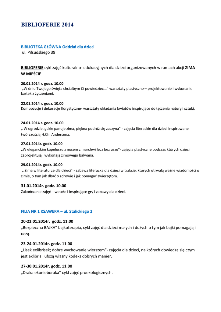 BIBLIOFERIE 2014 BIBLIOTEKA GŁÓWNA Oddział dla dzieci ul. Piłsudskiego 39 BIBLIOFERIE cykl zajęć kulturalno- edukacyjnych dla dzieci organizowanych w ramach akcji ZIMA W MIEŚCIE 20.01.2014 r. godz. 10.00 „W dniu Twojego święta chciałbym Ci powiedzieć...” warsztaty plastyczne – projektowanie i wykonanie kartek z życzeniami. 22.01.2014 r. godz. 10.00 Kompozycje i dekoracje florystyczne- warsztaty układania kwiatów inspirujące do łączenia natury i sztuki. 24.01.2014 r. godz. 10.00 „ W ogrodzie, gdzie panuje zima, piękna podróż się zaczyna” - zajęcia literackie dla dzieci inspirowane twórczością H.Ch. Andersena. 27.01.2014r. godz. 10.00 „W eleganckim kapeluszu z nosem z marchwi lecz bez uszu”- zajęcia plastyczne podczas których dzieci zaprojektują i wykonają zimowego bałwana. 29.01.2014r. godz. 10.00 „ Zima w literaturze dla dzieci” - zabawa literacka dla dzieci w trakcie, których utrwalą ważne wiadomości o zimie, o tym jak dbać o zdrowie i jak pomagać zwierzętom. 31.01.2014r. godz. 10.00 Zakończenie zajęć – wesołe i inspirujące gry i zabawy dla dzieci. FILIA NR 1 KSAWERA – ul. Stalickiego 2 20-22.01.2014r. godz. 11.00 „Bezpieczna BAJKA” bajkoterapia, cykl zajęć dla dzieci małych i dużych o tym jak bajki pomagają i uczą. 23-24.01.2014r. godz. 11.00 „Lisek exlibrisek; dobre wychowanie wierszem”- zajęcia dla dzieci, na których dowiedzą się czym jest exlibris i ułożą własny kodeks dobrych manier. 27-30.01.2014r. godz. 11.00 „Draka ekonieboraka” cykl zajęć proekologicznych. FILIA NR 2 WARPIE – ul. 35-lecia PRL 1 20.01.2014r. godz. 11.00 „Zimowy obrazek” głośne czytanie fragmentów utworów o zimie będące inspiracją do wykonania zimowych pejzaży 27.01.2014r. godz.11.00 „Ciekawy świat dinozaurów” - poznawanie historii życia dinozaurów i przygotowanie ilustrowanej opowieści o ich przygodach 30.01.2014r. godz.11.00 „Śpi na bocznicy lokomotywa” wirtualna podróż szlakiem Zabytków Techniki Województwa Śląskiego FILIA NR 4 ŁAGISZA – ul. Pokoju 44 22.01.2014r. godz. 11.00 „ Smoki robią wielkie skoki” zajęcia o zimowych dyscyplinach sportu. 28.01.2014r. godz. 11.00 „Dwanaście miesięcy mamy i je dobrze znamy” zajęcia literackie w oparciu o wiersze Wandy Chotomskiej. FILIA NR 5 GRODZIEC – ul. Słowackiego 2 14.01.2014r. godz. 10.00 Fantazje na różne okazje- zajęcia literackie dla dzieci poświęcone układaniu wierszyków okolicznościowych. 27-31.01.2014r. godz. 11.00-13.00 „ My się w ferie nie nudzimy tylko w bibliotece dobrze bawimy” - zajęcia literacko-plastyczne dla dzieci 29.01.2014r. godz. 10..00 Wiersz z uśmiechem – spotkanie autorskie z WŁADYSŁAWEM ŚLIWONIEM FILIA NR 7 ZAMKOWE – ul. Rycerska 2 17.01.2014 godz. 10.00 „Tu mieszka bajeczka” spotkania z twórczością Juliana Tuwima -zajęcia literackie dla dzieci 21.01.2014 godz. 11.30 „Baśnie z czterech stron świata” zajęcia literackie 28.01.2014 godz. 11.30 W baśniach dobro zawsze zwycięża zło drugi etap zajęć literackich Baśnie z czterech stron świata FILIA NR 9 PODŁOSIE – ul. Podłosie 10 20.01.2014 godz. 10.30 „Babciu, Dziadku co Ci dam ...”- zajęcia plastyczne dla dzieci – przygotowanie laurek okazjonalnych. 22.01.2014 godz. 10.30 „Chodził malarz od chaty do chaty, wszystkie szyby malował nam w kwiaty” – zimowe zajęcia literackie. 27.01.2014 godz. 10.30 „Księżniczki i książęta, panowie i damy- na bal dziś zapraszamy” zajęcia plastyczne dla dzieci. 29.01.2014 godz. 10.30 Zima w Będzinie – zagłębiowskie zwyczaje karnawałowe- zajęcia poświęcone obrzędom i zwyczajom dorocznym
