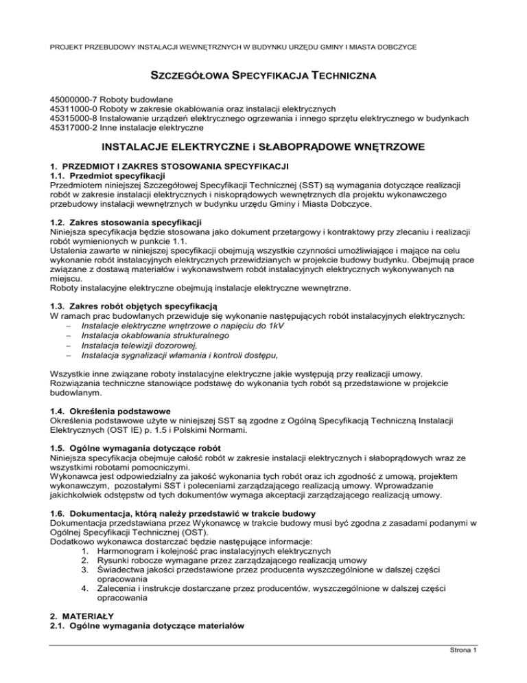 PROJEKT PRZEBUDOWY INSTALACJI WEWNĘTRZNYCH W BUDYNKU URZĘDU GMINY I MIASTA DOBCZYCE SZCZEGÓŁOWA SPECYFIKACJA TECHNICZNA 45000000-7 Roboty budowlane 45311000-0 Roboty w zakresie okablowania oraz instalacji elektrycznych 45315000-8 Instalowanie urządzeń elektrycznego ogrzewania i innego sprzętu elektrycznego w budynkach 45317000-2 Inne instalacje elektryczne INSTALACJE ELEKTRYCZNE i SŁABOPRĄDOWE WNĘTRZOWE 1. PRZEDMIOT I ZAKRES STOSOWANIA SPECYFIKACJI 1.1. Przedmiot specyfikacji Przedmiotem niniejszej Szczegółowej Specyfikacji Technicznej (SST) są wymagania dotyczące realizacji robót w zakresie instalacji elektrycznych i niskoprądowych wewnętrznych dla projektu wykonawczego przebudowy instalacji wewnętrznych w budynku urzędu Gminy i Miasta Dobczyce. 1.2. Zakres stosowania specyfikacji Niniejsza specyfikacja będzie stosowana jako dokument przetargowy i kontraktowy przy zlecaniu i realizacji robót wymienionych w punkcie 1.1. Ustalenia zawarte w niniejszej specyfikacji obejmują wszystkie czynności umożliwiające i mające na celu wykonanie robót instalacyjnych elektrycznych przewidzianych w projekcie budowy budynku. Obejmują prace związane z dostawą materiałów i wykonawstwem robót instalacyjnych elektrycznych wykonywanych na miejscu. Roboty instalacyjne elektryczne obejmują instalacje elektryczne wewnętrzne. 1.3. Zakres robót objętych specyfikacją W ramach prac budowlanych przewiduje się wykonanie następujących robót instalacyjnych elektrycznych: − Instalacje elektryczne wnętrzowe o napięciu do 1kV − Instalacja okablowania strukturalnego − Instalacja telewizji dozorowej, − Instalacja sygnalizacji włamania i kontroli dostępu, Wszystkie inne związane roboty instalacyjne elektryczne jakie występują przy realizacji umowy. Rozwiązania techniczne stanowiące podstawę do wykonania tych robót są przedstawione w projekcie budowlanym. 1.4. Określenia podstawowe Określenia podstawowe użyte w niniejszej SST są zgodne z Ogólną Specyfikacją Techniczną Instalacji Elektrycznych (OST IE) p. 1.5 i Polskimi Normami. 1.5. Ogólne wymagania dotyczące robót Niniejsza specyfikacja obejmuje całość robót w zakresie instalacji elektrycznych i słaboprądowych wraz ze wszystkimi robotami pomocniczymi. Wykonawca jest odpowiedzialny za jakość wykonania tych robót oraz ich zgodność z umową, projektem wykonawczym, pozostałymi SST i poleceniami zarządzającego realizacją umowy. Wprowadzanie jakichkolwiek odstępstw od tych dokumentów wymaga akceptacji zarządzającego realizacją umowy. 1.6. Dokumentacja, którą należy przedstawić w trakcie budowy Dokumentacja przedstawiana przez Wykonawcę w trakcie budowy musi być zgodna z zasadami podanymi w Ogólnej Specyfikacji Technicznej (OST). Dodatkowo wykonawca dostarczać będzie następujące informacje: 1. Harmonogram i kolejność prac instalacyjnych elektrycznych 2. Rysunki robocze wymagane przez zarządzającego realizacją umowy 3. Świadectwa jakości przedstawione przez producenta wyszczególnione w dalszej części opracowania 4. Zalecenia i instrukcje dostarczane przez producentów, wyszczególnione w dalszej części opracowania 2. MATERIAŁY 2.1. Ogólne wymagania dotyczące materiałów Strona 1 PROJEKT PRZEBUDOWY INSTALACJI WEWNĘTRZNYCH W BUDYNKU URZĘDU GMINY I MIASTA DOBCZYCE Ogólne wymagania dotyczące materiałów i ich rodzaju podano w Ogólnej Specyfikacji Technicznej. 2.2 Instalacje elektryczne Rodzaje i typy urządzeń, aparatury, osprzętu, przewodów i materiałów pomocniczych zastosowanych do budowy instalacji elektrycznych powinny być zgodne z podanymi w projekcie i polskimi normami. 3. SPRZĘT 3.1. Ogólne wymagania dotyczące sprzętu Ogólne wymagania dotyczące sprzętu podano w Ogólnej Specyfikacji Technicznej. 3.2. Sprzęt niezbędny do wykonania Robót Rodzaje sprzętu używanego do robót instalacyjnych elektrycznych pozostawia się do uznania wykonawcy, po uzgodnieniu z zarządzającym realizacją umowy. Jakikolwiek sprzęt, maszyny lub narzędzia nie gwarantujące zachowania wymagań jakościowych robót i przepisów BIOZ zostaną przez zarządzającego realizacją umowy zdyskwalifikowane i niedopuszczone do robót. 4. TRANSPORT I SKŁADOWANIE MATERIAŁÓW 4.1. Ogólne wymagania dotyczące transportu Ogólne wymagania dotyczące transportu podano w Ogólnej Specyfikacji Technicznej. 4.2. Transport materiałów W czasie transportu, załadunku i wyładunku oraz składowania aparatury elektrycznej należy przestrzegać zaleceń wytwórców, a w szczególności: - transportowane urządzenia zabezpieczyć przed nadmiernymi drganiami i wstrząsami oraz przesuwaniem się wewnątrz ładowni; na czas transportu należy z przewożonych urządzeń zdemontować, odpowiednio zabezpieczyć i przewozić oddzielnie czułe przyrządy pomiarowe, aparaturę rejestrującą, przekaźniki do elektroenergetycznej automatyki zabezpieczeniowej oraz inną aparaturę mniej odporną na wstrząsy i drgania, - aparaturę i urządzenia ostrożnie załadowywać i zdejmować, nie narażając ich na uderzenia, ubytki lub uszkodzenia powłok lakierniczych, osłon blaszanych, zamków itp., Zaleca się dostarczanie urządzeń i ich konstrukcji oraz aparatów na stanowiska montażu bezpośrednio przed montażem, w celu uniknięcia dodatkowego transportu wewnętrznego z magazynu budowy. Załadunek, transport i rozładunek materiałów należy przeprowadzić zgodnie z przepisami BIOZ i przepisami o ruchu drogowym. 4.3. Składowanie materiałów Materiały, aparaty, urządzenia i maszyny elektryczne należy przechowywać w pomieszczeniach zamkniętych przystosowanych do tego celu, suchych, przewietrzanych i dobrze oświetlonych. Składowanie poszczególnych rodzajów materiałów powinno być zgodne z następującymi warunkami: - przewody izolowane i taśmy izolacyjne należy przechowywać w pomieszczeniach suchych i chłodnych - rury instalacyjne stalowe należy składować w pomieszczeniach su