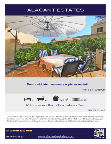 Dom z widokiem na morze w pierwszej linii Ref: CB11005590R 3 2 125 m² 50 m² Widok na morze - Basen - Taras na dachu - Taras EUR 239.000,00 € Townhouse in Gran Alacant.In the sought after first line area El Faro, a mere 15 minutes drive from Alicante airport this townhouse is now for sale.With sea views and views to Alicante the property offers 3 bedrooms, 2 bathrooms, lounge, open kitchen and lovely roof terrace with fantastic views.In the gated urbanisation you find tennis courts and an ample pool area.... Powered by TCPDF (www.tcpdf.org)