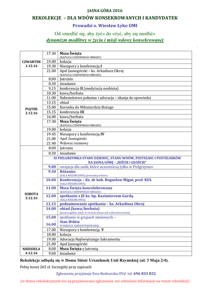 JASNA GÓRA 2016 REKOLEKCJE – DLA WDÓW KONSEKROWANYCH I KANDYDATEK Prowadzi o. Wiesław Łyko OMI Od «modlić się, aby żyć» do «żyć, aby się modlić» dynamizm modlitwy w życiu i misji wdowy konsekrowanej . 17.30 Msza Święta (KAPLICA CUDOWNEGO OBRAZU) CZWARTEK 1.12.16 19.00 kolacja 19.30 Nieszpory z konferencją I 21.00 Apel Jasnogórski – ks. Arkadiusz Okroj (KAPLICA CUDOWNEGO OBRAZU) PIĄTEK 2.12.16 8.00 8.30 9.15 10.30 11.00 13.15 15.00 15.15 16.00 17.30 Jutrznia śniadanie konferencja II (medytacja osobista) kawa/herbata Nabożeństwo pokutne i adoracja – okazja do spowiedzi obiad Koronka do Miłosierdzia Bożego konferencja III kawa/herbata Msza Święta (KAPLICA CUDOWNEGO OBRAZU) 19.00 19.45 21.00 21.40 8.00 8.30 kolacja Nieszpory z konferencją IV Apel Jasnogórski Wdowie rozmowy Jutrznia śniadanie XI PIELGRZYMKA STANU DZIEWIC, STANU WDÓW, PUSTELNIC I PUSTELNIKÓW NA JASNĄ GÓRĘ - „IDŹCIE i GŁOŚCIE” 9.00 recepcja dla osób, które uczestniczą tylko w Pielgrzymce 9.30 Różaniec (SALA RÓŻAŃCOWA) prowadzą wdowy 10.00 Konferencja – Ks. dr hab. Bogusław Migut, prof. KUL (SALA RÓŻAŃCOWA) 11.00 Msza Święta koncelebrowana SOBOTA 3.12.16 (KAPLICA CUDOWNEGO OBRAZU) 12.00 spotkanie z JE ks. bp. Kazimierzem Gurdą (SALA RÓŻAŃCOWA) 13.15 podsumowanie spotkania – ks. Arkadiusz Okroj 14.00 obiad (kawa/herbata) (poszczególne stany w swoich miejscach zakwaterowania) NIEDZIELA 4.12.16 15.00 spotkanie w grupach stanowych – – Stan Wdów 16.00 W MIEJSCU ZAKWATEROWANIA 17.00 Nieszpory z konferencją V 18.00 kolacja 19.00 Adoracja Najświętszego Sakramentu 21.00 Apel Jasnogórski 8.00 Msza Święta z Jutrznią 9.00 śniadanie Rekolekcje odbędą się w Domu Sióstr Urszulanek Unii Rzymskiej (ul. 3 Maja 2/4). Pełny koszt 265 zł. Szczegóły przy zapisach Zgłoszenia przyjmuje Ewa Bednarska OVd tel. 696 833 832 (w domu rekolekcyjnym nie są przyjmowane zgłoszenia, ani udzielane informacje na temat rekolekcji)