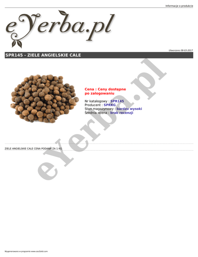 Informacje o produkcie Utworzono 08-03-2017 a. pl SPR145 - ZIELE ANGIELSKIE CALE Cena : Ceny dostępne po zalogowaniu er b Nr katalogowy : SPR145 Producent : SPRKG Stan magazynowy : bardzo wysoki Średnia ocena : brak recenzji eY ZIELE ANGIELSKIE CALE CENA PODANA ZA 1 KG Wygenerowano w programie www.oscGold.com