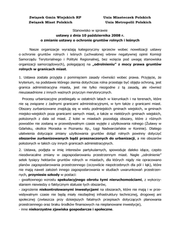 Związek Gmin Wiejskich RP Związek Miast Polskich Unia Miasteczek Polskich Unia Metropolii Polskich Stanowisko w sprawie ustawy z dnia 10 października 2008 r. o zmianie ustawy o ochronie gruntów rolnych i leśnych Nasze organizacje wyrażają kategoryczny sprzeciw wobec nowelizacji ustawy o ochronie gruntów rolnych i leśnych (uchwalonej wbrew negatywnej opinii Komisji Samorządu Terytorialnego i Polityki Regionalnej, bez wzięcia pod uwagę stanowiska organizacji samorządowych), polegającej na „odrolnieniu” z mocy prawa gruntów rolnych w granicach miast. 1. Ustawa została przyjęta z pominięciem zasady równości wobec prawa. Przyjęcie, że kryterium, na podstawie którego ziemia dotychczas rolna przestaje być objęta ochroną, jest granica administracyjna miasta, jest nie tylko niezgodne z tą zasadą, ale również nieuzasadnione z innych ważnych przyczyn merytorycznych. Procesy urbanizacyjne przebiegały w ostatnich latach w kierunkach i na terenach, które nie są związane z żadnymi granicami administracyjnymi, w tym także z granicami miast. Obszary zurbanizowane znajdują się w wielu podmiejskich gminach wiejskich, w gminach miejsko-wiejskich poza granicami samych miast, a także w niektórych gminach wiejskich, położonych z dala od miast. Z kolei w miastach pozostają obszary, które z różnych powodów nie zostaną w przewidywalnym czasie wyjęte z użytkowania rolnego (Żuławy w Gdańsku, okolice Moraska w Poznaniu itp., Łęgi Nadwarciańskie w Koninie). Dlatego ułatwienia dotyczące zmiany użytkowania gruntów dotąd rolnych powinny dotyczyć obszarów zurbanizowanych bądź przeznaczonych do urbanizacji, a nie obszarów położonych w takich czy innych granicach administracyjnych. 2. Ustawa, podjęta w imię interesów partykularnych, spowoduje daleko idące, często nieodwracalne zmiany w zagospodarowaniu przestrzennym miast. Nagłe „odrolnienie” setek tysięcy hektarów gruntów rolnych w miastach, dla których nigdy nie opracowano planów zagospodarowania przestrzennego (oczywiście niepotrzebnych dla pól i łąk), które nie mają nawet założeń innego zagospodarowania w studiach uwarunkowań przestrzennych, przyniesie szkody w postaci: - gwałtownego wzrostu spekulacyjnego obrotu tymi nieruchomościami, z wykorzystaniem niewiedzy o faktycznym statusie tych obszarów, - zagrożenie niekontrolowanymi inwestycjami na obszarach, które nie mają i w przewidywalnym czasie nie będą miały niezbędnej infrastruktury technicznej, drogowej ani społecznej (zwłaszcza przy dzisiejszych fatalnych przepisach dotyczących planowania przestrzennego oraz braku środków finansowych na nieplanowane inwestycje), - inne niekorzystne zjawiska gospodarcze i społeczne. 3. Nasze organizacje od lat domagały się ułatwienia zmiany przeznaczenia gruntów rolnych na obszarach zurbanizowanych lub przeznaczonych do urbanizacji. Zasadnicza treść naszego postulatu polegała jednak na tym, by aktem prawnym, sankcjonującym „odrolnienie”, był miejscowy plan zagospodarowania przestrzennego. Ten akt prawa miejscowego: - określa nowe możliwości zagospodarowania gruntów objętych planem, - określa uwarunkowania środowiskowe dla danego obszaru, - konkretyzuje zakres i horyzont czasowy uzbrojenia terenu, - wyznacza obszary niezbędne dla realizacji na danym obszarze innych funkcji (drogi, przestrzenie publiczne, infrastruktura społeczna, obszary handlu, usług i innej obsługi mieszkańców. Wszystkie te ustalenia winny być poprzedzone stosownymi zmianami w studiach, umożliwiającymi ustanowienie powiązań tych obszarów z innymi częściami miasta lub gminy. 4. Wejście w życie ustawy powoduje zdecydowane zmniejszenie wpływu środków za odrolnienie do funduszu ochrony gruntów rolnych. Z tego funduszu gminy wiejskie od wielu lat dofinansowują budowę dróg dojazdowych do pól rolniczych. Warszawa, 4 listopada 2008 r. Paweł ADAMOWICZ Witold KROCHMAL Mariusz POZNAŃSKI Unia Metropolii Polskich Unia Miasteczek Polskich Związek Gmin Wiejskich RP Ryszard GROBELNY Związek Miast Polskich