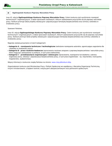 Powiatowy Urząd Pracy w Katowicach http://pup.katowice.pl/wydarzenie/250/ogolnopolski-konkurs-poprawy-warunkow-pracy Ogólnopolski Konkurs Poprawy Warunków Pracy trwa 43. edycja Ogólnopolskiego Konkursu Poprawy Warunków Pracy. Celem konkursu jest wyróżnianie rozwiązań technicznych i organizacyjnych, a także opracowań naukowych, których zastosowanie przyczyniło się do poprawy warunków pracy. Konkurs promuje także projekty edukacyjne i popularyzujące tematykę bezpieczeństwa oraz ochrony człowieka w środowisku pracy. Szanowni Państwo, trwa 43. edycja Ogólnopolskiego Konkursu Poprawy Warunków Pracy. Celem konkursu jest wyróżnianie rozwiązań technicznych i organizacyjnych, a także opracowań naukowych, których zastosowanie przyczyniło się do poprawy warunków pracy. Konkurs promuje także projekty edukacyjne i popularyzujące tematykę bezpieczeństwa oraz ochrony człowieka w środowisku pracy. Nagrody zostaną przyznane w trzech kategoriach: ● ● ● kategoria A – rozwiązania techniczne i technologiczne (wdrożone rozwiązania autorskie, ograniczające zagrożenia dla człowieka w środowisku pracy), kategoria B – prace naukowo-badawcze (opracowania naukowe związane z poprawą bezpieczeństwa i warunków pracy, które mogą być zastosowane w praktyce, w tym prace doktorskie), kategoria C – przedsięwzięcia organizacyjne i edukacyjne (opracowania, rozwiązania lub działania z zakresu organizacji pracy, edukacji i popularyzacji bezpieczeństwa pracy, w tym prace dyplomowe – np. inżynierskie, licencjackie, magisterskie, wydawnictwa). Więcej informacji o konkursie znajdą Państwo na stronie: www.ciop.pl/konkurs-bhp. Organizatorem konkursu jest Ministerstwo Pracy i Polityki Społecznej we współpracy z Naczelną Organizacją Techniczną, innymi ministerstwami, urzędami kontroli, instytucjami ubezpieczeniowymi oraz partnerami społecznymi.
