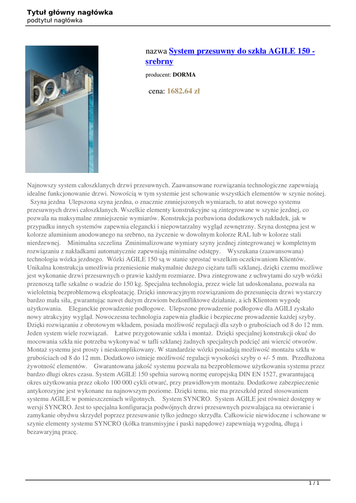Tytuł główny nagłówka podtytuł nagłówka nazwa System przesuwny do szkła AGILE 150 srebrny producent: DORMA cena: 1682.64 zł Najnowszy system całoszklanych drzwi przesuwnych. Zaawansowane rozwiązania technologiczne zapewniają idealne funkcjonowanie drzwi. Nowością w tym systemie jest schowanie wszystkich elementów w szynie nośnej. Szyna jezdna Ulepszona szyna jezdna, o znacznie zmniejszonych wymiarach, to atut nowego systemu przesuwnych drzwi całoszklanych. Wszelkie elementy konstrukcyjne są zintegrowane w szynie jezdnej, co pozwala na maksymalne zmniejszenie wymiarów. Konstrukcja pozbawiona dodatkowych nakładek, jak w przypadku innych systemów zapewnia elegancki i niepowtarzalny wygląd zewnętrzny. Szyna dostępna jest w kolorze aluminium anodowanego na srebrno, na życzenie w dowolnym kolorze RAL lub w kolorze stali nierdzewnej. Minimalna szczelina Zminimalizowane wymiary szyny jezdnej zintegrowanej w kompletnym rozwiązaniu z nakładkami automatycznie zapewniają minimalne odstępy. Wyszukana (zaawansowana) technologia wózka jezdnego. Wózki AGILE 150 są w stanie sprostać wszelkim oczekiwaniom Klientów. Unikalna konstrukcja umożliwia przeniesienie makymalnie dużego ciężaru tafli szklanej, dzięki czemu możliwe jest wykonanie drzwi przesuwnych o prawie każdym rozmiarze. Dwa zintegrowane z uchwytami do szyb wózki przenoszą tafle szkalne o wadzie do 150 kg. Specjalna technologia, przez wiele lat udoskonalana, pozwala na wieloletnią bezproblemową eksploatację. Dzięki innowacyjnym rozwiązaniom do przesunięcia drzwi wystarczy bardzo mała siła, gwarantując nawet dużym drzwiom bezkonfliktowe działanie, a ich Klientom wygodę użytkowania. Eleganckie prowadzenie podłogowe. Ulepszone prowadzenie podłogowe dla AGILI zyskało nowy atrakcyjny wygląd. Nowoczesna technologia zapewnia gładkie i bezpieczne prowadzenie każdej szyby. Dzięki rozwiązaniu z obrotowym wkładem, posiada możliwość regulacji dla szyb o grubościach od 8 do 12 mm. Jeden system wiele rozwiązań. Łatwe przygotowanie szkła i montaż. Dzięki specjalnej konstrukcji okuć do mocowania szkła nie potrzeba wykonywać w tafli szklanej żadnych specjalnych podcięć ani wiercić otworów. Montaż systemu jest prosty i nieskomplikowany. W standardzie wózki posiadają możliwość montażu szkła w grubościach od 8 do 12 mm. Dodatkowo istnieje możliwość regulacji wysokości szyby o +/- 5 mm. Przedłużona żywotność elementów. Gwarantowana jakość systemu pozwala na bezproblemowe użytkowania systemu przez bardzo długi okres czasu. System AGILE 150 spełnia surową normę europejską DIN EN 1527, gwarantującą okres użytkowania przez około 100 000 cykli otwarć, przy prawidłowym montażu. Dodatkowe zabezpieczenie antykorozyjne jest wykonane na najnowszym poziome. Dzięki temu, nie ma przeszkód przed stosowaniem systemu AGILE w pomieszczeniach wilgotnych. System SYNCRO. System AGILE jest również dostępny w wersji SYNCRO. Jest to specjalna konfiguracja podwójnych drzwi przesuwnych pozwalająca na otwieranie i zamykanie obydwu skrzydeł poprzez przesuwanie tylko jednego skrzydła. Całkowicie niewidoczne i schowane w szynie elementy systemu SYNCRO (kółka transmisyjne i paski napędowe) zapewniają wygodną, długą i bezawaryjną pracę. 1/1