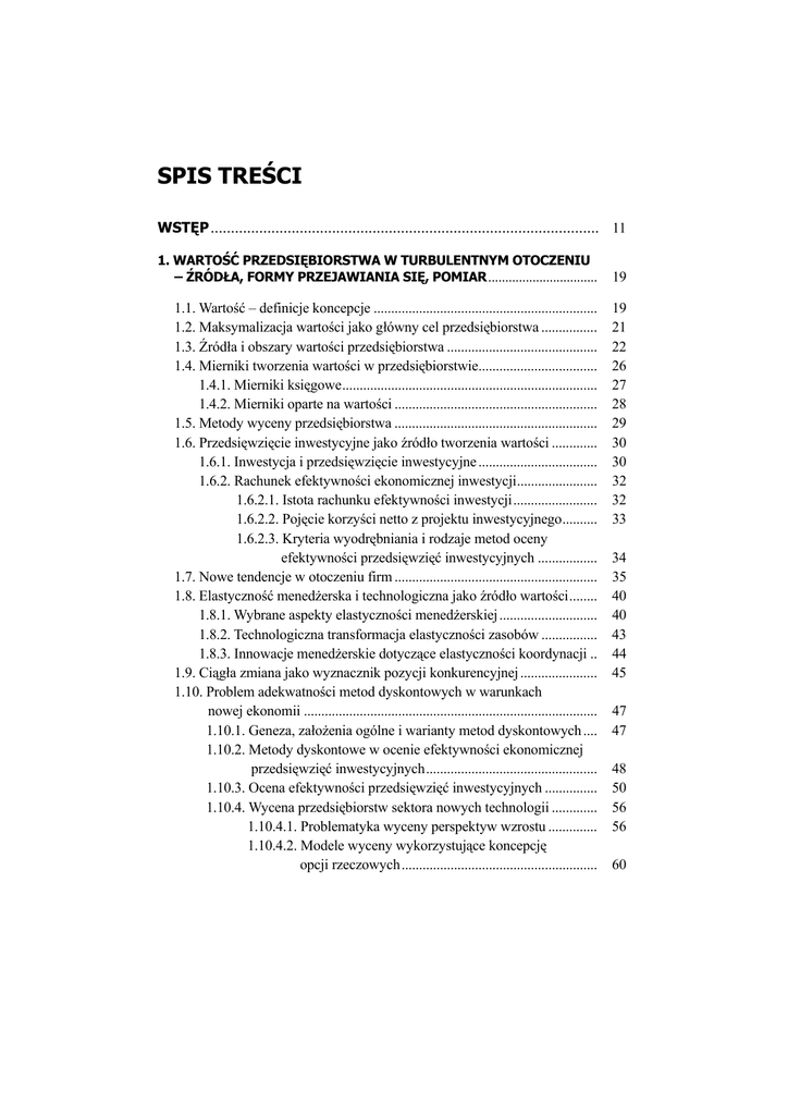 SPIS TREŚCI WSTĘP ................................................................................................ 11 1. WARTOŚĆ PRZEDSIĘBIORSTWA W TURBULENTNYM OTOCZENIU – ŹRÓDŁA, FORMY PRZEJAWIANIA SIĘ, POMIAR ................................ 1.1. Wartość – definicje koncepcje ................................................................ 1.2. Maksymalizacja wartości jako główny cel przedsiębiorstwa ................ 1.3. Źródła i obszary wartości przedsiębiorstwa ........................................... 1.4. Mierniki tworzenia wartości w przedsiębiorstwie.................................. 1.4.1. Mierniki księgowe ......................................................................... 1.4.2. Mierniki oparte na wartości .......................................................... 1.5. Metody wyceny przedsiębiorstwa .......................................................... 1.6. Przedsięwzięcie inwestycyjne jako źródło tworzenia wartości ............. 1.6.1. Inwestycja i przedsięwzięcie inwestycyjne .................................. 1.6.2. Rachunek efektywności ekonomicznej inwestycji....................... 1.6.2.1. Istota rachunku efektywności inwestycji ........................ 1.6.2.2. Pojęcie korzyści netto z projektu inwestycyjnego.......... 1.6.2.3. Kryteria wyodrębniania i rodzaje metod oceny efektywności przedsięwzięć inwestycyjnych ................. 1.7. Nowe tendencje w otoczeniu firm .......................................................... 1.8. Elastyczność menedżerska i technologiczna jako źródło wartości ........ 1.8.1. Wybrane aspekty elastyczności menedżerskiej ............................ 1.8.2. Technologiczna transformacja elastyczności zasobów ................ 1.8.3. Innowacje menedżerskie dotyczące elastyczności koordynacji .. 1.9. Ciągła zmiana jako wyznacznik pozycji konkurencyjnej ...................... 1.10. Problem adekwatności metod dyskontowych w warunkach nowej ekonomii .................................................................................... 1.10.1. Geneza, założenia ogólne i warianty metod dyskontowych .... 1.10.2. Metody dyskontowe w ocenie efektywności ekonomicznej przedsięwzięć inwestycyjnych ................................................. 1.10.3. Ocena efektywności przedsięwzięć inwestycyjnych ............... 1.10.4. Wycena przedsiębiorstw sektora nowych technologii ............. 1.10.4.1. Problematyka wyceny perspektyw wzrostu .............. 1.10.4.2. Modele wyceny wykorzystujące koncepcję opcji rzeczowych ........................................................ 19 19 21 22 26 27 28 29 30 30 32 32 33 34 35 40 40 43 44 45 47 47 48 50 56 56 60 2. OPCJE − DEFINICJE, RODZAJE, WYCENA ............................................... 68 2.1. Pojęcie i rodzaje opcji................................................................................ 2.1.1. Definicje terminu „opcja” .............................................................. 2.1.2. Geneza stosunku prawnego opcji .................................................. 2.1.3. Opcje − ustalenia terminologiczne ................................................ 2.1.4. Aspekty prawne problematyki opcji .............................................. 2.1.5. Rodzaje opcji w życiu gospodarczym ........................................... 2.1.6. Rodzaje opcji finansowych ............................................................ 2.2. Wycena opcji finansowych........................................................................ 2.2.1. Czynniki wpływające na wartość opcji ......................................... 2.2.2. Wycena opcji w czasie dyskretnym ............................................... 2.2.2.1. Ogólne zagadnienia wyceny ............................................ 2.2.2.2. Wycena opcji europejskiej za pomocą portfela bez ryzyka ........................................................................ 2.2.2.2.1 Jednookresowy model dwumianowy .............. 2.2.2.2.2. Wielookresowy model dwumianowy ............ 2.2.2.3. Wycena europejskiej opcji kupna za pomocą portfela replikującego ................................................................... 2.2.2.4. Wycena amerykańskiej opcji sprzedaży .......................... 2.2.3. Wycena opcji w czasie ciągłym ..................................................... 2.2.3.1. Procesy stochastyczne ...................................................... 2.2.3.1.1. Proces Wienera i uogólniony proces Wienera .. 2.2.3.1.2. Proces stochastyczny zmiany ceny akcji ....... 2.2.3.2. Model Blacka-Scholesa ................................................... 2.2.4. Zupełność modelu rynku finansowego ......................................... 68 68 70 71 72 73 74 75 75 77 77 79 79 83 86 87 88 88 88 90 91 94 3. OPCJE RZECZOWE − GENEZA, TYPOLOGIA, ANALOGIE DO OPCJI FINANSOWYCH ................................................................................................ 95 3.1. Geneza i definicje ................................................................................ 3.2. Opcje rzeczowe – rozwój koncepcji .................................................... 3.3. Opcja rzeczowa jako koncepcja wyceny elastyczności menedżerskiej ... 3.4 Typologia opcji rzeczowych ................................................................. 3.4.1. Opcja opóźnienia ...................................................................... 3.4.2. Opcja rezygnacji ....................................................................... 3.4.3. Opcja zmiany skali działania .................................................... 3.4.4. Opcja przełączenia .................................................................... 3.4.5. Opcja podziału na etapy ........................................................... 3.4.6. Opcja wzrostu ........................................................................... 95 97 100 105 106 108 110 111 113 114 3.4.7. Alternatywn