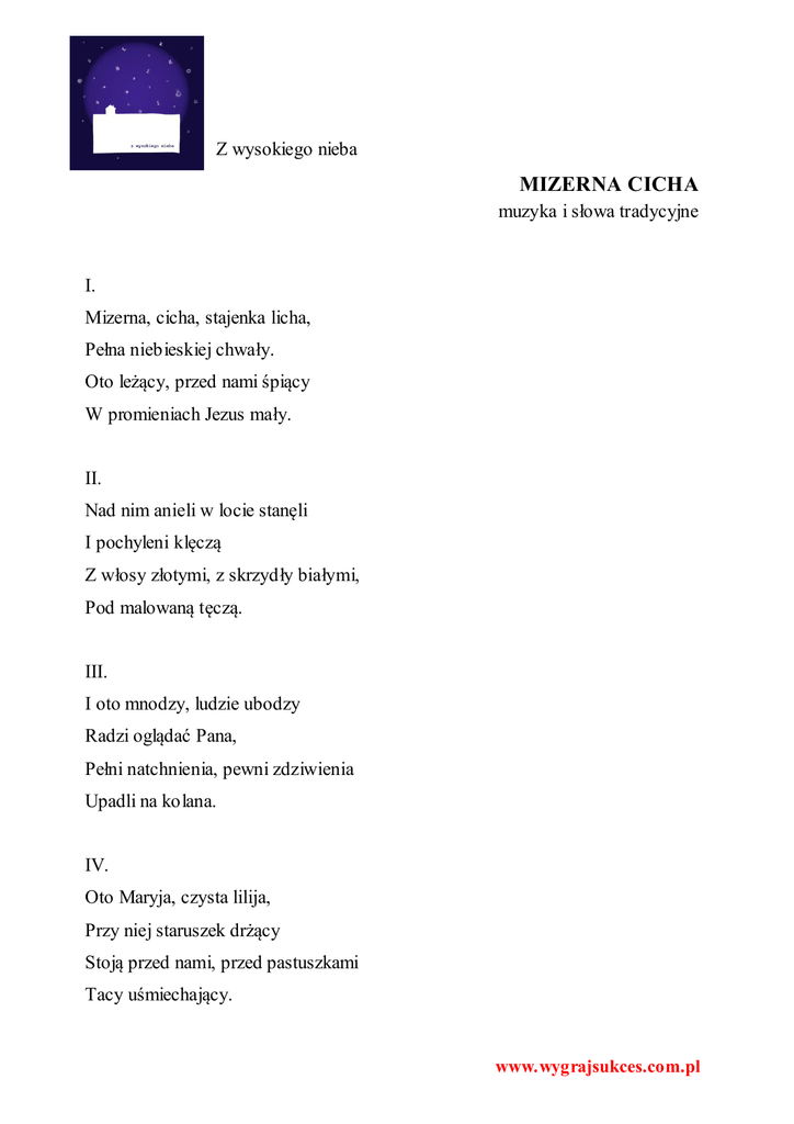 Z wysokiego nieba MIZERNA CICHA muzyka i słowa tradycyjne I. Mizerna, cicha, stajenka licha, Pełna niebieskiej chwały. Oto leżący, przed nami śpiący W promieniach Jezus mały. II. Nad nim anieli w locie stanęli I pochyleni klęczą Z włosy złotymi, z skrzydły białymi, Pod malowaną tęczą. III. I oto mnodzy, ludzie ubodzy Radzi oglądać Pana, Pełni natchnienia, pewni zdziwienia Upadli na kolana. IV. Oto Maryja, czysta lilija, Przy niej staruszek drżący Stoją przed nami, przed pastuszkami Tacy uśmiechający. www.wygrajsukces.com.pl