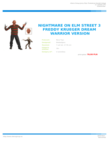 Aliens Group Jerzy Stec Produkcja-Handel-Usługi ul. Lipowa 17C Inowrocław NIGHTMARE ON ELM STREET 3 FREDDY KRUEGER DREAM WARRIOR VERSION Producent: Neca Toys Dostępność: Niedostępny Wysokość: 7 cali (ok. 17,78 cm) Kategoria wiekowa: 18+ Dostępny od*: w sprzedaży price gross: http://www.aliensgroup.eu 70,00 PLN generator: aptusshop