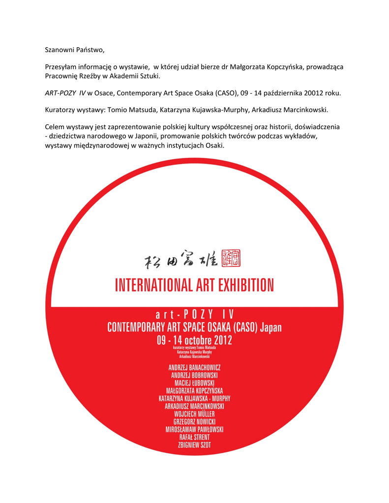 Szanowni Państwo, Przesyłam informację o wystawie, w której udział bierze dr Małgorzata Kopczyńska, prowadząca Pracownię Rzeźby w Akademii Sztuki. ART-‐POZY IV w Osace, Contemporary Art Space Osaka (CASO), 09 -‐ 14 października 20012 roku. Kuratorzy wystawy: Tomio Matsuda, Katarzyna Kujawska-‐Murphy, Arkadiusz Marcinkowski. Celem wystawy jest zaprezentowanie polskiej kultury współczesnej oraz historii, doświadczenia -‐ dziedzictwa narodowego w Japonii, promowanie polskich twórców podczas wykładów, wystawy międzynarodowej w ważnych instytucjach Osaki.