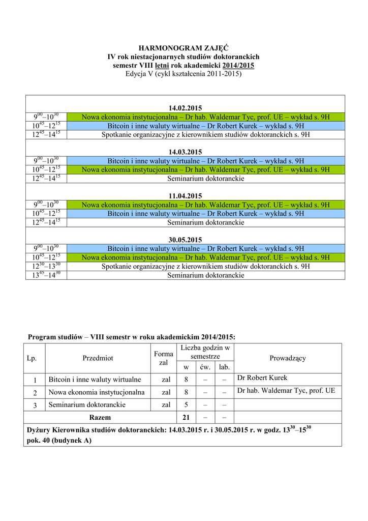 HARMONOGRAM ZAJĘĆ IV rok niestacjonarnych studiów doktoranckich semestr VIII letni rok akademicki 2014/2015 Edycja V (cykl kształcenia 2011-2015) 00 30 00 30 9 –10 1045–1215 1245–1415 14.02.2015 Nowa ekonomia instytucjonalna – Dr hab. Waldemar Tyc, prof. UE – wykład s. 9H Bitcoin i inne waluty wirtualne – Dr Robert Kurek – wykład s. 9H Spotkanie organizacyjne z kierownikiem studiów doktoranckich s. 9H 9 –10 1045–1215 1245–1415 14.03.2015 Bitcoin i inne waluty wirtualne – Dr Robert Kurek – wykład s. 9H Nowa ekonomia instytucjonalna – Dr hab. Waldemar Tyc, prof. UE – wykład s. 9H Seminarium doktoranckie 900–1030 1045–1215 1245–1415 11.04.2015 Nowa ekonomia instytucjonalna – Dr hab. Waldemar Tyc, prof. UE – wykład s. 9H Bitcoin i inne waluty wirtualne – Dr Robert Kurek – wykład s. 9H Seminarium doktoranckie 00 30 9 –10 1045–1215 1230–1330 1345–1430 30.05.2015 Bitcoin i inne waluty wirtualne – Dr Robert Kurek – wykład s. 9H Nowa ekonomia instytucjonalna – Dr hab. Waldemar Tyc, prof. UE – wykład s. 9H Spotkanie organizacyjne z kierownikiem studiów doktoranckich s. 9H Seminarium doktoranckie Program studiów – VIII semestr w roku akademickim 2014/2015: Liczba godzin w Forma semestrze Lp. Przedmiot zal w ćw. lab. Prowadzący 1 Bitcoin i inne waluty wirtualne zal 8 – – Dr Robert Kurek 2 Nowa ekonomia instytucjonalna zal 8 – – Dr hab. Waldemar Tyc, prof. UE 3 Seminarium doktoranckie zal 5 – – 21 – – Razem Dyżury Kierownika studiów doktoranckich: 14.03.2015 r. i 30.05.2015 r. w godz. 1330–1530 pok. 40 (budynek A)