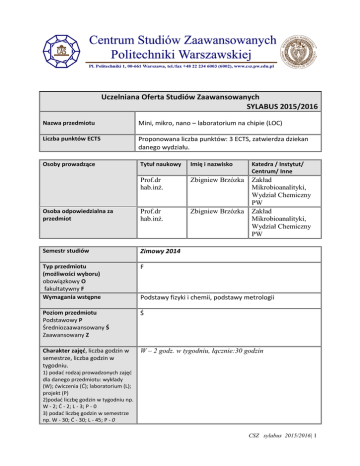 Uczelniana Oferta Studiów Zaawansowanych SYLABUS 2015/2016 Nazwa przedmiotu Mini, mikro, nano – laboratorium na chipie (LOC) Liczba punktów ECTS Proponowana liczba punktów: 3 ECTS, zatwierdza dziekan danego wydziału. Osoby prowadzące Tytuł naukowy Imię i nazwisko Katedra / Instytut/ Centrum/ Inne Prof.dr hab.inż. Zbigniew Brzózka Osoba odpowiedzialna za przedmiot Prof.dr hab.inż. Zbigniew Brzózka Zakład Mikrobioanalityki, Wydział Chemiczny PW Zakład Mikrobioanalityki, Wydział Chemiczny PW Semestr studiów Zimowy 2014 Typ przedmiotu (możliwości wyboru) obowiązkowy O fakultatywny F Wymagania wstępne F Poziom przedmiotu Podstawowy P Średniozaawansowany Ś Zaawansowany Z Ś Charakter zajęć, liczba godzin w semestrze, liczba godzin w tygodniu. W – 2 godz. w tygodniu, łącznie:30 godzin Podstawy fizyki i chemii, podstawy metrologii 1) podać rodzaj prowadzonych zajęć dla danego przedmiotu: wykłady (W); ćwiczenia (Ć); laboratorium (L); projekt (P) 2)podać liczbę godzin w tygodniu np. W - 2; Ć - 2; L - 3; P - 0 3) podać liczbę godzin w semestrze np. W - 30; Ć - 30; L - 45; P - 0 CSZ sylabus 2015/2016| 1 Sugerowana liczba godzin pracy własnej Całkowita liczba godzin: Aspekty międzynarodowe (jeśli są) Język wykładowy 45 godzin obejmuje : 30 godzin przygotowywanie się słuchacza do wykładów, 15 – przygotowywanie się słuchacza do egzaminu. 75 godzin polski Cel przedmiotu Opis zakładanych kompetencji i umiejętności, jakie student nabywa w wyniku zaliczenia przedmiotu. Uwaga: maksymalna objętość tekstu to 3 linie standardowej strony A4 Po ukończeniu kursu student powinien: • mieć ogólną wiedzę teoretyczną na temat miniaturowych systemów chemicznych „Lab-on-Chip”, które umożliwiają wieloskładnikową analizę i badania bardzo małych próbek chemicznych i biologicznych, • na podstawie dostępnych źródeł literaturowych i internetowych zapoznać się samodzielnie z wybranym zagadnieniem, • przygotować i wygłosić prezentację dla uczestników kursu, której uzupełnieniem będzie krótka dyskusja z udziałem słuchaczy i prowadzącego. Treść przedmiotu Patrz abstrakt na stronie internetowej CSZ PW, wykłady podstawowe, link przy tytule wykładów Spis zalecanych lektur LP. 1. Autor, Tytuł, Wydawnictwo, 2. Praca zbiorowa, red. Zbigniew Brzózka, Mikrobioanalityka, Oficyna Wydawnicza PW, 2009 Praca zbiorowa, red. Zbigniew Brzózka, Miniaturyzacja w analityce, Oficyna Wydawnicza PW, 2005 3. 4. Metody oceny Ocena na podstawie egzaminu testowego. Wystawiane jedynie oceny za zaliczenie przedmiotu. Uwagi dodatkowe Zajęcia odbędą się, jeżeli zapisze się co najmniej 20 osób. ( ocena, egz. pisemny, egz. ustny, projekt) CSZ sylabus 2015/2016| 2 Tabela 1. Efekty kształcenia Numer (symbol) Efekty kształcenia słuchacza, który zaliczył przedmiot, potrafi WIEDZA LOC_W1 LOC_W2 Sposób weryfikacji osiągnięcia efektu zna podstawowe zagadnienia i metody prowadzenia Egzamin operacji jednostkowych w mikroskali, specyfikę materiałów biologicznych jako próbek poddawanych badaniom i analizom zna najważniejsze materiały i metody stosowane do Egzamin projektowania oraz wytwarzania miniaturowych systemów analitycznych „Lab-on-Chip”, włączając w to ogólną znajomość budowy i zasady działania miniaturowych struktur przepływowych UMIEJĘTNOŚCI LOC_U1 LOC_U2 posiada umiejętność korzystania ze źródeł literaturowych Egzamin oraz zasobów internetowych dotyczących rozwiązywanego zadania potrafi przygotować i przedstawić ustną prezentację z Egzamin zakresu studiowanego zagadnienia KOMPETENCJE LOC_K1 LOC_K2 LOC_K3 Rozumie konieczność dalszego samokształcenia Obserwacja na zajęciach, egzamin Rozumie znaczenie metod interdyscyplinarnych w Obserwacja na nauce zajęciach. potrafi pracować samodzielnie i kreatywnie, ze Obserwacja na świadomością przestrzegania zasad bioetyki i zajęciach, poszanowania praw autorskich. egzamin CSZ sylabus 2015/2016| 3