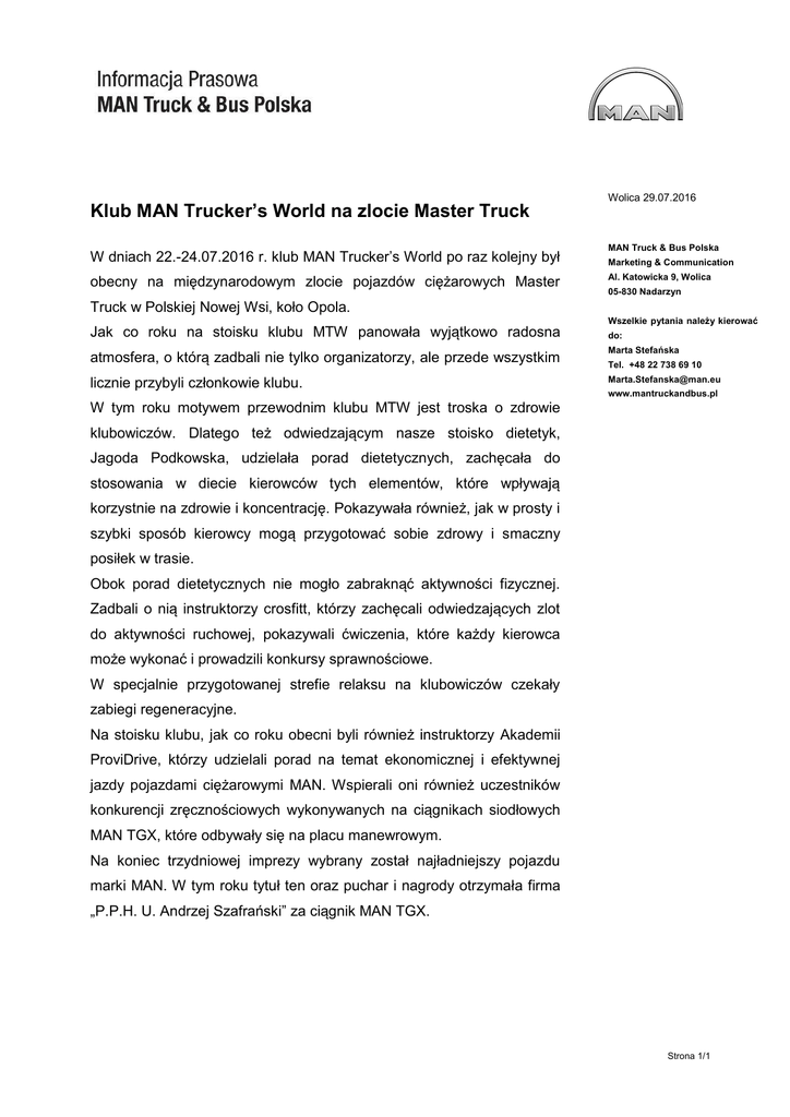 Klub MAN Trucker’s World na zlocie Master Truck Wolica 29.07.2016 W dniach 22.-24.07.2016 r. klub MAN Trucker’s World po raz kolejny był MAN Truck & Bus Polska obecny na międzynarodowym zlocie pojazdów ciężarowych Master Al. Katowicka 9, Wolica Marketing & Communication 05-830 Nadarzyn Truck w Polskiej Nowej Wsi, koło Opola. Jak co roku na stoisku klubu MTW panowała wyjątkowo radosna Wszelkie pytania należy kierować do: atmosfera, o którą zadbali nie tylko organizatorzy, ale przede wszystkim Marta Stefańska licznie przybyli członkowie klubu. [email protected] Tel. +48 22 738 69 10 www.mantruckandbus.pl W tym roku motywem przewodnim klubu MTW jest troska o zdrowie klubowiczów. Dlatego też odwiedzającym nasze stoisko dietetyk, Jagoda Podkowska, udzielała porad dietetycznych, zachęcała do stosowania w diecie kierowców tych elementów, które wpływają korzystnie na zdrowie i koncentrację. Pokazywała również, jak w prosty i szybki sposób kierowcy mogą przygotować sobie zdrowy i smaczny posiłek w trasie. Obok porad dietetycznych nie mogło zabraknąć aktywności fizycznej. Zadbali o nią instruktorzy crosfitt, którzy zachęcali odwiedzających zlot do aktywności ruchowej, pokazywali ćwiczenia, które każdy kierowca może wykonać i prowadzili konkursy sprawnościowe. W specjalnie przygotowanej strefie relaksu na klubowiczów czekały zabiegi regeneracyjne. Na stoisku klubu, jak co roku obecni byli również instruktorzy Akademii ProviDrive, którzy udzielali porad na temat ekonomicznej i efektywnej jazdy pojazdami ciężarowymi MAN. Wspierali oni również uczestników konkurencji zręcznościowych wykonywanych na ciągnikach siodłowych MAN TGX, które odbywały się na placu manewrowym. Na koniec trzydniowej imprezy wybrany został najładniejszy pojazdu marki MAN. W tym roku tytuł ten oraz puchar i nagrody otrzymała firma „P.P.H. U. Andrzej Szafrański” za ciągnik MAN TGX. Strona 1/1