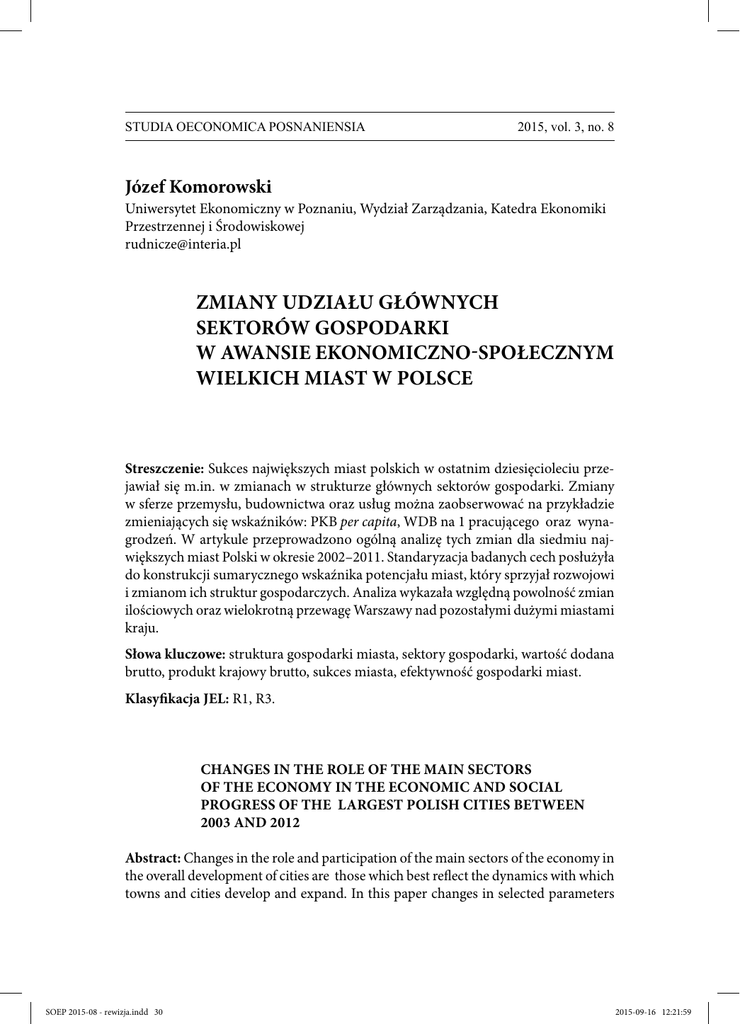 STUDIA OECONOMICA POSNANIENSIA 2015, vol. 3, no. 8 Józef Komorowski Uniwersytet Ekonomiczny w Poznaniu, Wydział Zarządzania, Katedra Ekonomiki Przestrzennej i Środowiskowej [email protected] ZMIANY UDZIAŁU GŁÓWNYCH SEKTORÓW GOSPODARKI W AWANSIE EKONOMICZNOSPOŁECZNYM WIELKICH MIAST W POLSCE Streszczenie: Sukces największych miast polskich w ostatnim dziesięcioleciu przejawiał się m.in. w zmianach w strukturze głównych sektorów gospodarki. Zmiany w sferze przemysłu, budownictwa oraz usług można zaobserwować na przykładzie zmieniających się wskaźników: PKB per capita, WDB na 1 pracującego oraz wynagrodzeń. W artykule przeprowadzono ogólną analizę tych zmian dla siedmiu największych miast Polski w okresie 2002–2011. Standaryzacja badanych cech posłużyła do konstrukcji sumarycznego wskaźnika potencjału miast, który sprzyjał rozwojowi i zmianom ich struktur gospodarczych. Analiza wykazała względną powolność zmian ilościowych oraz wielokrotną przewagę Warszawy nad pozostałymi dużymi miastami kraju. Słowa kluczowe: struktura gospodarki miasta, sektory gospodarki, wartość dodana brutto, produkt krajowy brutto, sukces miasta, efektywność gospodarki miast. Klasyfikacja JEL: R1, R3. CHANGES IN THE ROLE OF THE MAIN SECTORS OF THE ECONOMY IN THE ECONOMIC AND SOCIAL PROGRESS OF THE LARGEST POLISH CITIES BETWEEN 2003 AND 2012 Abstract: Changes in the role and participation of the main sectors of the economy in the overall development of cities are those which best reflect the dynamics with which towns and cities develop and expand. In this paper changes in selected parameters SOEP 2015-08 - rewizja.indd 30 2015-09-16 12:21:59 Zmiany udziału głównych sektorów gospodarki w awansie ekonomiczno-społecznym 31 indicating the basic effects of the: man – economy relationship, i.e. the total number of employed, GVA, GNP and salaries are analyzed. The analysis covers the 7 largest Polish cities in the years 2002–2011. The summary shows that the analyzed cities have very different potentials that are conducive to positive changes in the economic structure and success. Keywords: city economic structure, main sectors of the economy, value added, value added per employee, gross domestic product, success of the city, effectiveness of the city economy. Wstęp Popularność badań nad wielkimi miastami jest współcześnie uzasadniona. Dotychczasowa dynamika i przyszłość rozwoju przestrzeni zarówno na poziomie regionalnym, krajowym, jak i globalnym należy do miast, zwłaszcza wielkich1. Zmieniająca się w czasie siła ich oddziaływania oraz pozycja była i jest zależna od wielu czynników o cechach stabilnych i niestabilnych oraz od negatywnych bądź pozytywnych efektów emitowanych w wyniku ich funkcjonowania. W miastach skupiają się i nadal będą się koncentrować te działalności, które w coraz szybszym tempie będą rozwijane nie tylko w sensie ilościowym, ale przede wszystkim jakościowym w nowoczesnym przemyśle i szeroko rozumianych usługach. Przedstawione zagadnienie nawiązuje pośrednio do problemu odporności gospodarki miast na zjawiska negatywne i szoki wynikające z istniejących i zmieniających się w czasie ich podstawowych struktur gospodarczych, tj. udziału głównych sektorów: (przemysłu i budownictwa (P+B) oraz usług (U) w tworzeniu produktu krajowego brutto (PKB) oraz wartości dodanej brutto (WDB). W zmieniających się konfiguracjach udziału w strukturach gospodarczych sektory te kształtują i wyznaczają de facto kierunki rozwojowe miast, czyniąc je w różnym stopniu zdolnymi do dynamicznego konkurowania na rynku miast i osiągania sukcesu2. 1 W artykule używa się zamiennie terminu wielkie lub duże miasta, a także metropolie polskie ze świadomością, iż terminy te nie są tożsame, odpowiadają różnym kryteriom dotyczącym m.in. liczby mieszkańców itp. Badane miasta jako metropolie określa m.in. T. Markowski, T. Marszał [2006] oraz B. Jałowiecki [2000]. 2 Zintensyfikowane procesy metropolizacyjne największych miast polskich spowodowały, podobnie jak wielu miastach brytyjskich, przesunięcia licznych składowych gospodarki w ramach głównych jej sektorów, tj. przemysłu i przede wszystkim usług [Boyle i Rogerson 2001]. SOEP 2015-08 - rewizja.indd 31 2015-09-16 12:22:00 32 Józef Komorowski W ostatnich dwóch dekadach miasta w Polsce przechodzą specyficzną transformację od ośrodków kształtowanych w starym systemie ekonomicznym do centrów, których wszelkie atrybuty rozwoju poddane zostały nowym regułom gospodarki wolnorynkowej. Specyfika tych zmian była związana m.in. z charakterystycznym dla Polski zrównoważonym systemem osadniczym, cechującym się równomiernym rozmieszczeniem dużych i średniej wielkości miast w przestrzeni kraju, który w znaczący sposób niwelował lub zapobiegał tendencjom do ich nadmiernej dominacji rozwoju. Stwierdzenie to jest uproszczeniem, jednakże użyte zostało, aby podkreślić, iż miasta polskie, w tym szczególnie największe, mogły wypracować własne, często bardzo różne ścieżki rozwoju gospodarczego i społecznego. Zmiany ustrojowe w Polsce pozwoliły na zaistnienie w miastach nowej dynamiki rozwoju w obrębie poszczególnych sektorów gospodarki, charakteryzującej się nowym tempem i jakością oraz zmianą ich pozycji w odniesieniu do macierzystych województw. Dynamika ta dotyczyła przede wszystkim dwóch głównych sektorów gospodarki: przemysłu i usług. W nowej rzeczywistości w uprzywilejowanej sytuacji lokomotyw rozwoju miast znalazły się przede wszystkim usługi, zwłaszcza rynkowe. Na tym tle szczególną rolę odegrał przemysł jako ważny czynnik warunkujący funkcjonowanie miast3. Po zmianach ustrojowych najbardziej wyraźny i znacząco odróżniający się od innych miast w Polsce sukces dotyczył miast największych, które uzyskały znaczne możliwości decydowania o własnym rozwoju [Komorowski 2010]. Prze