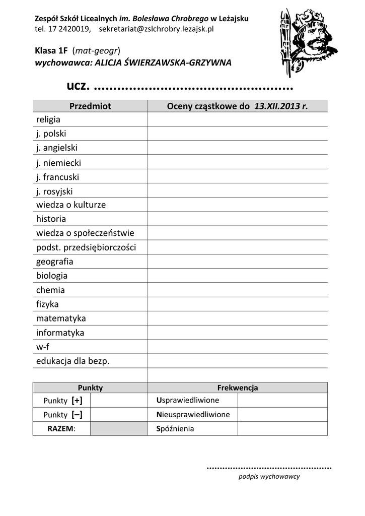 Zespół Szkół Licealnych im. Bolesława Chrobrego w Leżajsku tel. 17 2420019, [email protected] Klasa 1F (mat-geogr) wychowawca: ALICJA ŚWIERZAWSKA-GRZYWNA ucz. ................................................... Przedmiot Oceny cząstkowe do 13.XII.2013 r. religia j. polski j. angielski j. niemiecki j. francuski j. rosyjski wiedza o kulturze historia wiedza o społeczeństwie podst. przedsiębiorczości geografia biologia chemia fizyka matematyka informatyka w-f edukacja dla bezp. Punkty Punkty [+] Frekwencja Usprawiedliwione Punkty [–] Nieusprawiedliwione RAZEM: Spóźnienia ................................................ podpis wychowawcy Zespół Szkół Licealnych im. Bolesława Chrobrego w Leżajsku tel. 17 2420019, [email protected] Klasa 1F (mat-geogr) wychowawca: ALICJA ŚWIERZAWSKA-GRZYWNA ucz. ................................................... Przedmiot Oceny cząstkowe do 13.XII.2013 r. religia j. polski j. angielski j. niemiecki j. francuski j. rosyjski wiedza o kulturze historia wiedza o społeczeństwie podst. przedsiębiorczości geografia biologia chemia fizyka matematyka informatyka w-f edukacja dla bezp. Punkty Punkty [+] Frekwencja Usprawiedliwione Punkty [–] Nieusprawiedliwione RAZEM: Spóźnienia ................................................ podpis wychowawcy