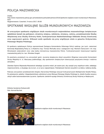POLICJA MAZOWIECKA Źródło: http://www.mazowiecka.policja.gov.pl/ra/dzialania-policji/aktualnosci/2516,Spotkanie-wigilijne-sluzb-mundurowych-Mazowsza. html Wygenerowano: Czwartek, 9 marca 2017, 00:00 SPOTKANIE WIGILIJNE SŁUŻB MUNDUROWYCH MAZOWSZA W uroczystym spotkaniu wigilijnym służb mundurowych województwa mazowieckiego świątecznym opłatkiem łamali się policjanci, strażnicy miejscy, żołnierze, strażacy, celnicy, przedstawiciele Służby Więziennej oraz Służby Ochrony Kolei, funkcjonariusze Nadwiślańskiego Oddziału Straży Granicznej oraz zaproszeni goście. Kilkaset osób spotkało się przy wigilijnym stole w gmachu Ordynariatu Polowego Wojska Polskiego. W spotkaniu opłatkowym Policję reprezentował Zastępca Komendanta Głównego Policji nadinsp. Jan Lach, natomiast Komendę Wojewódzką Policji zs. w Radomiu insp. Tomasz Michułka wraz z zastępcami insp. Markiem Świszczem i mł. insp. Mirosławem Jedynakiem oraz całą kadrą kierowniczą mazowieckiej Policji. Funkcjonariuszom towarzyszył kapelan mazowieckiej policji ks. kan. Mirosław Dragiel. Po powitaniu przybyłych na uroczystość gości, życzenia świąteczne złożył wszystkim Zbigniew Leszczyński Komendant Straży Miejskiej m. st. Warszawy podkreślając, aby spotkaniom świątecznym towarzyszyły pozytywne emocje i rodzinna atmosfera. Zdzisław Sipiera Wojewoda Mazowiecki składając życzenia mówił, jak ważne jest, aby zasiąść przy wspólnym stole, oddalając nieporozumienia, a skupiając się na tym, co w życiu najważniejsze. Podziękował również wszystkim za dobrą i oddaną służbę. Podczas uroczystości przedstawiciele Związku Harcerstwa Polskiego wręczyli funkcjonariuszom Betlejemskie Światło Pokoju. Po poświęceniu opłatka i błogosławieństwie udzielonym przez Biskupa Polowego Wojska Polskiego ks. Józefa Guzdka wszyscy złożyli sobie bożonarodzeniowe życzenia. Spotkanie uświetnił występ Orkiestry Ochotniczej Straży Pożarnej w Nadarzynie. Elżbieta Sandecka-Pultowicz/AC foto: Konrad Bucholc Spotkanie wigilijne służb mundurowych Mazowsza Spotkanie wigilijne służb mundurowych Mazowsza Spotkanie wigilijne służb mundurowych Mazowsza Spotkanie wigilijne służb mundurowych Mazowsza Spotkanie wigilijne służb mundurowych Mazowsza Spotkanie wigilijne służb mundurowych Mazowsza Ocena: 5/5 (1) Tweetnij