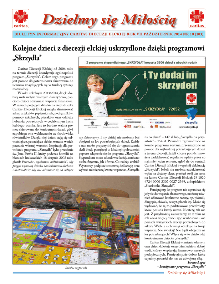 Dzielmy się Miłością BIULETYN INFORMACYJNY CARITAS DIECEZJI EŁCKIEJ ROK VII PAŹDZIERNIK 2014 NR 10 (103) Kolejne dzieci z diecezji ełckiej uskrzydlone dzięki programowi „Skrzydła’’ Caritas Diecezji Ełckiej od 2006 roku na terenie diecezji koordynuje ogólnopolski program „Skrzydła’’. Celem tego programu jest pomoc długoterminowa skierowana do uczniów znajdujących się w trudnej sytuacji materialnej. W roku szkolnym 2013/2014, dzięki dobrej woli indywidualnych darczyńców, pięcioro dzieci otrzymało wsparcie finansowe. W ramach podjętych działań na rzecz dziecka Caritas Diecezji Ełckiej mogła sfinansować zakup artykułów papierniczych, podręczników, pomocy szkolnych, plecaków oraz odzieży i obuwia potrzebnych w codziennym życiu każdego ucznia. Jest to bardzo ważna pomoc skierowana do konkretnych dzieci, gdyż zapobiega ona wykluczeniu ze środowiska rówieśników. Dzięki niej dzieci stają się odważniejsze, pewniejsze siebie, wzrasta w nich poczucie własnej wartości. Inspiracją dla powołaniu programu „Skrzydła’’ było przesłanie św. Jana Pawła II, który podczas homilii na błoniach krakowskich 18 sierpnia 2002 roku głosił: Potrzeba „wyobraźni miłosierdzia”, aby przyjść z pomocą dziecku zaniedbanemu duchowo i materialnie; aby nie odwracać się od chłopca czy dziewczyny. I my dzisiaj nie możemy być obojętni na los potrzebujących dzieci. Każdy z nas może przyczynić się do ograniczenia skali biedy panującej w lokalnej społeczności poprzez włączenie się do programu „Skrzydła”. Stypendium może ufundować każdy, zarówno osoba fizyczna, jak i firma. Co należy zrobić? Wystarczy podpisać stosowną deklarację oraz wybrać miesięczną kwotę wsparcia: „Skrzydła Szkolne wyprawki na co dzień” – 147 zł lub „Skrzydła na przyszłość’’ – 154 zł. Pieniądze zgromadzone na koncie programu zostaną przeznaczone na pomoc dla najbardziej potrzebujących dzieci z terenu diecezji. Jeżeli chcesz pomóc i możesz zadeklarować regularne wpłaty przez co najmniej jeden semestr, zgłoś się do centrali Caritas Diecezji Ełckiej i wypełnij deklarację „Skrzydeł”. Jeżeli nie możesz zadeklarować wpłat na dłuższy okres, przekaż swój dar serca na konto Caritas Diecezji Ełckiej: 29 1020 4724 0000 3302 0027 2369, z dopiskiem: „Skarbonka Skrzydeł’’. Pamiętajmy, że program nie ogranicza się jedynie do wsparcia finansowego, możemy również ofiarować konkretne rzeczy, np. piórnik, długopis, ołówek, zeszyt, plecak itp. Może się wydawać, że są to podstawowe przedmioty, które posiada każdy uczeń. Niestety, tak nie jest. Z przykrością zauważamy, że z roku na rok coraz więcej dzieci żyje w ubóstwie i nie posiada wszystkich rzeczy potrzebnych do szkoły. Wiele z nich wciąż oczekuje na twoje wsparcie. Nie zwlekaj! Nie bądź obojętny na los potrzebujących! Włącz się w to dzieło i daj konkretnemu dziecku „skrzydła’’. Caritas Diecezji Ełckiej w imieniu własnym oraz dzieci dziękuje wszystkim ludziom dobrej woli, którzy wspierają finansowo naszych podopiecznych. Pamiętajmy, że dobro, które czynimy, powróci do nas ze zdwojoną siłą. Iwona Łopot – koordynator programu „Skrzydła’’ Dzielmy się Miłością 1 www.elk.caritas.pl Szkolenie pracowników Caritas – lokalnych liderów promykowego ratownika Podczas VII Słonecznego Zlotu Świetlic Środowiskowych „Promyk Dnia” odbyły się warsztaty doskonalące z zakresu pierwszej pomocy przedmedycznej dla lokalnych liderów szkolenia promykowego ratownika. Zlot miał miejsce 16-21 sierpnia 2014 r. w Ośrodku Szkoleniowo-Wypoczynkowym ZHP „Perkoz” w Waszecie koło Olsztynka. W szkoleniu uczestniczyło siedmiu liderów, w tym trzech pracowników ełckiej Caritas. Program warsztatów obejmował przypomnienie i doskonalenie wstępnej oceny stanu osoby poszkodowanej, postępowania z osobą nieprzytomną, resuscytację krążeniowo-oddechową, zasady udzielania pierwszej pomocy w przypadkach zranień, krwawień, omdleń, krwotoków, praktyczne opatrywanie ran, unieruchomienie kończyn oraz nowość dla liderów – resuscytację przy użyciu automatycznego defibrylatora zewnętrznego. Warsztaty prowadzili jak zawsze niezawodni i perfekcyjni instruktorzy: Roman Skowroński – specjalista anestezjologii i intensywnej terapii, wykładowca Gdańskiego Uniwersytetu Medycznego oraz Paweł Mikłaszewicz – wykładowca w Wojewódzkim Zespole Szkół Policealnych na kierunku ratownik medyczny i na kursach specjalizacyjnych z zakresu pielęgniarstwa kardiologicznego i pielęgniarstwa ratunkowego w Gdańsku. Celem przeprowadzonych zajęć było udoskonalenie jakości wykonywanych zabiegów ratujących życie ludzkie. Szkolenie udowodniło, że nasi liderzy potrafią kompetentnie i poprawnie medycznie przeprowadzić cały algorytm postępowania z osobą poszkodo- Nauka udzielania pierwszej pomocy waną, a przygotowany specjalnie dla tej grupy ratowników wolontariuszy program pozwala nauczyć dzieci podstaw pierwszej pomocy. Liderzy po ukończeniu warsztatów otrzymali nie tylko certyfikaty, ale również trzy fantomy oraz trzy zestawy plecaków ratowniczych. Dzięki tym prezentom nasi pracownicy-liderzy będą mogli przeszkolić większą liczbę dzieci i młodzieży z naszej diecezji, tym bardziej że szkolenia z pierwszej pomocy przedmedycznej cieszą się dużym zainteresowaniem. Jako liderzy ratownicy chcemy, aby dzieci już od najmłodszych lat uczyły się udzielania pierwszej pomocy oraz aktywnej postawy w sytuacji zagrożenia. Mamy nadzieję, że nasze szkolenia przyczynią się do wzrostu bezpieczeństwa, kształtowania wśród młodzieży postawy odpowiedzialności za życie własne oraz innych ludzi, a także pokonywania barier i przyjmowania aktywnej postawy w przypadku zagrożenia zdrowia lub życia drugiego człowieka. Katarzyna Gabruś – koordynator wolontariatu ełckiego Program EM