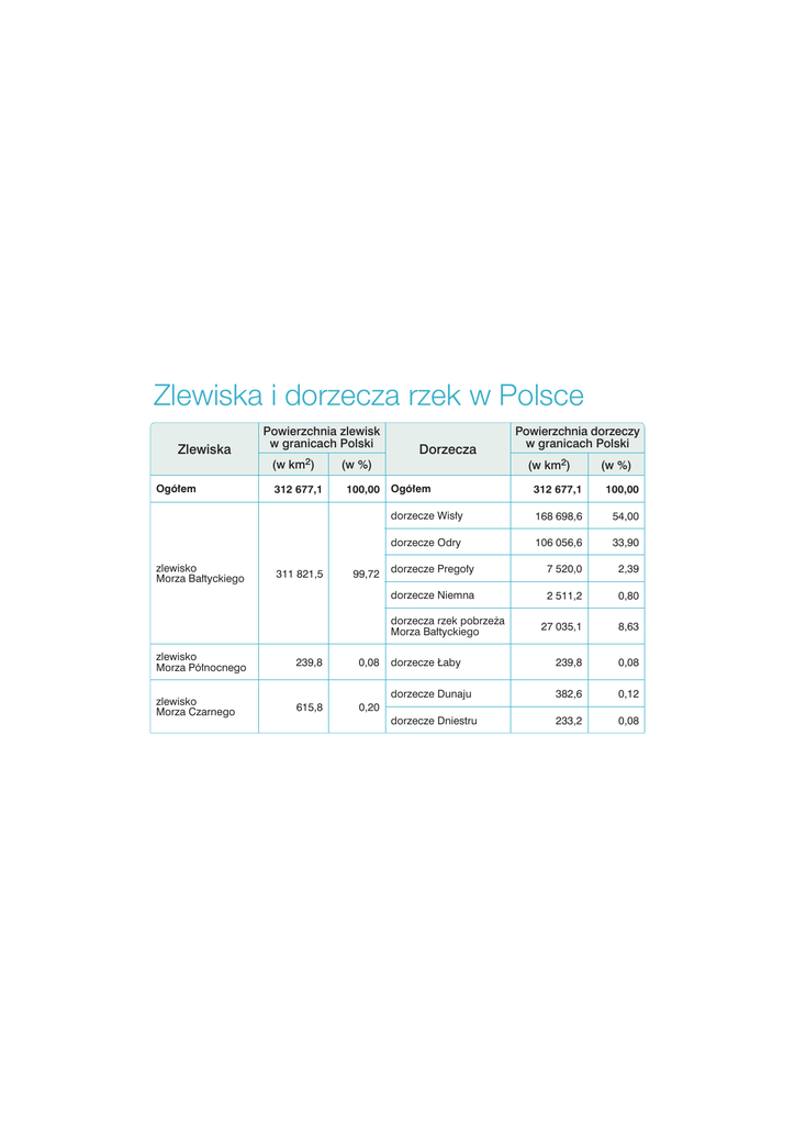 Zlewiska i dorzecza rzek w Polsce Zlewiska Ogó³em zlewisko Morza Ba³tyckiego Powierzchnia zlewisk w granicach Polski (w km2) 312 677,1 311 821,5 (w %) 100,00 99,72 Dorzecza 239,8 0,08 zlewisko Morza Czarnego 615,8 0,20 (w km2) (w %) Ogó³em 312 677,1 100,00 dorzecze Wis³y 168 698,6 54,00 dorzecze Odry 106 056,6 33,90 dorzecze Prego³y 7 520,0 2,39 dorzecze Niemna 2 511,2 0,80 27 035,1 8,63 dorzecze £aby 239,8 0,08 dorzecze Dunaju 382,6 0,12 dorzecze Dniestru 233,2 0,08 dorzecza rzek pobrze¿a Morza Ba³tyckiego zlewisko Morza Pó³nocnego Powierzchnia dorzeczy w granicach Polski