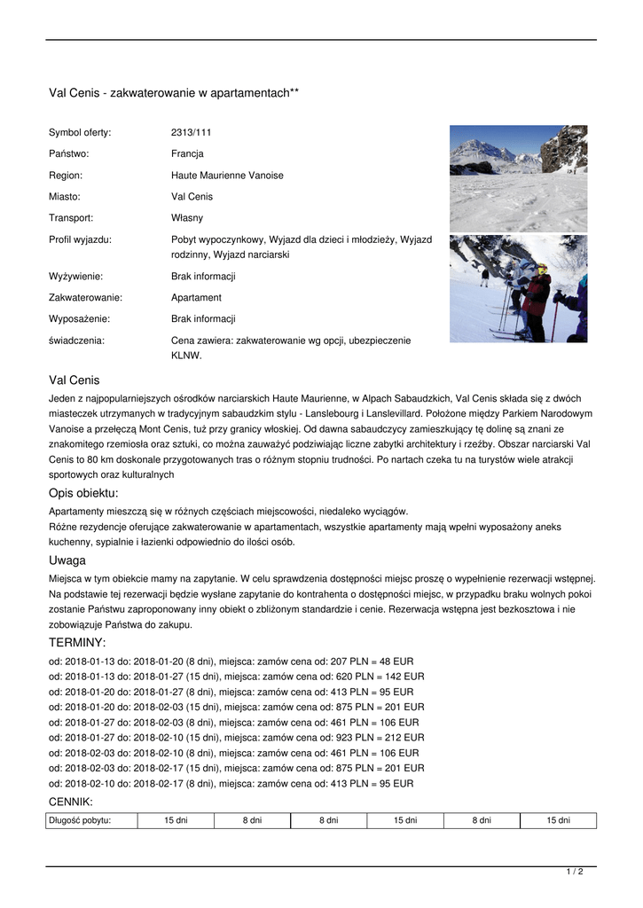 Val Cenis - zakwaterowanie w apartamentach** Symbol oferty: 2313/111 Państwo: Francja Region: Haute Maurienne Vanoise Miasto: Val Cenis Transport: Własny Profil wyjazdu: Pobyt wypoczynkowy, Wyjazd dla dzieci i młodzieży, Wyjazd Wyżywienie: Brak informacji Zakwaterowanie: Apartament Wyposażenie: Brak informacji świadczenia: Cena zawiera: zakwaterowanie wg opcji, ubezpieczenie rodzinny, Wyjazd narciarski KLNW. Val Cenis Jeden z najpopularniejszych ośrodków narciarskich Haute Maurienne, w Alpach Sabaudzkich, Val Cenis składa się z dwóch miasteczek utrzymanych w tradycyjnym sabaudzkim stylu - Lanslebourg i Lanslevillard. Położone między Parkiem Narodowym Vanoise a przełęczą Mont Cenis, tuż przy granicy włoskiej. Od dawna sabaudczycy zamieszkujący tę dolinę są znani ze znakomitego rzemiosła oraz sztuki, co można zauważyć podziwiając liczne zabytki architektury i rzeźby. Obszar narciarski Val Cenis to 80 km doskonale przygotowanych tras o różnym stopniu trudności. Po nartach czeka tu na turystów wiele atrakcji sportowych oraz kulturalnych Opis obiektu: Apartamenty mieszczą się w różnych częściach miejscowości, niedaleko wyciągów. Różne rezydencje oferujące zakwaterowanie w apartamentach, wszystkie apartamenty mają wpełni wyposażony aneks kuchenny, sypialnie i łazienki odpowiednio do ilości osób. Uwaga Miejsca w tym obiekcie mamy na zapytanie. W celu sprawdzenia dostępności miejsc proszę o wypełnienie rezerwacji wstępnej. Na podstawie tej rezerwacji będzie wysłane zapytanie do kontrahenta o dostępności miejsc, w przypadku braku wolnych pokoi zostanie Państwu zaproponowany inny obiekt o zbliżonym standardzie i cenie. Rezerwacja wstępna jest bezkosztowa i nie zobowiązuje Państwa do zakupu. TERMINY: od: 2018-01-13 do: 2018-01-20 (8 dni), miejsca: zamów cena od: 207 PLN = 48 EUR od: 2018-01-13 do: 2018-01-27 (15 dni), miejsca: zamów cena od: 620 PLN = 142 EUR od: 2018-01-20 do: 2018-01-27 (8 dni), miejsca: zamów cena od: 413 PLN = 95 EUR od: 2018-01-20 do: 2018-02-03 (15 dni), miejsca: zamów cena od: 875 PLN = 201 EUR od: 2018-01-27 do: 2018-02-03 (8 dni), miejsca: zamów cena od: 461 PLN = 106 EUR od: 2018-01-27 do: 2018-02-10 (15 dni), miejsca: zamów cena od: 923 PLN = 212 EUR od: 2018-02-03 do: 2018-02-10 (8 dni), miejsca: zamów cena od: 461 PLN = 106 EUR od: 2018-02-03 do: 2018-02-17 (15 dni), miejsca: zamów cena od: 875 PLN = 201 EUR od: 2018-02-10 do: 2018-02-17 (8 dni), miejsca: zamów cena od: 413 PLN = 95 EUR CENNIK: Długość pobytu: 15 dni 8 dni 8 dni 15 dni 8 dni 15 dni 1/2 Grupa cenowa: A Pobyt w obiekcie (do wyboru) A (*) apartament 10 osobowy standardowo dla osób: 10 810 405 Apartament 8-osobowy standardowo dla osób: 8 720 360 apartament 4 osobowy standardowo dla osób: 4 550 275 apartament 2-osobowy standardowo dla osób: 2 420 210 apartament 6-osobowy standardowo dla osób: 6 630 315 apartament 3-osobowy standardowo dla osób: 3 480 240 apartament 5-osobowy standardowo dla osób: 5 580 290 Ubezpieczenie (do wyboru) ubezpieczene NWKL SKI (*) ubezpieczenie NW KL D D C C 990 1980 880 1760 900 1800 780 1560 680 1360 590 1180 545 1090 475 950 830 1660 730 1460 620 1240 540 1080 780 1560 680 1360 30 15 15 30 15 30 14 7 7 14 7 14 2.4 % 2.4 % 2.4 % 2.4 % 2.4 % Ubezpieczenie (opcjonalne) ubezpieczenie - od kosztów rezygnacji 2.4 % Waluta: EUR Aktualne ceny z systemu S.A.R.T. (-) - cena usługi, podatku kalkulowana przy osobie lub gratis (*) - kwota wliczona w cenę standardową 2/2