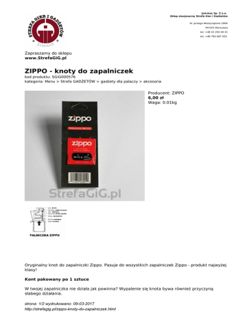 Jammas Sp. Z o.o. Sklep stacjonarny Strefa Gier i Gadżetów Al. Jerzego Waszyngtona 100A 04-015 Warszawa tel. +48 22 250 20 21 tel. +48 793 097 555 Zapraszamy do sklepu www.StrefaGiG.pl ZIPPO - knoty do zapalniczek kod produktu: SGiG000576 kategoria: Menu > Strefa GADŻETÓW > gadżety dla palaczy > akcesoria Producent: ZIPPO 6,00 zł Waga: 0.01kg Oryginalny knot do zapalniczki Zippo. Pasuje do wszystkich zapalniczek Zippo - produkt najwyżej klasy! Kont pakowany po 1 sztuce W twojej zapalniczka nie działa jak powinna? Wypalenie się knota bywa również przyczyną słabego działania. strona: 1/2 wydrukowano: 09-03-2017 http://strefagig.pl/zippo-knoty-do-zapalniczek.html Nie tylko kamień może się skończyć, pamiętaj, że i to nie jest problem! Jeśli knot w Twojej zapalniczce Zippo zaczyna się kruszyć, jest czarny i zwęglony to znaczy, że czas go wymienić. W pierwszej kolejności możesz spróbować wyciągnąć dotychczasowy: weź pęsetę i pociągnij delikatnie za knot od góry, wciągnij go nad komin i przytnij zużytą końcówkę. Pamiętaj, aby od czasu do czasu wymienić knot na nowy, jeśli zużyta została jego część. Wyciągnij wszystkie kulki wypełniające z komory benzynowej i usuń cały knot, następnie przez górę komina przeciągnij nowy pociągając w dół przeplatając go przez kuliste wkładki uzupełniające. Gotowe strona: 2/2 wydrukowano: 09-03-2017 http://strefagig.pl/zippo-knoty-do-zapalniczek.html