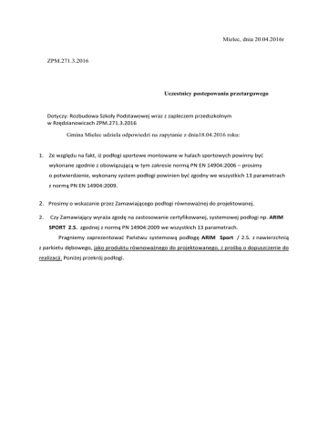 Mielec, dnia 20.04.2016r ZPM.271.3.2016 Uczestnicy postepowania przetargowego Dotyczy: Rozbudowa Szkoły Podstawowej wraz z zapleczem przedszkolnym w Rzędzianowicach ZPM.271.3.2016 Gmina Mielec udziela odpowiedzi na zapytanie z dnia18.04.2016 roku: 1. Ze względu na fakt, iż podłogi sportowe montowane w halach sportowych powinny być wykonane zgodnie z obowiązującą w tym zakresie normą PN EN 14904:2006 – prosimy o potwierdzenie, wykonany system podłogi powinien być zgodny we wszystkich 13 parametrach z normą PN EN 14904:2009. 2. Prosimy o wskazanie przez Zamawiającego podłogi równoważnej do projektowanej. 2. Czy Zamawiający wyraża zgodę na zastosowanie certyfikowanej, systemowej podłogi np. ARIM SPORT 2.S. zgodnej z normą PN 14904:2009 we wszystkich 13 parametrach. Pragniemy zaprezentować Państwu systemową podłogę ARIM Sport / 2.S. z nawierzchnią z parkietu dębowego, jako produktu równoważnego do projektowanego, z prośbą o dopuszczenie do realizacji. Poniżej przekrój podłogi. Rys. 1 – Przekrój podłogi sportowej Nazwa elementu / parametru ilość warstw folii izolacyjnej łącznie [ szt. ] Rozstaw klina / podkładki poziomującej [cm] rozstaw elementów sprężystych [ cm ] legary pojedyńcze ( 1 ) czy podwójne ( 2 ) długość elementu legarów [ cm ] szerokość elementów legarów [ cm ] rozstaw legarów dolnych oś / oś [ cm ] rozstaw legarów górnych oś / oś [ cm ] długość elementów ślepej podłogi [ cm ] Ilość 2 50,00 2 250,00 9,50 50,00 50,00 250,00 szerokość elementu ślepej podłogi [ cm ] 9,50 Wysokość konstrukcji tworzą : folia łącznie [ mm ] 50,00 Ilość 0,30 Klin [ mm ] 27,50 legar dolny [ mm ] legar górny [ mm ] ślepa podłoga [ mm ] płyta V313 [ mm ] płyta V313 [ mm ] wysokość konstrukcji [ mm. ] grubość nawierzchni [ mm. ] wysokość całkowita podłogi [ mm. ] 19,00 19,00 19,00 0,00 0,00 84,80 22,00 106,80 rozstaw elementów ślepej podłogi oś / oś [ 12,50 cm ] Podłoga ta posiadają badania wszystkich 13-tu parametrów wymaganych przez normę PNEN 14904 : 2009 i oznaczenie . Podłoga został przebadana pod kątem: - bezpieczeństwa (antyfrazowości) ćwiczących – parametr 1-4, - zdrowia ćwiczących – parametr 5-6, - komfortu ćwiczących – parametr 7-9 - trwałości podłogi (bezpieczeństwa Inwestora) – parametr 10-13. Parametry te, poza bezpieczeństwem prawnym Inwestora (znak wymagany jest przez Ustawę Prawo Budowlane), daje praktyczną korzyść w postaci trwałość podłogi (par. 10-13), która zbadana z pozytywnym wynikiem przez notyfikowany instytut przy użyciu urządzenia tzw. „elektronicznego zawodnika”, daleko wybiega poza okres gwarancji. Przy tego typu obiektach i niemałej powierzchni istotne parametry podłogi jak np. absorpcja energii uderzenia, ugięcie powierzchniowe, współczynnik odbicia piłki muszą odpowiadać wymogom wyczynowego poziomu rozgrywek, zawartych w normach dotyczących podłóg sportowych tj. EN-PN 14904 i DIN 18032 cz.2, które to normy - jednocześnie - bardzo rygorystycznie traktują bezpieczeństwo ćwiczącej na niej młodzieży, szczególnie w okresie rozwojowym stawów i kręgosłupa – parametr „odkształcenie pionowe”, jak i możliwość upadków i związanych z nimi urazach – parametr „tarcie (śliskość) i „amortyzacja uderzenia”. Należy przy tym pamiętać, że wg posiadanych przez nas informacji i wytycznych Komisji Europejskiej ds. Sportu wszystkie nawierzchnie sportowe, zarówno zewnętrzne jak i wewnętrzne przeznaczone do gier zespołowych dla młodzieży szkolnej, gimnazjalnej i licealnej (tj. dla dzieci i młodzieży w okresie rozwoju ich kręgosłupa i całego układu mięśniowo-stawowego) do 2020 roku będą musiały spełniać przywołane wyżej normy europejskie. Współczynniki - wskaźniki przekładające się bezpośrednio na tzw. „anty-urazowość” podłogi, w przypadku proponowanego przez nas systemu - 58% energii uderzenia wywracającego się ucznia zostaje zabsorbowane przez podłogę, tyleż samo mniej obciążeń wzdłużnych przyjmie kręgosłup biegającego zawodnika. Odpowiedź: Potwierdzamy, iż na sali sportowej należy zastosować system podłogi sportowej spełniający normę EN 14904. Podłoga ARIM SPORT spełnia te parametry a więc można zastosować ten system podłogi . Osoba do kontaktu: Andrzej Bieniek, Renata Gębarowska-Piwnica tel.17 774 56 46 Wójt Gminy Mielec /-/Józef Piątek
