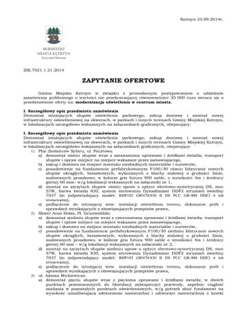 Kętrzyn 23.09.2014r. ZIK.7021.1.21.2014 ZAPYTANIE OFERTOWE Gmina Miejska Kętrzyn w związku z prowadzonym postępowaniem o udzielenie zamówienia publicznego o wartości nie przekraczającej równowartości 30 000 euro zwraca się o przedstawienie oferty na: modernizację oświetlenia w centrum miasta. I. Szczegółowy opis przedmiotu zamówienia DemontaŜ istniejących słupów oświetlenia parkowego, zakup dostawę i montaŜ nowej infrastruktury oświetleniowej na skwerach, w parkach i innych terenach Gminy Miejskiej Kętrzyn, w lokalizacjach szczegółowo wskazanych na załącznikach graficznych, obejmujący: I. Szczegółowy opis przedmiotu zamówienia DemontaŜ istniejących słupów oświetlenia parkowego, zakup dostawę i montaŜ nowej infrastruktury oświetleniowej na skwerach, w parkach i innych terenach Gminy Miejskiej Kętrzyn, w lokalizacjach szczegółowo wskazanych na załącznikach graficznych, obejmujący: 1) Plac Zesłańców Sybiru, ul. Pocztowa: a) demontaŜ ośmiu słupów wraz z szesnastoma oprawami i źródłami światła; transport słupów i opraw miejsce na miejsce wskazane przez zamawiającego, b) zakup i dostawa na miejsce montaŜu niezbędnych materiałów i surowców, c) posadowienie na fundamencie prefabrykowanym F100/30 ośmiu fabrycznie nowych słupów okrągłych, bezszwowych, wykonanych z blachy stalowej o grubości 3mm, malowanych proszkowo, w kolorze gris futura 900 sable, o wysokości 4m i średnicy górnej 60 mm– w/g lokalizacji wskazanych na załączniki nr 1, d) montaŜ na szczytach słupów ośmiu opraw o optyce obrotowo-symetrycznej DS, moc 57W, barwa światła 830, system sterowania Dynadimmer DDF2 strumień świetlny 7037 lm (odpowiadający model: BDP102 GRN70/830 II DS PCC GR-900 DDF2 6 lub równowaŜny), e) podłączenie do istniejącej wew. instalacji oświetlenia terenu, dokonanie prób i sprawdzeń wynikających z obowiązujących przepisów prawa, 2) Skwer Arno Holza, Pl. Grunwaldzki: a) demontaŜ siedmiu słupów wraz z czternastoma oprawami i źródłami światła; transport słupów i opraw miejsce na miejsce wskazane przez zamawiającego, b) zakup i dostawa na miejsce montaŜu niezbędnych materiałów i surowców, c) posadowienie na fundamencie prefabrykowanym F100/30 siedmiu fabrycznie nowych słupów okrągłych, bezszwowych, wykonanych z blachy stalowej o grubości 3mm, malowanych proszkowo, w kolorze gris futura 900 sable o wysokości 4m i średnicy górnej 60 mm – w/g lokalizacji wskazanych na załączniki nr 2, d) montaŜ na szczytach słupów siedmiu opraw o optyce obrotowo-symetrycznej DS, moc 57W, barwa światła 830, system sterowania Dynadimmer DDF2 strumień świetlny 7037 lm (odpowiadający model: BDP102 GRN70/830 II DS PCC GR-900 DDF2 6 lub równowaŜny), e) podłączenie do istniejącej wew. instalacji oświetlenia terenu, dokonanie prób i sprawdzeń wynikających z obowiązujących przepisów prawa, 3) ul. Adama Mickiewicza: a) demontaŜ pięciu słupów wraz z pięcioma oprawami i źródłami światła; w dwóch punktach przeznaczonych do likwidacji zabezpieczyć przewody, zapełnić ciągłość zasilania w pozostałych punktach oświetleniowych, w/g potrzeb skuć fundament na wysokość umoŜliwiającą odtworzenie nawierzchni i odtworzyć nawierzchnię z kostki betonowej; transport słupów i opraw miejsce na miejsce wskazane przez zamawiającego, b) zakup i dostawa na miejsce montaŜu niezbędnych materiałów i surowców, c) posadowienie na fundamencie prefabrykowanym F100/30 trzech fabrycznie nowych słupów okrągłych, bezszwowych, wykonanych z blachy stalowej o grubości 3mm, malowanych proszkowo, w kolorze gris futura 900 sable, o wysokości 3,5m, z redukcją średnicy górnej z 76mm do 60 mm– w/g lokalizacji wskazanych na załączniki nr 3, d) montaŜ na szczytach słupów trzech opraw o optyce symetrycznej MDS, strumień świetlny 8606, moc 80W, system sterowania Dynadimmer DDF2, podświetlenie słupa w kolorze niebieskim wychodzące z zaczepu dolnego oprawy (odpowiadający model: BDS660 GRN80-2S/830 PSR II MDS GR-900 DD lub równowaŜny), e) podłączenie do istniejącej wew. instalacji oświetlenia terenu, dokonanie prób i sprawdzeń wynikających z obowiązujących przepisów prawa, 4) ul. Tadeusza Kościuszki: a) demontaŜ czterech słupów wraz z czterema oprawami i źródłami światła; transport słupów i opraw miejsce na miejsce wskazane przez zamawiającego, b) zakup i dostawa na miejsce montaŜu niezbędnych materiałów i surowców – z wyjątkiem opraw i źródeł światła dostarczanych przez Zamawiającego, c) posadowienie na fundamencie prefabrykowanym F100/30 czterech fabrycznie nowych słupów okrągłych, bezszwowych, wykonanych z blachy stalowej o grubości 3mm, malowanych proszkowo, w kolorze gris futura 900 sable, o wysokości 4m i średnicy górnej 60 mm – w/g lokalizacji wskazanych na załączniki nr 4, d) montaŜ na szczytach słupów czterech opraw dostarczonych przez Zamawiającego, e) podłączenie do istniejącej wew. instalacji oświetlenia terenu, dokonanie prób i sprawdzeń wynikających z obowiązujących przepisów prawa, 5) Plac marsz. J. Piłsudskiego: a) demontaŜ pięciu słupów wraz z dziesięcioma oprawami i źródłami światła oraz trzech słupów w trzema oprawami; w trzech punktach przeznaczonych do likwidacji zabezpieczyć przewody, w/g potrzeb skuć fundament na wysokość umoŜliwiającą odtworzenie nawierzchni i odtworzyć nawierzchnię z kostki betonowej; transport słupów i opraw miejsce wskazane przez zamawiającego, b) zakup i dostawa na miejsce montaŜu niezbędnych materiałów i surowców, c) na fundamencie prefabrykowanym F100/30 czterech fabrycznie nowych słupów okrągłych bezszwowych wykonanych z blachy stalowej o grubości 3mm malowanych proszkowo , w kolorze gris futura 900 sable o wysokości 3,5m z redukcją średnicy górnej z 76mm na 60 mm – w/g lokalizacji wskazanych na załączniki nr 5, d) montaŜ na szczytach słup