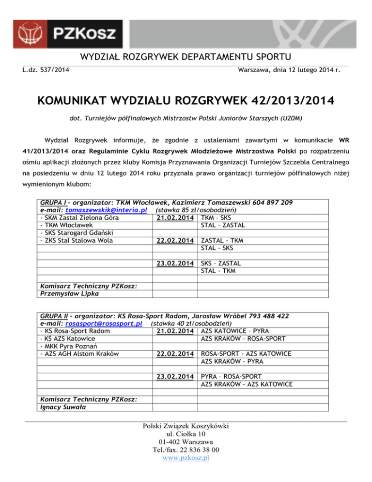 WYDZIAŁ ROZGRYWEK DEPARTAMENTU SPORTU ______________________________________________________________________________________________________________________________________________________________________________ L.dz. 537/2014 Warszawa, dnia 12 lutego 2014 r. KOMUNIKAT WYDZIAŁU ROZGRYWEK 42/2013/2014 dot. Turniejów półfinałowych Mistrzostw Polski Juniorów Starszych (U20M) Wydział Rozgrywek informuje, że zgodnie z ustaleniami zawartymi w komunikacie WR 41/2013/2014 oraz Regulaminie Cyklu Rozgrywek Młodzieżowe Mistrzostwa Polski po rozpatrzeniu ośmiu aplikacji złożonych przez kluby Komisja Przyznawania Organizacji Turniejów Szczebla Centralnego na posiedzeniu w dniu 12 lutego 2014 roku przyznała prawo organizacji turniejów półfinałowych niżej wymienionym klubom: GRUPA I – organizator: TKM Włocławek, Kazimierz Tomaszewski 604 897 209 e-mail: [email protected] (stawka 85 zł/osobodzień) - SKM Zastal Zielona Góra 21.02.2014 TKM – SKS - TKM Włocławek STAL – ZASTAL - SKS Starogard Gdański - ZKS Stal Stalowa Wola 22.02.2014 ZASTAL - TKM STAL - SKS 23.02.2014 SKS – ZASTAL STAL - TKM Komisarz Techniczny PZKosz: Przemysław Lipka GRUPA II – organizator: KS Rosa-Sport Radom, Jarosław Wróbel 793 488 422 e-mail: [email protected] (stawka 40 zł/osobodzień) - KS Rosa-Sport Radom 21.02.2014 AZS KATOWICE – PYRA - KŚ AZS Katowice AZS KRAKÓW – ROSA-SPORT - MKK Pyra Poznań - AZS AGH Alstom Kraków 22.02.2014 ROSA-SPORT - AZS KATOWICE AZS KRAKÓW - PYRA 23.02.2014 PYRA – ROSA-SPORT AZS KRAKÓW - AZS KATOWICE Komisarz Techniczny PZKosz: Ignacy Suwała ______________________________________________________________________________________ Polski Związek Koszykówki ul. Ciołka 10 01-402 Warszawa Tel./fax. 22 836 38 00 www.pzkosz.pl WYDZIAŁ ROZGRYWEK DEPARTAMENTU SPORTU ______________________________________________________________________________________________________________________________________________________________________________ GRUPA III – organizator: TS Wisła Kraków, Marcin Kękuś 696 760 606 e-mail: [email protected] (stawka 85 zł/osobodzień) - Trefl Sopot 21.02.2014 WISŁA – POLONIA - TS Wisła Kraków ŁKS – TREFL - MKS Polonia Warszawa - ŁKS KM Łódź 22.02.2014 TREFL - WISŁA ŁKS - POLONIA 23.02.2014 POLONIA – TREFL ŁKS - WISŁA Komisarz Techniczny PZKosz: Tadeusz Kamyk GRUPA IV – organizator: MKS Start Lublin, Cezary Wicha 667 938 752 e-mail: [email protected] (stawka 77 zł/osobodzień) - PBG Basket Junior Poznań 21.02.2014 START – GIMBASKET - MKS Start Lublin MICKIEWICZ – PBG BASKET - UKS Gimbasket Wrocław - KKS Mickiewicz Katowice 22.02.2014 PBG BASKET - START MICKIEWICZ - GIMBASKET 23.02.2014 GIMBASKET – PBG BASKET MICKIEWICZ - START Komisarz Techniczny PZKosz: Krzysztof Kołoszewski Szczegółowe zasady organizacji turniejów zawarte są w Regulaminie Cyklu Rozgrywek Młodzieżowe Mistrzostwa Polski. Dodatkowe informacje: 1. Osobą prowadzącą cykl w Wydziale Rozgrywek DS PZKosz jest Piotr Hajduk, tel. +48 885 881 011, mail [email protected]. Prosimy Kluby i Komisarzy Technicznych o zwracanie się bezpośrednio do osoby prowadzącej we wszystkich sprawach dotyczących Mistrzostw. 2. Kluby uczestniczące w turnieju mają obowiązek przesłać druki zgłoszeń imiennych w wersji Word, nie pdf (zał. nr 23) wypełnione komputerowo najpóźniej do dnia 18 lutego 2014 roku (wtorek) do godz. 12.00 pocztą elektroniczną na adres [email protected]. ______________________________________________________________________________________ Polski Związek Koszykówki ul. Ciołka 10 01-402 Warszawa Tel./fax. 22 836 38 00 www.pzkosz.pl WYDZIAŁ ROZGRYWEK DEPARTAMENTU SPORTU ______________________________________________________________________________________________________________________________________________________________________________ 3. Organizator turnieju jest zobowiązany do przesłania na adres [email protected] do dnia 14 lutego 2014 roku (piątek) do godz. 12:00 projektu Komunikatu Organizacyjnego (w pliku otwartym do edycji, np. Microsoft Word) zawierającego informację dotyczącą godzin rozgrywania meczów. Komunikat ten zostanie wysłany do zainteresowanych przez Wydział Rozgrywek, prosimy nie rozsyłać komunikatu przed akceptacją WR DS PZKosz. 4. Organizator turnieju jest zobowiązany do wrzucenia plików wideo z meczów zgodnie z zasadami zawartymi w Regulaminie Cyklu na serwer FTP PZKosz. nazwa serwera: mecze.pzkosz.pl login: u20m_2014 hasło: pzkosz2014 Na serwerze FTP zostały utworzone odpowiednie katalogi, w których należy umieścić zapis wideo z meczów. Prosimy o nieprzysyłanie płyt DVD do Wydziału Rozgrywek! W przypadku wątpliwości w sprawach technicznych prosimy o kontakt z osobą prowadzącą cykl. 5. Do turnieju finałowego (12-16 marca 2014 roku) awansują po dwa zespoły z każdej grupy. Termin składania aplikacji o organizację turnieju finałowego upływa w dniu 26 lutego 2014 r. (środa) o godz. 12.00. 6. Komisarze Techniczni są zobowiązani do nawiązania kontaktu z organizatorem turnieju w celu omówienia szczegółów organizacyjnych i przeprowadzenia konferencji technicznej oraz weryfikacji drużyn. 7. W przypadku problemów technicznych z transmisją statystyczną on-line zobowiązuje się Komisarza Technicznego do przekazywania po każdym dniu turnieju wyników spotkań oraz w ostatnim dniu turnieju ostatecznej kolejności miejsc za pomocą usługi SMS na podany wyżej numer telefonu osoby prowadzącej cykl. 8. Najpóźniej 24 godziny po zakończeniu turnieju komisarz techniczny PZKosz jest zobowiązany przesłać na adres e-mail [email protected] raport z turnieju, według wzoru obowiązującego w sezonie 2013/2014. 9. Najpóźniej 48 godzin od zakończenia turnieju komisarz techniczny PZKosz zobowiązany jest do wysłania priorytetowym listem poleconym do WR DS PZKosz dokumentacji turniejowej zawierającej szczegółowy raport (z wynikami i prawidłową tabel