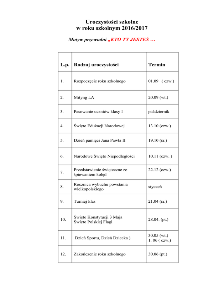Uroczystości szkolne w roku szkolnym 2016/2017 Motyw przewodni „KTO TY JESTEŚ … L.p. Rodzaj uroczystości Termin 1. Rozpoczęcie roku szkolnego 01.09 ( czw.) 2. Mityng LA 20.09 (wt.) 3. Pasowanie uczniów klasy I październik 4. Święto Edukacji Narodowej 13.10 (czw.) 5. Dzień pamięci Jana Pawła II 19.10 (śr.) 6. Narodowe Święto Niepodległości 10.11 (czw. ) 7. Przedstawienie świąteczne ze śpiewaniem kolęd 22.12 (czw.) 8. Rocznica wybuchu powstania wielkopolskiego styczeń 9. Turniej klas 21.04 (śr.) 10. Święto Konstytucji 3 Maja Święto Polskiej Flagi 28.04. (pt.) 11. Dzień Sportu, Dzień Dziecka ) 30.05 (wt.) 1. 06 ( czw.) 12. Zakończenie roku szkolnego 30.06 (pt.)