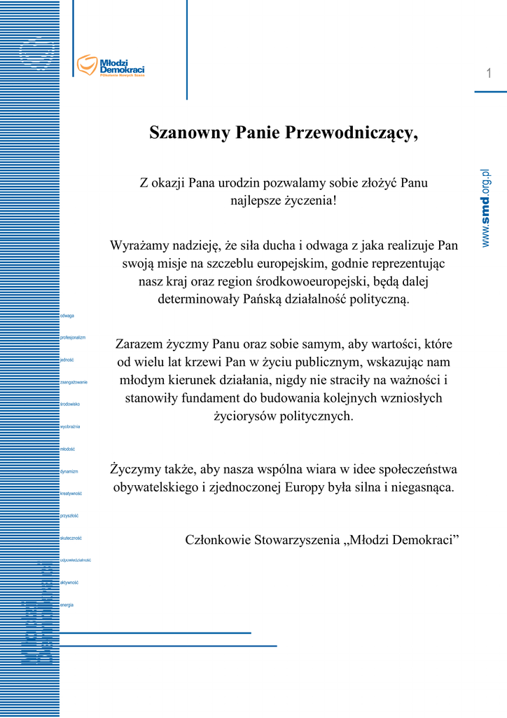 1 Szanowny Panie Przewodniczący, Z okazji Pana urodzin pozwalamy sobie złożyć Panu najlepsze życzenia! Wyrażamy nadzieję, że siła ducha i odwaga z jaka realizuje Pan swoją misje na szczeblu europejskim, godnie reprezentując nasz kraj oraz region środkowoeuropejski, będą dalej determinowały Pańską działalność polityczną. Zarazem życzmy Panu oraz sobie samym, aby wartości, które od wielu lat krzewi Pan w życiu publicznym, wskazując nam młodym kierunek działania, nigdy nie straciły na ważności i stanowiły fundament do budowania kolejnych wzniosłych życiorysów politycznych. Życzymy także, aby nasza wspólna wiara w idee społeczeństwa obywatelskiego i zjednoczonej Europy była silna i niegasnąca. Członkowie Stowarzyszenia „Młodzi Demokraci”