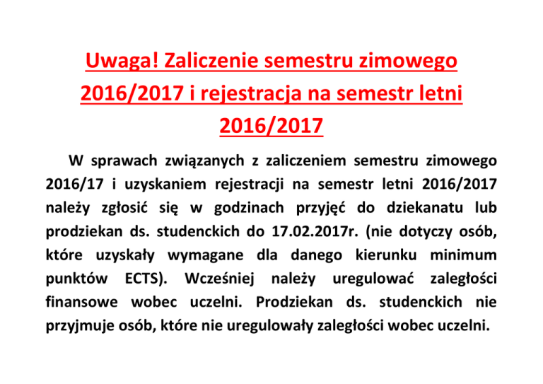 Zaliczenie semestru zimowego 2016/2017 i rejestracja na semestr