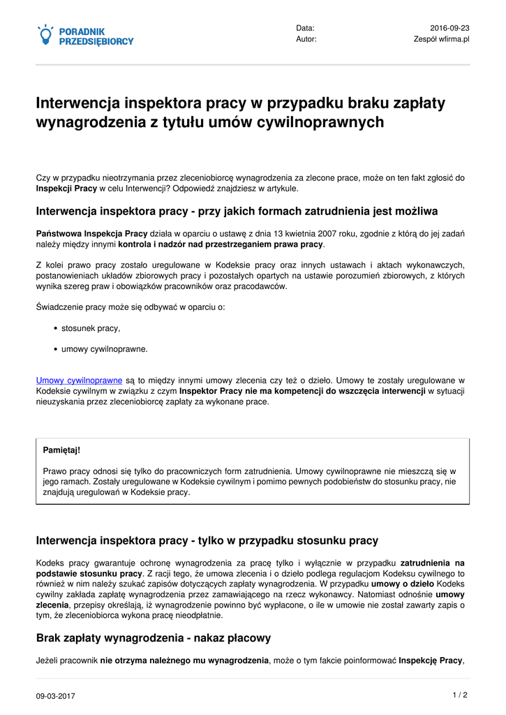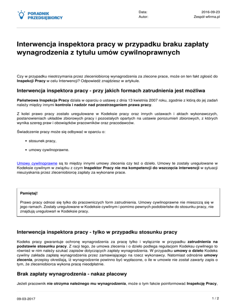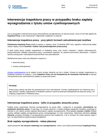 Data: Autor: 2016-09-23 Zespół wfirma.pl Interwencja inspektora pracy w przypadku braku zapłaty wynagrodzenia z tytułu umów cywilnoprawnych Czy w przypadku nieotrzymania przez zleceniobiorcę wynagrodzenia za zlecone prace, może on ten fakt zgłosić do Inspekcji Pracy w celu Interwencji? Odpowiedź znajdziesz w artykule. Interwencja inspektora pracy - przy jakich formach zatrudnienia jest możliwa Państwowa Inspekcja Pracy działa w oparciu o ustawę z dnia 13 kwietnia 2007 roku, zgodnie z którą do jej zadań należy między innymi kontrola i nadzór nad przestrzeganiem prawa pracy. Z kolei prawo pracy zostało uregulowane w Kodeksie pracy oraz innych ustawach i aktach wykonawczych, postanowieniach układów zbiorowych pracy i pozostałych opartych na ustawie porozumień zbiorowych, z których wynika szereg praw i obowiązków pracowników oraz pracodawców. Świadczenie pracy może się odbywać w oparciu o: stosunek pracy, umowy cywilnoprawne. Umowy cywilnoprawne są to między innymi umowy zlecenia czy też o dzieło. Umowy te zostały uregulowane w Kodeksie cywilnym w związku z czym Inspektor Pracy nie ma kompetencji do wszczęcia interwencji w sytuacji nieuzyskania przez zleceniobiorcę zapłaty za wykonane prace. Pamiętaj! Prawo pracy odnosi się tylko do pracowniczych form zatrudnienia. Umowy cywilnoprawne nie mieszczą się w jego ramach. Zostały uregulowane w Kodeksie cywilnym i pomimo pewnych podobieństw do stosunku pracy, nie znajdują uregulowań w Kodeksie pracy. Interwencja inspektora pracy - tylko w przypadku stosunku pracy Kodeks pracy gwarantuje ochronę wynagrodzenia za pracę tylko i wyłącznie w przypadku zatrudnienia na podstawie stosunku pracy. Z racji tego, że umowa zlecenia i o dzieło podlega regulacjom Kodeksu cywilnego to również w nim należy szukać zapisów dotyczących zapłaty wynagrodzenia. W przypadku umowy o dzieło Kodeks cywilny zakłada zapłatę wynagrodzenia przez zamawiającego na rzecz wykonawcy. Natomiast odnośnie umowy zlecenia, przepisy określają, iż wynagrodzenie powinno być wypłacone, o ile w umowie nie został zawarty zapis o tym, że zleceniobiorca wykona pracę nieodpłatnie. Brak zapłaty wynagrodzenia - nakaz płacowy Jeżeli pracownik nie otrzyma należnego mu wynagrodzenia, może o tym fakcie poinformować Inspekcję Pracy, 09-03-2017 1/2 Data: Autor: 2016-09-23 Zespół wfirma.pl która ma obowiązek sprawdzić skargę. W sytuacji gdy w toku kontroli Inspektor potwierdzi skargę, ma prawo zastosować środki prawne których celem jest zdyscyplinowanie pracodawcy do terminowego i właściwego wypłacania wynagrodzeń. Inspektor może wydać nakaz płacowy, który zobowiązuje pracodawcę do uiszczenia pracownikowi wynagrodzenia za pracę lub innego świadczenia ze stosunku pracy. Pamiętaj! Nakaz płacowy nie może zostać wydany podmiotowi zatrudniającemu na podstawie umów cywilnoprawnych. Jedyną drogą do dochodzenia świadczeń w przypadku umów cywilnoprawnych jest droga sądowa. Jeżeli inspektor pracy wydałby nakaz płacowy w stosunku do umowy cywilnoprawnej, wówczas jego działanie należy uznać za niezgodne z prawem i wkroczenie w kompetencje właściwe tylko dla sądów powszechnych. Taki nakaz byłby nieważny, a tym samym podmiot, w stosunku do którego został wydany, nie byłby zobligowany do jego wykonania. Czy wiesz, jak wygląda kontrola Państwowej Inspekcji Pracy? © Copyright | Wszystkie prawa zastrzeżone 2006-2017 Web INnovative Software Sp. z o.o., Bolesława Krzywoustego 105/21 51-166 Wrocław, [email protected] KRS 0000342082, NIP 8982167294, Kapitał 60 000zł 09-03-2017 Powered by TCPDF (www.tcpdf.org) 2/2
