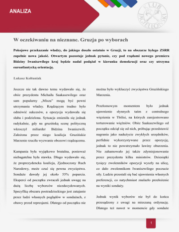 ANALIZA W oczekiwaniu na nieznane. Gruzja po wyborach Pokojowe przekazanie władzy, do jakiego doszło ostatnio w Gruzji, to na obszarze byłego ZSRR zupełnie nowa jakość. Otwartym pozostaje jednak pytanie, czy pod rządami nowego premiera Bidziny Iwaniszwilego kraj będzie nadal podążał w kierunku demokracji oraz czy utrzyma euroatlantycką orientację. Łukasz Kołtuniak Jeszcze nie tak dawno temu wydawało się, że można było wykluczyć zwycięstwa Gruzińskiego obóz prezydenta Michaiła Saakaszwilego oraz Marzenia. sam popularny „Misza” mogą być pewni utrzymania władzy. Rządzącym trudno było Przełomowym odmówić sukcesów, a opozycja wydawała się ujawnienie słaba i podzielona. Sytuacja zmieniła się jednak więzienia w Tbilisi, na których zarejestrowano radykalnie, gdy na gruzińską scenę polityczną torturowanie więźniów. Obóz Saakaszwilego od wkroczył Iwaniszwili. początku odciął się od nich, próbując przedstawić Gruzińskie nagrania jako nadużycie zwykłych urzędników, Założona miliarder przez Bidzina niego koalicja Marzenie rzuciła wyzwanie obozowi rządzącemu. perfidnie momentem słynnych taśm wykorzystywane było z jednak centralnego przez opozycję, jednak to nie powstrzymało lawiny oburzenia. Kampania była wyjątkowo brutalna, ponieważ Nie zahamowało jej także zdymisjonowanie niebagatelna była stawka. Długo wydawało się, przez prezydenta kilku ministrów. Dziesiątki że proprezydencka koalicja, Zjednoczony Ruch tysięcy zwolenników opozycji wyszły na ulicę, Narodowy, może czuć się pewna zwycięstwa. co dało zwolennikom Iwaniszwilego poczucie Sondaże dawały jej około 55% poparcia. siły. Ludzie przestali się bać ujawnienia własnych Eksperci od początku zwracali jednak uwagę na preferencji, co natychmiast znalazło przełożenie dużą na wyniki sondaży. liczbę wyborców niezdecydowanych. Specyfiką obszaru postradzieckiego jest zatajanie przez ludzi własnych poglądów w sondażach, z Jednak wynik wyborów nie był do końca obawy przed represjami. Dlatego od początku nie przesądzony z uwagi na mieszaną ordynację. Dlatego też nawet w momencie gdy sondaże 1 ANALIZA faworyzowały już Gruzińskie Marzenie, blok 2003 roku młody, energiczny, wykształcony na Saakaszwilego liczył na zwycięstwo w okręgach Zachodzie polityk obejmował władzę w Tbilisi, jednomandatowych. Gruzini wiązali z nim ogromne nadzieje. Ich kraj w okresie ZSRR nazywany był „radziecką Model zmiany władzy w Gruzji był na pewno Szwajcarią”. inny niż w innych krajach postkomunistycznych. przewyższał standardy innych republik. Jednak Nie doszło tutaj bowiem do klasycznego powrotu pierwsze lata transformacji przyniosły wojnę do władzy sił starego systemu. Ludzie skupieni domową oraz ogromne trudności gospodarcze. wokół Iwaniszwilego byli często sojusznikami Choć sytuację udało się częściowo ustabilizować prezydenta w czasie rewolucji róż. Ich program w okresie rządów Edwarda Szewardnadze, to nie akurat okres rządów byłego radzieckiego ministra odwoływał się do postautorytarnych Poziom życia sentymentów, nie mówił też o zmianie kursu na spraw prorosyjski. niebotycznym poziomem korupcji. Wyniki wyborów okazały charakteryzował się jednak I właśnie walka z plagą korupcji była jednym ze zdecydowanie korzystniejsze dla Iwaniszwilego. sztandarowych posunięć nowego prezydenta. Jego kandydaci wygrali zarówno w systemie Trzeba przyznać, że cel ten udało się w dużym proporcjonalnym, okręgach stopniu zrealizować, a uczciwość gruzińskiej jednomandatowych. W liczącym 150 miejsc drogówki stała się wręcz legendarna. Jakość parlamencie Gruzińskie Marzenie zdobyło 85 działania mandatów, natomiast skupiony wokół prezydenta Państwo stało się stosunkowo sprawne i na tle Zjednoczony Ruch Narodowy – 65.Na korzyść innych republik postradzieckich zdecydowanie nowego również bardziej przyjazne obywatelowi. Nie sposób charakterystyczna dla tego obszaru migracja jednak pominąć kierowanych wobec prezydenta deputowanych z obozu przegranych do obozu oskarżeń o autorytarne zapędy. jak premiera i się zagranicznych zdecydowanie w przemawiała instytucji państwowych wzrosła. zwycięskiego. Kontrowersyjny jest też dorobek Zjednoczonego Kontrowersyjny Misza Ruchu Narodowego ekonomicznej. Z jednej na płaszczyźnie strony wskutek Nie ulega wątpliwości, że Gruzja jest dzisiaj przeprowadzonych reform Gruzja weszła na innym krajem niż przed rewolucją róż. Gdy w ścieżkę szybkiego wzrostu i udało się jej osiągnąć 2 ANALIZA naprawdę zadowalające wskaźniki gospodarcze. partnerstwo z kaukaskim krajem jest składane na Z drugiej jednak proces wiązał się ze sporymi ołtarzu odnowy stosunków z Rosją. Amerykańska kosztami ubocznymi – takimi jak na przykład pomoc wojskowa dla Tbilisi wciąż była jednak bezrobocie, które oficjalnie wynosi 16,5%, a niebagatelna. realnie jest dużo wyższe. Społeczeństwo gruzińskie podzieliło się na beneficjentów reform Największe oraz osoby, które nie poradziły sobie w odpowiedzialności władz za wojnę z Rosją w wolnorynkowych rodzaju 2008 roku. Rosjanie podjęli wówczas działania symbolem nowej Gruzji stał się nowoczesny militarne i planowali zainstalowanie w Tbilisi budynek parlamentu w Kutaisi. Rozmachu satelickiego reżimu. Niemal całe społeczeństwo reform dowodził plan wybudowania w jego gruzińskie okolicy nowego miasta, w którym miałoby swoimi zamieszkać 500 tysięcy ludzi. częściej wyrażano wątpliwości co do tego, czy realiach. Swego wątpliwości budzi solidaryzowało władzami. się kwestia wówczas Niemniej później ze coraz prezydent nie dał się sprowokować w Cchinwali. Duże emocje budziła także polityka zagraniczna Byłoby to dla administracji Saakaszwilego administracji Saakaszwilego. Gruzja jako jedyny okolicznością zdecydowanie obciążającą, z uwagi kraj w tej częś