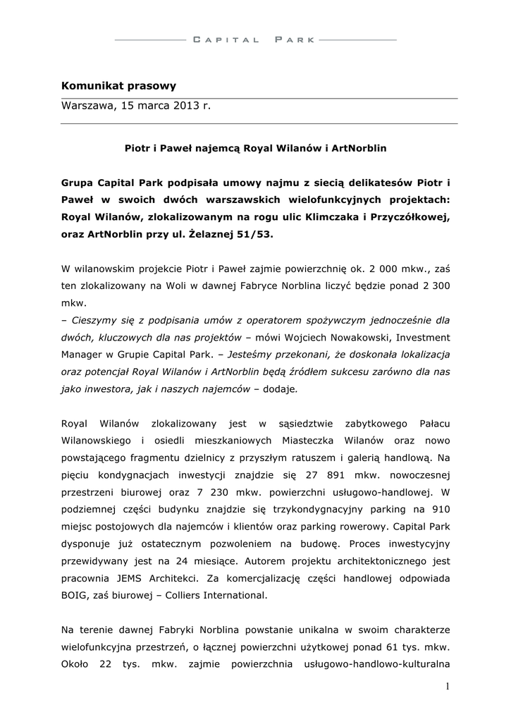Komunikat prasowy Warszawa, 15 marca 2013 r. INFORMACJA PRASOWA Piotr i Paweł najemcą Royal Wilanów i ArtNorblin Grupa Capital Park podpisała umowy najmu z siecią delikatesów Piotr i Paweł w swoich dwóch warszawskich wielofunkcyjnych projektach: Royal Wilanów, zlokalizowanym na rogu ulic Klimczaka i Przyczółkowej, oraz ArtNorblin przy ul. Żelaznej 51/53. W wilanowskim projekcie Piotr i Paweł zajmie powierzchnię ok. 2 000 mkw., zaś ten zlokalizowany na Woli w dawnej Fabryce Norblina liczyć będzie ponad 2 300 mkw. – Cieszymy się z podpisania umów z operatorem spożywczym jednocześnie dla dwóch, kluczowych dla nas projektów – mówi Wojciech Nowakowski, Investment Manager w Grupie Capital Park. – Jesteśmy przekonani, że doskonała lokalizacja oraz potencjał Royal Wilanów i ArtNorblin będą źródłem sukcesu zarówno dla nas jako inwestora, jak i naszych najemców – dodaje. Royal Wilanów Wilanowskiego zlokalizowany i osiedli jest w mieszkaniowych sąsiedztwie Miasteczka zabytkowego Wilanów oraz Pałacu nowo powstającego fragmentu dzielnicy z przyszłym ratuszem i galerią handlową. Na pięciu kondygnacjach inwestycji znajdzie się 27 891 mkw. nowoczesnej przestrzeni biurowej oraz 7 230 mkw. powierzchni usługowo-handlowej. W podziemnej części budynku znajdzie się trzykondygnacyjny parking na 910 miejsc postojowych dla najemców i klientów oraz parking rowerowy. Capital Park dysponuje już ostatecznym pozwoleniem na budowę. Proces inwestycyjny przewidywany jest na 24 miesiące. Autorem projektu architektonicznego jest pracownia JEMS Architekci. Za komercjalizację części handlowej odpowiada BOIG, zaś biurowej – Colliers International. Na terenie dawnej Fabryki Norblina powstanie unikalna w swoim charakterze wielofunkcyjna przestrzeń, o łącznej powierzchni użytkowej ponad 61 tys. mkw. Około 22 tys. mkw. zajmie powierzchnia usługowo-handlowo-kulturalna 1 zlokalizowana na poziomach od -1 do +2. Wokół głównej brukowanej uliczki, przy której pozostaną dawne hale fabryczne po rewitalizacji, powstanie miejsce spotkań i zakupów – około 70 sklepów i restauracji, BioBazar oraz ogólnodostępne Otwarte Muzeum Dawnej Fabryki Norblina z zabytkowymi maszynami oraz interaktywną częścią multimedialną. W obiekcie znajdzie się również 39 tys. mkw. powierzchni biurowej klasy A na poziomach od +3 do +8. Na czterech podziemnych kondygnacjach znajdzie się parking dla samochodów oraz nowatorski automatyczny parking dla rowerów na 90 miejsc postojowych (łącznie w projekcie znajdzie się około 180 miejsc dla rowerów). W tym roku inwestor spodziewa się uzyskać pozwolenie na budowę. Autorem projektu architektonicznego jest PRC Architekci. *** Dodatkowe informacje: Inwestor Grupa Capital Park aktywnie działa na polskim rynku nieruchomości od 2003 roku, inwestując wspólnie z międzynarodowym funduszem private equity Patron Capital Partners, zarządzającym kapitałem w kwocie ponad 2,3 mld EUR. Od początku działalności Grupa Capital Park stworzyła portfel inwestycyjny obejmujący 70 aktywów o łącznej ukończonej oraz planowanej powierzchni około 300 000 mkw. brutto, z czego ponad 80 procent zlokalizowanych jest w Warszawie, czyli na jednym z najbardziej perspektywicznych rynków w Polsce. Grupa Capital Park jest jedną z czołowych i najbardziej dynamicznie rozwijających się firm inwestycyjnych działających na rynku nieruchomości w Polsce. Grupa jest jednym z największych deweloperów na polskim rynku nieruchomości biurowych oraz liderem rynku high-street w Polsce. Capital Park buduje i zarządza również nieruchomościami typu street mall, w ramach programu Vis a Vis oraz innymi powierzchniami handlowymi. Portfel nieruchomości Grupy obejmuje również kilka projektów mieszkaniowych. Grupa koncentruje się na nabywaniu nieruchomości ze znacznym potencjałem budowy wartości poprzez m.in. zmianę warunków zagospodarowania przestrzennego, uzyskanie pozwoleń na budowę, budowę nowych obiektów, przebudowę istniejących, lub też poprawę zarządzania istniejącymi budynkami. Biuro prasowe Capital Park Joanna Cybulska tel. 0 48 22 642 24 16, + 48 609 716 113 email: [email protected] 2