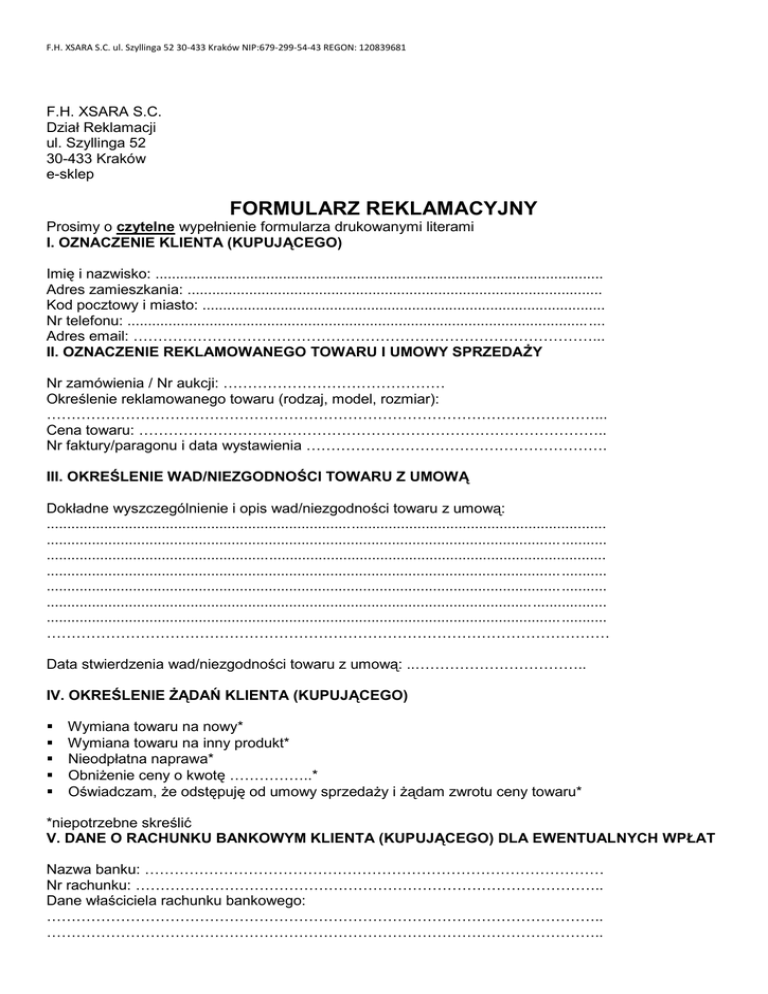 F.H. XSARA S.C. ul. Szyllinga 52 30-433 Kraków NIP:679-299-54-43 REGON: 120839681 F.H. XSARA S.C. Dział Reklamacji ul. Szyllinga 52 30-433 Kraków e-sklep FORMULARZ REKLAMACYJNY Prosimy o czytelne wypełnienie formularza drukowanymi literami I. OZNACZENIE KLIENTA (KUPUJĄCEGO) Imię i nazwisko: ............................................................................................................. Adres zamieszkania: ..................................................................................................... Kod pocztowy i miasto: .................................................................................................. Nr telefonu: .................................................................................................................... Adres email: …………………………………………………………………………………... II. OZNACZENIE REKLAMOWANEGO TOWARU I UMOWY SPRZEDAŻY Nr zamówienia / Nr aukcji: ……………………………………… Określenie reklamowanego towaru (rodzaj, model, rozmiar): …………………………………………………………………………………………………... Cena towaru: ………………………………………………………………………………….. Nr faktury/paragonu i data wystawienia ……………………………………………………. III. OKREŚLENIE WAD/NIEZGODNOŚCI TOWARU Z UMOWĄ Dokładne wyszczególnienie i opis wad/niezgodności towaru z umową: ........................................................................................................................................ ............................................................................................................................. ........... ........................................................................................................................................ ............................................................................................................................. ........... ............................................................................................................................. ........... ........................................................................................................................................ ............................................................................................................................. ........... …………………………………………………………………………………………………… Data stwierdzenia wad/niezgodności towaru z umową: ..…………………………….. IV. OKREŚLENIE ŻĄDAŃ KLIENTA (KUPUJĄCEGO) Wymiana towaru na nowy* Wymiana towaru na inny produkt* Nieodpłatna naprawa* Obniżenie ceny o kwotę ……………..* Oświadczam, że odstępuję od umowy sprzedaży i żądam zwrotu ceny towaru* *niepotrzebne skreślić V. DANE O RACHUNKU BANKOWYM KLIENTA (KUPUJĄCEGO) DLA EWENTUALNYCH WPŁAT Nazwa banku: ………………………………………………………………………………… Nr rachunku: ………………………………………………………………………………….. Dane właściciela rachunku bankowego: ………………………………………………………………………………………………….. ………………………………………………………………………………………………….. F.H. XSARA S.C. ul. Szyllinga 52 30-433 Kraków NIP:679-299-54-43 REGON: 120839681 VI. POZOSTAŁE OŚWIADCZENIA KLIENTA (KUPUJĄCEGO) 1. Klient oświadcza, że akceptuje sposób powiadomienia go o rozpatrzeniu reklamacji, opisany poniżej; 2. W przypadku nieuznania reklamacji za uzasadnioną Klient zobowiązuje się do: Pokrycia kosztów odesłania reklamowanego towaru Klientowi Po wypełnieniu formularza prosimy o jego odesłanie wraz z towarem i dowodem zakupu na adres: F.H. XSARA S.C. Dział Reklamacji Ul. Szyllinga 52 30-433 Kraków z dopiskiem „REKLAMACJA”. O sposobie rozpatrzenia reklamacji Klient zostanie powiadomiony telefonicznie, bądź pocztą elektroniczną. …………………………………….. data, podpis klienta