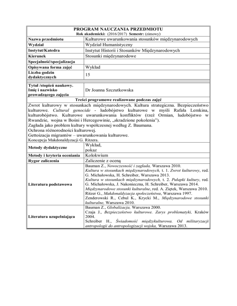 PROGRAM NAUCZANIA PRZEDMIOTU Rok akademicki: (2016/2017) Semestr: (zimowy) Kulturowe uwarunkowania stosunków międzynarodowych Wydział Humanistyczny Instytut Historii i Stosunków Międzynarodowych Stosunki międzynarodowe Nazwa przedmiotu Wydział Instytut/Katedra Kierunek Specjalność/specjalizacja Opisywana forma zajęć Liczba godzin dydaktycznych Wykład 15 Tytuł /stopień naukowy. Imię i nazwisko prowadzącego zajęcia Dr Joanna Szczutkowska Treści programowe realizowane podczas zajęć Zwrot kulturowy w stosunkach międzynarodowych. Kultura strategiczna. Bezpieczeństwo kulturowe. Cultural genocide - ludobójstwo kulturowe w myśli Rafała Lemkina, kulturobójstwo. Kulturowe uwarunkowania konfliktów (rzeź Ormian, ludobójstwo w Rwandzie, wojna w Bośni i Hercegowinie, „skradzione pokolenia”). Zagłada jako problem kultury współczesnej według Z. Baumana. Ochrona różnorodności kulturowej. Gettoizacja migrantów – uwarunkowania kulturowe. Koncepcja Makdonaldyzacji G. Ritzera. Metody dydaktyczne Metody i kryteria oceniania Rygor zaliczenia Literatura podstawowa Literatura uzupełniająca Wykład, pokaz Kolokwium Zaliczenie z oceną Bauman Z., Nowoczesność i zagłada, Warszawa 2010. Kultura w stosunkach międzynarodowych, t. 1. Zwrot kulturowy, red. G. Michałowska, H. Schreiber, Warszawa 2013. Kultura w stosunkach międzynarodowych, t. 2. Pułapki kultury, red. G. Michałowska, J. Nakonieczna, H. Schreiber, Warszawa 2014. Międzynarodowe stosunki kulturalne, red. A. Ziętek, Warszawa 2010. Ritzer G., Makdonaldyzacja społeczeństwa, Warszawa 1997. Zenderowski R., Cebul K., Krycki M., Międzynarodowe stosunki kulturalne, Warszawa 2010. Bauman Z., Globalizacja, Warszawa 2000. Czaja J., Bezpieczeństwo kulturowe. Zarys problematyki, Kraków 2004. Schreiber H., Świadomość międzykulturowa. Od militaryzacji antropologii do antropologizacji wojska, Warszawa 2013.
