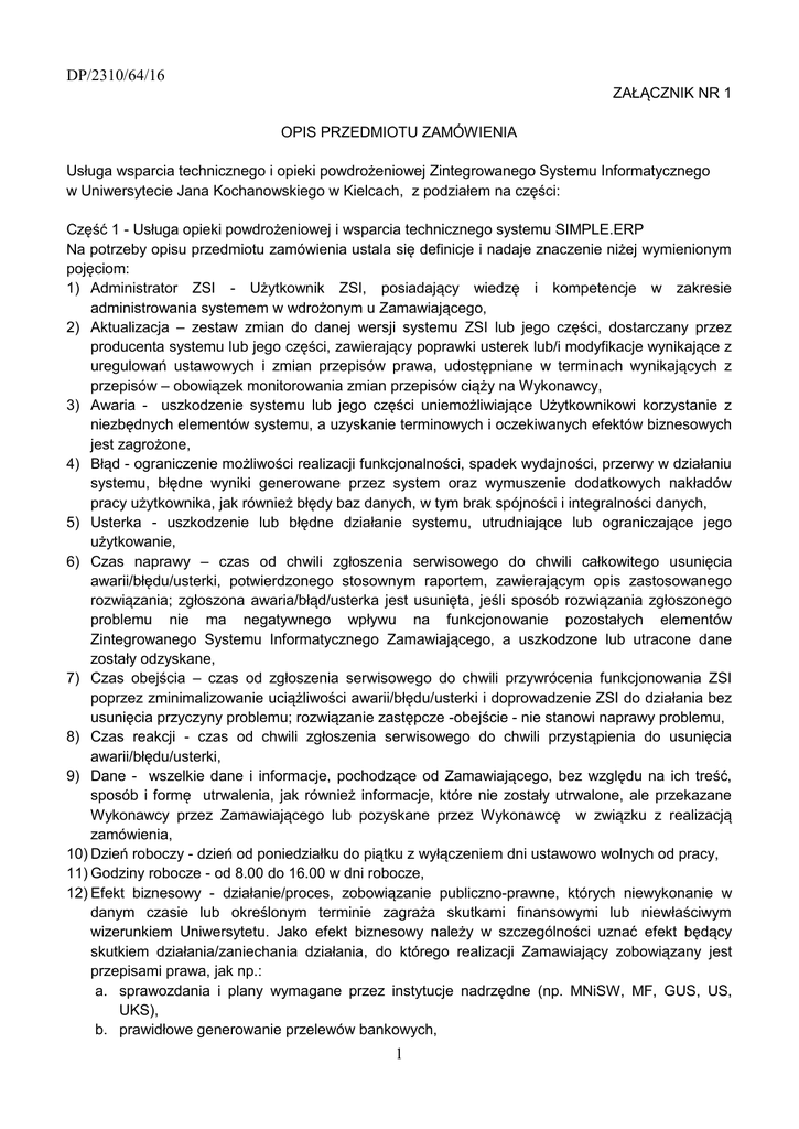DP/2310/64/16 ZAŁĄCZNIK NR 1 OPIS PRZEDMIOTU ZAMÓWIENIA Usługa wsparcia technicznego i opieki powdrożeniowej Zintegrowanego Systemu Informatycznego w Uniwersytecie Jana Kochanowskiego w Kielcach, z podziałem na części: Część 1 - Usługa opieki powdrożeniowej i wsparcia technicznego systemu SIMPLE.ERP Na potrzeby opisu przedmiotu zamówienia ustala się definicje i nadaje znaczenie niżej wymienionym pojęciom: 1) Administrator ZSI - Użytkownik ZSI, posiadający wiedzę i kompetencje w zakresie administrowania systemem w wdrożonym u Zamawiającego, 2) Aktualizacja – zestaw zmian do danej wersji systemu ZSI lub jego części, dostarczany przez producenta systemu lub jego części, zawierający poprawki usterek lub/i modyfikacje wynikające z uregulowań ustawowych i zmian przepisów prawa, udostępniane w terminach wynikających z przepisów – obowiązek monitorowania zmian przepisów ciąży na Wykonawcy, 3) Awaria - uszkodzenie systemu lub jego części uniemożliwiające Użytkownikowi korzystanie z niezbędnych elementów systemu, a uzyskanie terminowych i oczekiwanych efektów biznesowych jest zagrożone, 4) Błąd - ograniczenie możliwości realizacji funkcjonalności, spadek wydajności, przerwy w działaniu systemu, błędne wyniki generowane przez system oraz wymuszenie dodatkowych nakładów pracy użytkownika, jak również błędy baz danych, w tym brak spójności i integralności danych, 5) Usterka - uszkodzenie lub błędne działanie systemu, utrudniające lub ograniczające jego użytkowanie, 6) Czas naprawy – czas od chwili zgłoszenia serwisowego do chwili całkowitego usunięcia awarii/błędu/usterki, potwierdzonego stosownym raportem, zawierającym opis zastosowanego rozwiązania; zgłoszona awaria/błąd/usterka jest usunięta, jeśli sposób rozwiązania zgłoszonego problemu nie ma negatywnego wpływu na funkcjonowanie pozostałych elementów Zintegrowanego Systemu Informatycznego Zamawiającego, a uszkodzone lub utracone dane zostały odzyskane, 7) Czas obejścia – czas od zgłoszenia serwisowego do chwili przywrócenia funkcjonowania ZSI poprzez zminimalizowanie uciążliwości awarii/błędu/usterki i doprowadzenie ZSI do działania bez usunięcia przyczyny problemu; rozwiązanie zastępcze -obejście - nie stanowi naprawy problemu, 8) Czas reakcji - czas od chwili zgłoszenia serwisowego do chwili przystąpienia do usunięcia awarii/błędu/usterki, 9) Dane - wszelkie dane i informacje, pochodzące od Zamawiającego, bez względu na ich treść, sposób i formę utrwalenia, jak również informacje, które nie zostały utrwalone, ale przekazane Wykonawcy przez Zamawiającego lub pozyskane przez Wykonawcę w związku z realizacją zamówienia, 10) Dzień roboczy - dzień od poniedziałku do piątku z wyłączeniem dni ustawowo wolnych od pracy, 11) Godziny robocze - od 8.00 do 16.00 w dni robocze, 12) Efekt biznesowy - działanie/proces, zobowiązanie publiczno-prawne, których niewykonanie w danym czasie lub określonym terminie zagraża skutkami finansowymi lub niewłaściwym wizerunkiem Uniwersytetu. Jako efekt biznesowy należy w szczególności uznać efekt będący skutkiem działania/zaniechania działania, do którego realizacji Zamawiający zobowiązany jest przepisami prawa, jak np.: a. sprawozdania i plany wymagane przez instytucje nadrzędne (np. MNiSW, MF, GUS, US, UKS), b. prawidłowe generowanie przelewów bankowych, 1 DP/2310/64/16 c. sprawozdawczość POL-on, d. wypłaty stypendiów, e. wypłaty wynagrodzeń zgodnie z przyjętym corocznym terminarzem odrębnie dla różnych grup pracowniczych, f. złożenie deklaracji, JPK i płatności VAT, g. złożenie deklaracji i płatności ZUS, 13) Koordynator - osoba dedykowana przez Wykonawcę, która zna środowisko eksploatacji ZSI u Zamawiającego i jest uprawniona do kontaktów w zakresie prawidłowej realizacji zobowiązań określonych w umowie oraz właściwego przepływu informacji i rozwiązywania problemów eksploatacyjnych, 14) System serwisu - informatyczny, dostępny przez WWW, system rejestracji i monitorowania realizacji zgłoszeń, obejmujący zakres wszystkich modułów ZSI, wdrożonych u Zamawiającego, umożliwiający użytkownikom wgląd i śledzenie przez aplikację serwisową czasu i sposobu rozwiązania oraz historii każdego zgłoszenia, 15) Uniwersytet/Uczelnia - Uniwersytet Jana Kochanowskiego w Kielcach wraz z jego jednostkami organizacyjnymi, 16) Użytkownik - osoba fizyczna zatrudniona na podstawie stosunku pracy lub stosunku cywilnoprawnego przez Zamawiającego, uprawniona przez Zamawiającego do używania ZSI w ramach wykonywania obowiązków wynikających z takiego uprawnienia, 17) Użytkownik kluczowy - Użytkownik ZSI, przeszkolony w zakresie obsługi systemu/modułu, wskazany przez Zamawiającego do współpracy z Wykonawcą w zakresie funkcjonalności systemu/modułu, 18) ZSI - oznacza zintegrowany system informatyczny, wspomagający zarządzanie Uniwersytetem, obejmujący system klasy ERP SIMPLE i System Obsługi Toku Studiów Uczelnia.XP, składający się z modułów wraz ze szczegółowymi funkcjonalnościami w obszarach: finanse księgowość z JPK, personel, majątek trwały, obrót towarowy, budżetowanie, repozytorium danych, integracje z systemem obsługi toku studiów, dorobkiem naukowym i rozliczaniem projektów firmy Partners in Progress, Uczelnia.XP z podmodułami: dziekanat, stypendia, akademiki, rozliczenia ze studentami, planowanie zajęć i rozliczanie dydaktyki, rekrutacja, Wirtualna Uczelnia, sylabusy, wybory przedmiotów/specjalności/zapisy na zajęcia, dyplomowanie z antyplagiatem, ankiety i egzaminy, PIPServ.Mail, dorobek naukowy, rozliczanie projektów, system informowania kierownictwa, ELS i ELD w zakresie zleceń i przedłużania ważności, Akademickie Biuro Karier, POL-on, integracje z SIMPLE.ERP, POL-on, ALEPH, SOWA, Antyplagiat, ORPD, OPTeam. II. Przedmiotem zamówienia jest usługa wsparcia technicznego i opieki po