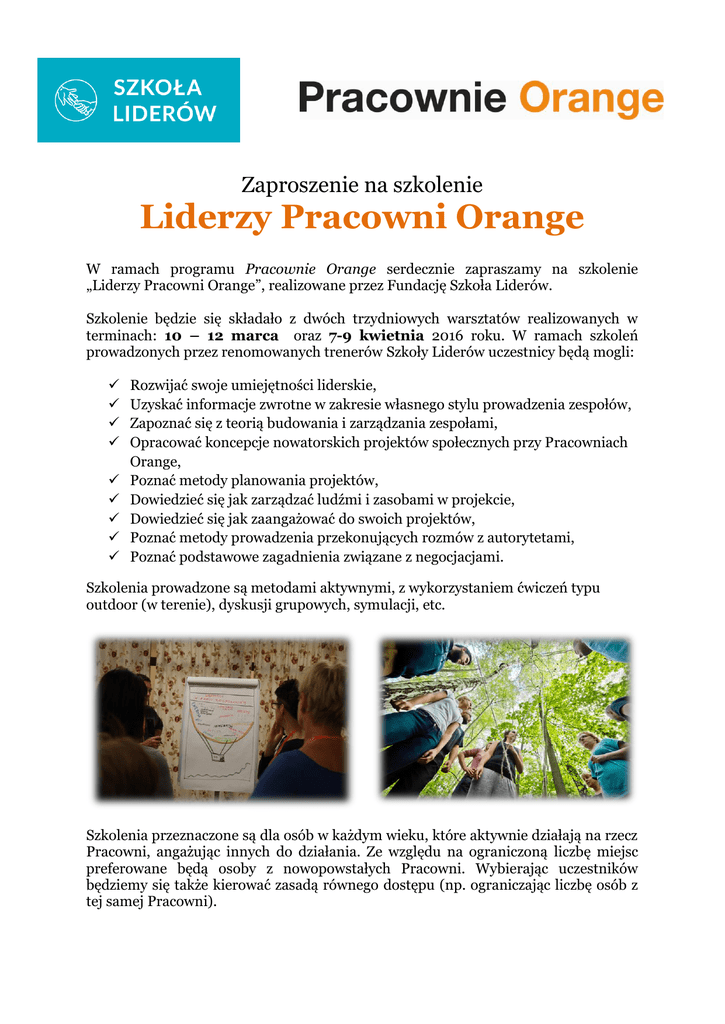 Zaproszenie na szkolenie Liderzy Pracowni Orange W ramach programu Pracownie Orange serdecznie zapraszamy na szkolenie „Liderzy Pracowni Orange”, realizowane przez Fundację Szkoła Liderów. Szkolenie będzie się składało z dwóch trzydniowych warsztatów realizowanych w terminach: 10 – 12 marca oraz 7-9 kwietnia 2016 roku. W ramach szkoleń prowadzonych przez renomowanych trenerów Szkoły Liderów uczestnicy będą mogli: Rozwijać swoje umiejętności liderskie, Uzyskać informacje zwrotne w zakresie własnego stylu prowadzenia zespołów, Zapoznać się z teorią budowania i zarządzania zespołami, Opracować koncepcje nowatorskich projektów społecznych przy Pracowniach Orange, Poznać metody planowania projektów, Dowiedzieć się jak zarządzać ludźmi i zasobami w projekcie, Dowiedzieć się jak zaangażować do swoich projektów, Poznać metody prowadzenia przekonujących rozmów z autorytetami, Poznać podstawowe zagadnienia związane z negocjacjami. Szkolenia prowadzone są metodami aktywnymi, z wykorzystaniem ćwiczeń typu outdoor (w terenie), dyskusji grupowych, symulacji, etc. Szkolenia przeznaczone są dla osób w każdym wieku, które aktywnie działają na rzecz Pracowni, angażując innych do działania. Ze względu na ograniczoną liczbę miejsc preferowane będą osoby z nowopowstałych Pracowni. Wybierając uczestników będziemy się także kierować zasadą równego dostępu (np. ograniczając liczbę osób z tej samej Pracowni). Szkolenia będą odbywały się w ośrodku szkoleniowym Pałac Łochów w Łochowie (woj. mazowieckie). Chętnym zapewniamy transport autokarem z centrum Warszawy i z powrotem (wyjazd w czwartek przed południem, powrót w sobotę po południu). Udział w szkoleniu jest bezpłatny. Oferujemy także zwrot kosztów podróży w wysokości: 150 PLN w przypadku miejscowości oddalonych o mniej niż 200 km, 250 PLN w przypadku miejscowości oddalonych o 200 km lub więcej. Zapraszamy wszystkich chętnych uczestników projektu do wysłania swoich zgłoszeń! Warunki uczestnictwa: Termin przyjmowania zgłoszeń: 29.02.2016 do godz. 15.00 (termin jest nieprzekraczalny). Termin ogłoszenia wyników rekrutacji: 1.03.2016 do godz. 17.00. Do udziału w szkoleniach zostanie zakwalifikowanych maksymalnie 27 osób. Na listę rezerwową zostanie zakwalifikowanych maksymalnie 8 osób. Będą one miały pierwszeństwo uczestnictwa w warsztatach w sytuacji gdy ktoś z listy uczestników dokona rezygnacji. Rozpatrywane będą wyłącznie rzetelnie wypełnione ankiety zgłoszeniowe. Preferowany będzie wybór po jednej osobie z jednej nowopowstałej pracowni. W przypadku wolnych miejsc zostaną wybrane osoby z poprzedniej edycji programu (które nie brały udziału w szkoleniach) lub więcej osób z jednej pracowni. Wybór zostanie dokonany na podstawie analizy ankiet zgłoszeniowych. W wyjątkowych sytuacjach skontaktujemy się telefonicznie z kandydatami. W razie jakichkolwiek pytań prosimy o kontakt: Paweł Cieślak, [email protected] Karolina Kanar-Kossobudzka, [email protected]