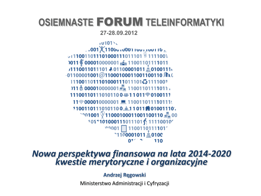 OSIEMNASTE FORUM TELEINFORMATYKI 27-28.09.2012 Nowa perspektywa finansowa na lata 2014-2020 kwestie merytoryczne i organizacyjne Andrzej Ręgowski Ministerstwo Administracji i Cyfryzacji Perspektywa finansowa 2014-2020 Jakie e-usługi trzeba zbududować? Stan posiadania e-usługi Administracji po 2013 (2015) Ankieta 1 ? + Perspektywa finansowa 2014-2020 = Stan pożądany e-usługi Administracji w 2020 Ankieta 2 Program Zintegrowanej Informatyzacji Perspektywa finansowa 2014-2020 Program Zintegrowanej Informatyzacji Państwa Program Zintegrowanej Informatyzacji Państwa – PZIP (obok Narodowego Planu Polska Szerokopasmowego) będzie dokumentem wykonawczym do Strategii Sprawne Państwo. PZIP ma stanowić program rozwoju w rozumieniu art. 15 ust. 4 pkt 2 ustawy z dnia 6 grudnia 2006 r. o zasadach prowadzenia polityki rozwoju (Dz. U. Nr 84, poz. 712 z późn. zm.). Perspektywa finansowa 2014-2020 Uwarunkowania UE Dostęp do funduszy unijnych objętych Wspólnymi Ramami Strategicznymi – WRS zostanie uzależniony od spełnienia warunków wstępnych, wskazanych w rozporządzeniach PE i Rady UE. Komisja Europejska zaproponowała wprowadzenie mechanizmu warunkowości ex ante w celu zapewnienia odpowiedniego gruntu pod inwestycje wspófinansowane ze środków unijnych. Perspektywa finansowa 2014-2020 Warunki ex-ante 2.1. Rozwój cyfrowy: W krajowej lub regionalnej strategii innowacji na rzecz inteligentnej specjalizacji znajduje się rozdział na temat rozwoju cyfrowego, który zawiera: Budżet i priorytety działań określone na podstawie analizy SWOT zgodnej z tabelą wyników EAC; Została przeprowadzona analiza równoważenia wsparcia dla popytu i podaży w zakresie ICT; Wymierne cele dla wyników interwencji w zakresie kultury informatycznej, umiejętności informatycznych, e-integracji, edostępności oraz e-zdrowia, powiązanych z krajowymi lub regionalnymi strategiami sektorowymi; Ocenę potrzeb w zakresie budowania większego potencjału technologii informacyjno-komunikacyjnych. Perspektywa finansowa 2014-2020 Warunki ex-ante cd. 2.2. Infrastruktura dostępu nowej generacji: Gotowy jest plan dostępu nowej generacji zawierający: Regularnie aktualizowany plan inwestycji w infrastrukturę poprzez koncentrację popytu i mapowania infrastruktury i usług; Modele zrównoważonych inwestycji, które zwiększają konkurencyjność i zapewniają dostęp do otwartej, przystępnej cenowo i dobrej jakości infrastruktury, uwzględniającej przyszłe potrzeby i usług; Środki na stymulowanie inwestycji prywatnych. Perspektywa finansowa 2014-2020 Łatwo nie będzie, ale damy radę … [email protected] Dziękuję za uwagę
