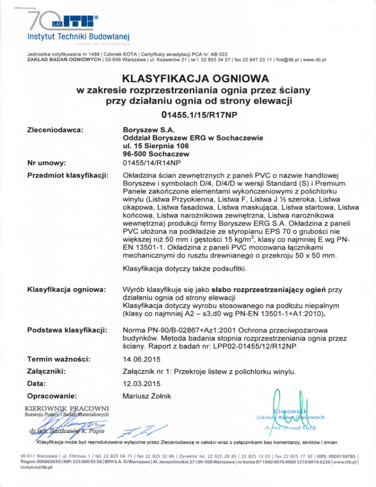 l nstytut recn xi py9,?*l11.9j n i Jednostka notyfikowana nr 1488 | Członek EOTA I Ceńyfikaty akredytacji PCA nr: AB O23 ZA!<ŁAD BADAN OGN|OVVYCH | 02-656 Warszawa I ul. Ksawerów 21 | te'l. 22 853 34 27 |łax22 847 23 1 1 | [email protected] I www.itb.pl KLASYFIKACJA OGNIOWA w zakresie rozprzestrzeniania ognia przez ściany przy działaniu ognia od strony eIewacji 01455.111slRl7NP zleceniodawca: Boryszew S.A. Oddział Boryszew ERG w Sochaczewie ul. 15 Sierpnia 106 96-500 Sochaczew 01455114lRl4NP Nr umowy: Przedm iot klasyfikacji : Okładzina ścianzewnętrznych z paneli PVC o nazwie handlowej Boryszew i symbolach Dl , Dl4lD w wersji Standard (S) i Premium. Pa ne le zakończone e lementam i wyko ńcze n iowym i z pol ich lorku winylu (Listwa Przyokienna, Listwa F, Listwa J Tr, szeroka, Listwa okapowa, Listwa fasadowa, Listwa maskująca, Listwa stańowa, Listwa ko ń cowa, Listwa na rozn kow a zewnętrzna, Listwa n a roźn kowa wewnętrzna) produkcjifirmy Boryszew ERG S.A. Okładzina z paneli PVC ułozona na podkładzie ze styropianu EPS 70 o grubościnie większej niż 50 mm igęstości15 kg/m3, klasy co najmniej E wg PNEN 13501 -1. Okładzina z paneli PVC mocowana łącznikami mechanicznymi do rusztu drewnianego o przekroju 50 x 50 mm. i i Klasyfikacja dotyczy także podsufitki. Klasyfikacja ogniowa: Podstawa klasyfi kacj i Wyrób klasyfikuje się jako słabo rozprzestrzeniający ogień przy działaniu ognia od strony elewacji Klasyfikacja dotyczy wyrobu stosowanego na podłozu niepalnym (klasy co najmniej A2 - s3,d0 wg PN-EN 13501-1+A1 :2010). : a P N -9 0/B-0 2867 + Az1 :200 1 Och ro n a p rzeciwpo żar ow a budynków. Metoda badania stopnia rozprzestrzeniania ognia przez ściany.Raport z badań nr: LPP02 -01455l12/R1 2NP. N o rm Termin ważności: 14.06.2015 Załączniki: Załączniknr 1,, Przekroje listew z polichlorku winylu, Data: 12,03,2015 Opracowanie: Mariusz Żołnik KIERoW --*ł- -/ Ę.g-ź ,? -źź- może być reprodukowana wyłącznie przezZleceniodawcę w całościwraz zzałącznikami bez komentarzy, skrótów izmian 00-611WarszawaIul.Filtrowal Ite|.228250471 |fax22825 5286|Dyrektorle,'.22 8252885|22825 'l303|fax2282577 30|KRS:oooo'l58785| R€gon:000063ó50 [email protected] |NlP:525 000 93 58lBPH s.A. o/Warszawa IAl.Jerozolimskie 27 |o0-5o8Warszawa I nr konta 87 l 060 0076 oooo 3210 oo16 6236 |wwwitb.pl I