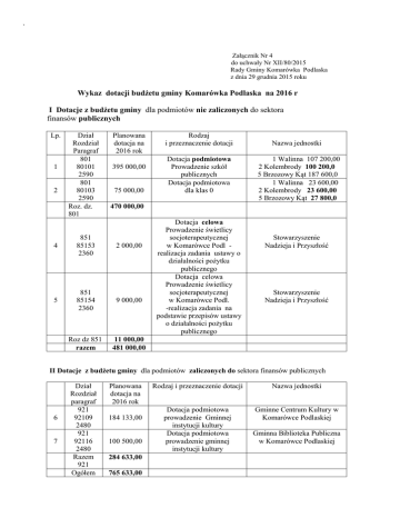 ` Załącznik Nr 4 do uchwały Nr XII/80/2015 Rady Gminy Komarówka Podlaska z dnia 29 grudnia 2015 roku Wykaz dotacji budżetu gminy Komarówka Podlaska na 2016 r I Dotacje z budżetu gminy dla podmiotów nie zaliczonych do sektora finansów publicznych Lp. 1 2 Dział Rozdział Paragraf 801 80101 2590 801 80103 2590 Roz. dz. 801 Planowana dotacja na 2016 rok 395 000,00 75 000,00 Rodzaj i przeznaczenie dotacji Dotacja podmiotowa Prowadzenie szkół publicznych Dotacja podmiotowa dla klas 0 Nazwa jednostki 1 Walinna 107 200,00 2 Kolembrody 100 200,0 5 Brzozowy Kąt 187 600,0 1 Walinna 23 600,00 2 Kolembrody 23 600,00 5 Brzozowy Kąt 27 800,0 470 000,00 4 851 85153 2360 2 000,00 5 851 85154 2360 9 000,00 Roz dz 851 razem 11 000,00 481 000,00 Dotacja celowa Prowadzenie świetlicy socjoterapeutycznej w Komarówce Podl realizacja zadania ustawy o działalności pożytku publicznego Dotacja celowa Prowadzenie świetlicy socjoterapeutycznej w Komarówce Podl. -realizacja zadania na podstawie przepisów ustawy o działalności pożytku publicznego Stowarzyszenie Nadzieja i Przyszłość Stowarzyszenie Nadzieja i Przyszłość II Dotacje z budżetu gminy dla podmiotów zaliczonych do sektora finansów publicznych 6 7 Dział Rozdział paragraf 921 92109 2480 921 92116 2480 Razem 921 Ogółem Planowana dotacja na 2016 rok 184 133,00 100 500,00 284 633,00 765 633,00 Rodzaj i przeznaczenie dotacji Nazwa jednostki Dotacja podmiotowa prowadzenie Gminnej instytucji kultury Dotacja podmiotowa prowadzenie gminnej instytucji kultury Gminne Centrum Kultury w Komarówce Podlaskiej Gminna Biblioteka Publiczna w Komarówce Podlaskiej