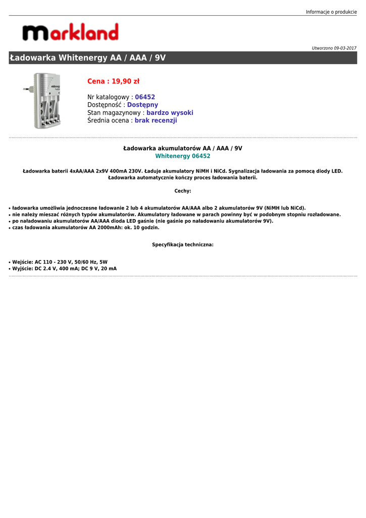 Informacje o produkcie Utworzono 09-03-2017 Ładowarka Whitenergy AA / AAA / 9V Cena : 19,90 zł Nr katalogowy : 06452 Dostępność : Dostępny Stan magazynowy : bardzo wysoki Średnia ocena : brak recenzji Ładowarka akumulatorów AA / AAA / 9V Whitenergy 06452 Ładowarka baterii 4xAA/AAA 2x9V 400mA 230V. Ładuje akumulatory NiMH i NiCd. Sygnalizacja ładowania za pomocą diody LED. Ładowarka automatycznie kończy proces ładowania baterii. Cechy: ● ● ● ● ładowarka umożliwia jednoczesne ładowanie 2 lub 4 akumulatorów AA/AAA albo 2 akumulatorów 9V (NiMH lub NiCd). nie należy mieszać różnych typów akumulatorów. Akumulatory ładowane w parach powinny być w podobnym stopniu rozładowane. po naładowaniu akumulatorów AA/AAA dioda LED gaśnie (nie gaśnie po naładowaniu akumulatorów 9V). czas ładowania akumulatorów AA 2000mAh: ok. 10 godzin. Specyfikacja techniczna: ● ● Wejście: AC 110 - 230 V, 50/60 Hz, 5W Wyjście: DC 2.4 V, 400 mA; DC 9 V, 20 mA
