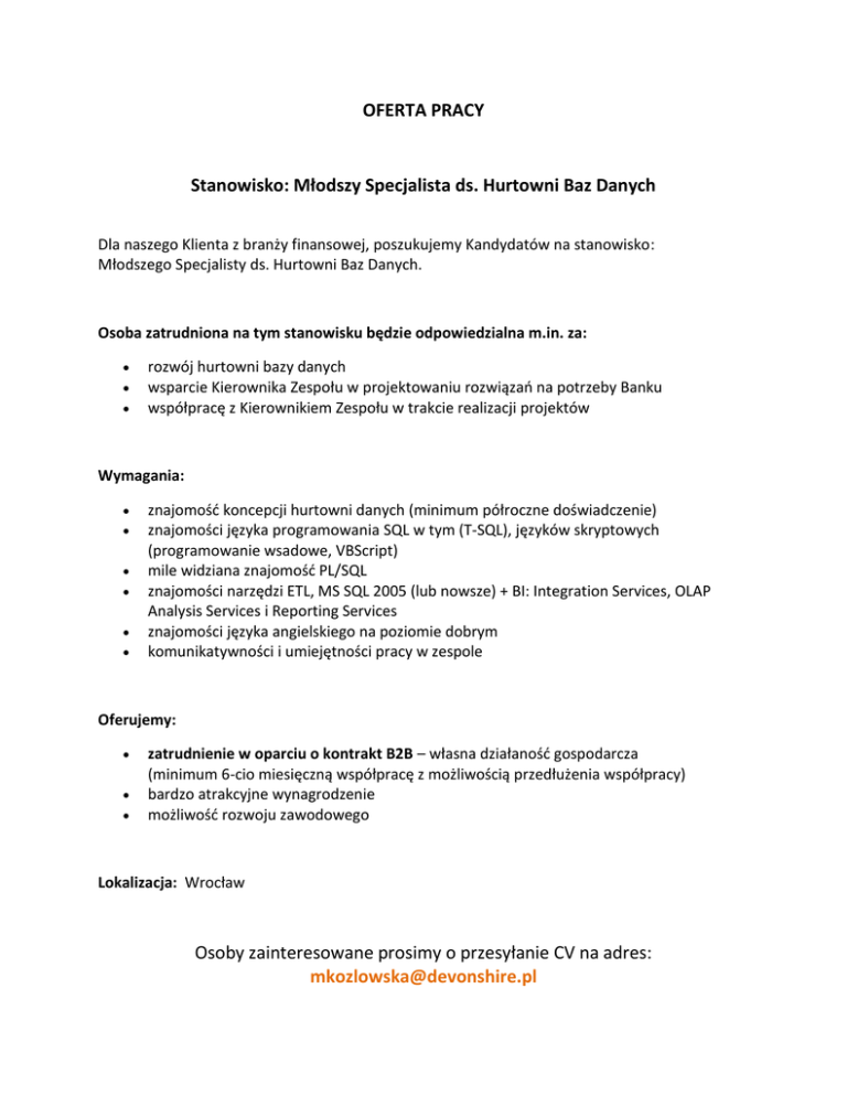 OFERTA PRACY Stanowisko: Młodszy Specjalista ds. Hurtowni Baz Danych Dla naszego Klienta z branży finansowej, poszukujemy Kandydatów na stanowisko: Młodszego Specjalisty ds. Hurtowni Baz Danych. Osoba zatrudniona na tym stanowisku będzie odpowiedzialna m.in. za:    rozwój hurtowni bazy danych wsparcie Kierownika Zespołu w projektowaniu rozwiązań na potrzeby Banku współpracę z Kierownikiem Zespołu w trakcie realizacji projektów Wymagania:       znajomość koncepcji hurtowni danych (minimum półroczne doświadczenie) znajomości języka programowania SQL w tym (T-SQL), języków skryptowych (programowanie wsadowe, VBScript) mile widziana znajomość PL/SQL znajomości narzędzi ETL, MS SQL 2005 (lub nowsze) + BI: Integration Services, OLAP Analysis Services i Reporting Services znajomości języka angielskiego na poziomie dobrym komunikatywności i umiejętności pracy w zespole Oferujemy:    zatrudnienie w oparciu o kontrakt B2B – własna działaność gospodarcza (minimum 6-cio miesięczną współpracę z możliwością przedłużenia współpracy) bardzo atrakcyjne wynagrodzenie możliwość rozwoju zawodowego Lokalizacja: Wrocław Osoby zainteresowane prosimy o przesyłanie CV na adres: [email protected]