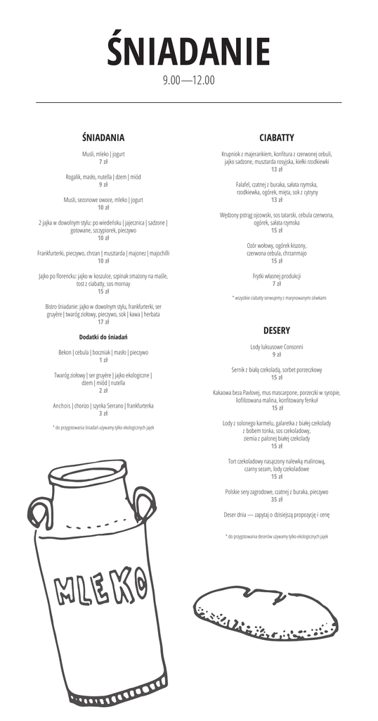 ŚNIADANIE 9.00—12.00 ŚNIADANIA CIABATTY Musli, mleko | jogurt 7 zł Krupniok z majerankiem, konfitura z czerwonej cebuli, jajko sadzone, musztarda rosyjska, kiełki rzodkiewki 13 zł Rogalik, masło, nutella | dżem | miód 9 zł Musli, sezonowe owoce, mleko | jogurt 10 zł 2 jajka w dowolnym stylu: po wiedeńsku | jajecznica | sadzone | gotowane, szczypiorek, pieczywo 10 zł Frankfurterki, pieczywo, chrzan | musztarda | majonez | majochilli 10 zł Jajko po florencku: jajko w koszulce, szpinak smażony na maśle, tost z ciabatty, sos mornay 15 zł Bistro śniadanie: jajko w dowolnym stylu, frankfurterki, ser gruyère | twaróg ziołowy, pieczywo, sok | kawa | herbata 17 zł Dodatki do śniadań Bekon | cebula | boczniak | masło | pieczywo 1 zł Twaróg ziołowy | ser gruyère | jajko ekologiczne | dżem | miód | nutella 2 zł Anchois | chorizo | szynka Serrano | frankfurterka 3 zł * do przygotowania śniadań używamy tylko ekologicznych jajek Falafel, czatnej z buraka, sałata rzymska, rzodkiewka, ogórek, mięta, sok z cytryny 13 zł Wędzony pstrąg ojcowski, sos tatarski, cebula czerwona, ogórek, sałata rzymska 15 zł Ozór wołowy, ogórek kiszony, czerwona cebula, chrzanmajo 15 zł Frytki własnej produkcji 7 zł  * wszystkie ciabatty serwujemy z marynowanymi oliwkami DESERY Lody luksusowe Consonni 9 zł Sernik z białą czekoladą, sorbet porzeczkowy 15 zł Kakaowa beza Pavlovej, mus mascarpone, porzeczki w syropie, liofilizowana malina, konfitowany fenkuł 15 zł Lody z solonego karmelu, galaretka z białej czekolady z bobem tonka, sos czekoladowy, ziemia z palonej białej czekolady 15 zł Tort czekoladowy nasączony nalewką malinową, czarny sezam, lody czekoladowe 15 zł Polskie sery zagrodowe, czatnej z buraka, pieczywo 35 zł Deser dnia — zapytaj o dzisiejszą propozycję i cenę * do przygotowania deserów używamy tylko ekologicznych jajek