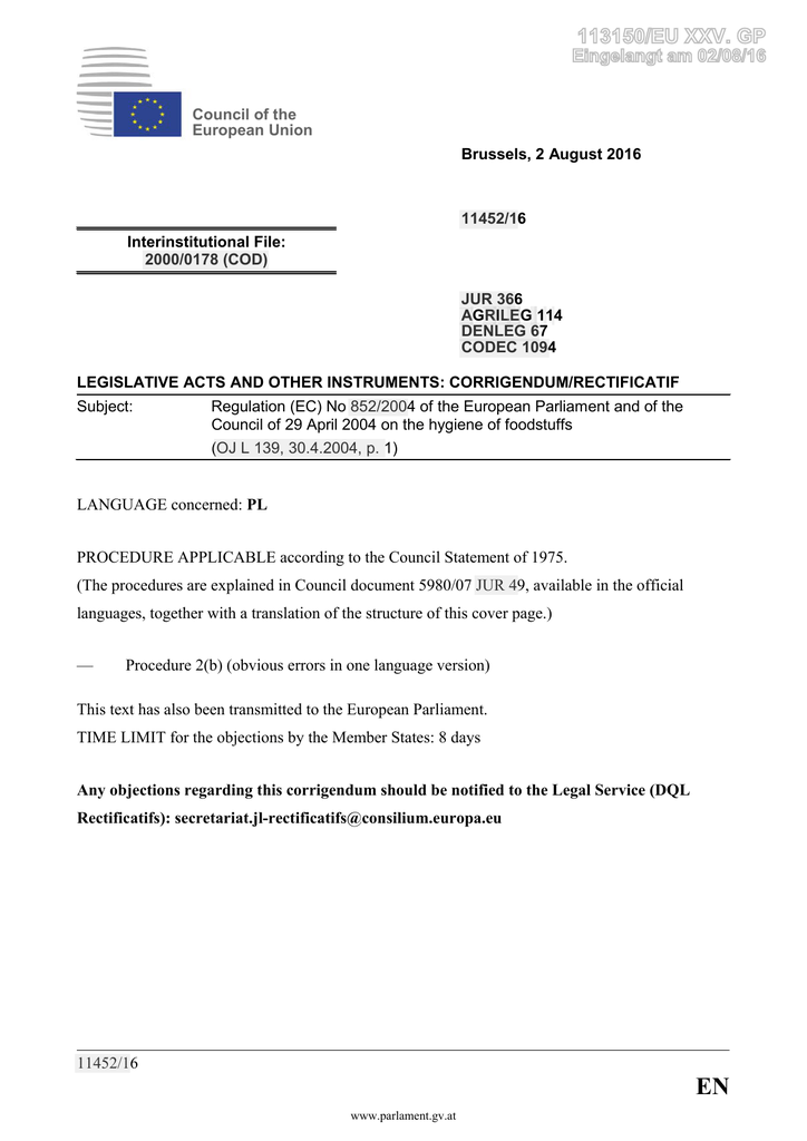 113150/EU XXV. GP Eingelangt am 02/08/16 Council of the European Union Brussels, 2 August 2016 11452/16 Interinstitutional File: 2000/0178 (COD) JUR 366 AGRILEG 114 DENLEG 67 CODEC 1094 LEGISLATIVE ACTS AND OTHER INSTRUMENTS: CORRIGENDUM/RECTIFICATIF Subject: Regulation (EC) No 852/2004 of the European Parliament and of the Council of 29 April 2004 on the hygiene of foodstuffs (OJ L 139, 30.4.2004, p. 1) LANGUAGE concerned: PL PROCEDURE APPLICABLE according to the Council Statement of 1975. (The procedures are explained in Council document 5980/07 JUR 49, available in the official languages, together with a translation of the structure of this cover page.) — Procedure 2(b) (obvious errors in one language version) This text has also been transmitted to the European Parliament. TIME LIMIT for the objections by the Member States: 8 days Any objections regarding this corrigendum should be notified to the Legal Service (DQL Rectificatifs): [email protected] 11452/16 EN www.parlament.gv.at =$àĄ&=1,. 6352672:$1,( GRUR]SRU]ąG]HQLD:(QU3DUODPHQWX(XURSHMVNLHJRL5DG\]GQLDNZLHWQLD UZVSUDZLHKLJLHQ\ĞURGNyZVSRĪ\ZF]\FK ']LHQQLN8U]ĊGRZ\8QLL(XURSHMVNLHM/]NZLHWQLDU 3ROVNLHZ\GDQLHVSHFMDOQHUR]G]LDáWRP Strona 322, art. 2 ust. 1 lit. m) zamiast: „m) ÄSU]HWZDU]DQLH´R]QDF]DNDĪGHG]LDáDQLHNWyUH]QDF]QLH]PLHQLDSURGXNWZ\MĞFLRZ\ZW\P RJU]HZDQLHZĊG]HQLHVROHQLHGRMU]HZDQLHVXV]HQLHPDU\QRZDQLHHNVWUDNFMĊZ\FLVNDQLH OXESRáąF]HQLHW\FKSURFHVyZ´ SRZLQQRE\ü „m) ÄSU]HWZDU]DQLH´R]QDF]DNDĪGHG]LDáDQLHNWyUH]QDF]QLH]PLHQLDSURGXNWZ\MĞFLRZ\ZW\P ogrzewanie, ZĊG]HQLHSHNORZDQLHGRMU]HZDQLHVXV]HQLHPDU\QRZDQLHHNVWUDNFMĊ Z\FLVNDQLHOXESRáąF]HQLHW\FKSURFHVyZ´ 11452/16 =$àĄ&=1,. 1 PL www.parlament.gv.at Strona 322, art. 2 ust. 1 lit. n) zamiast: „n) ÄSURGXNW\QLHSU]HWZRU]RQH´R]QDF]DMąĞURGNLVSRĪ\ZF]HNWyUHQLHSRGOHJDMą SU]HWZDU]DQLXLREHMPXMąSURGXNW\NWyUH]RVWDá\UR]G]LHORQHSRG]LHORQHQDF]ĊĞFL SU]HFLĊWHSRNURMRQHSR]EDZLRQHNRĞFLUR]GUREQLRQHZ\JDUERZDQHVNUXV]RQHQDFLĊWH Z\F]\V]F]RQHSU]\FLĊWHSR]EDZLRQHáXVHN]PLHORQHVFKáRG]RQH]DPURĪRQHJáĊERNR ]DPURĪRQHOXEUR]PURĪRQH´ SRZLQQRE\ü „n) ÄSURGXNW\QLHSU]HWZRU]RQH´R]QDF]DMąĞURGNLVSRĪ\ZF]HNWyUHQLHSRGOHJDMą SU]HWZDU]DQLXLREHMPXMąSURGXNW\NWyUH]RVWDá\UR]G]LHORQHSRG]LHORQHQDF]ĊĞFL SU]HFLĊWHSRNURMRQHSR]EDZLRQHNRĞFLUR]GUREQLRQHRVNyURZDQHVNUXV]RQHQDFLĊWH Z\F]\V]F]RQHSU]\FLĊWHSR]EDZLRQHáXVHN]PLHORQHVFKáRG]RQH]DPURĪRQHJáĊERNR ]DPURĪRQHOXEUR]PURĪRQH´ 11452/16 =$àĄ&=1,. 2 PL www.parlament.gv.at