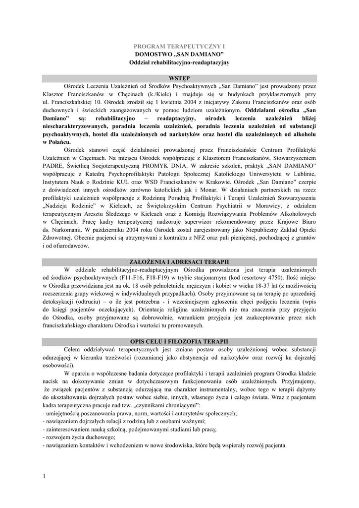 PROGRAM TERAPEUTYCZNY I DOMOSTWO „SAN DAMIANO” Oddział rehabilitacyjno-readaptacyjny WSTĘP Ośrodek Leczenia Uzależnień od Środków Psychoaktywnych „San Damiano” jest prowadzony przez Klasztor Franciszkanów w Chęcinach (k./Kielc) i znajduje się w budynkach przyklasztornych przy ul. Franciszkańskiej 10. Ośrodek zrodził się 1 kwietnia 2004 z inicjatywy Zakonu Franciszkanów oraz osób duchownych i świeckich zaangażowanych w pomoc ludziom uzależnionym. Oddziałami ośrodka „San Damiano” są: rehabilitacyjno – readaptacyjny, ośrodek leczenia uzależnień bliżej niescharakteryzowanych, poradnia leczenia uzależnień, poradnia leczenia uzależnień od substancji psychoaktywnych, hostel dla uzależnionych od narkotyków oraz hostel dla uzależnionych od alkoholu w Połańcu. Ośrodek stanowi część działalności prowadzonej przez Franciszkańskie Centrum Profilaktyki Uzależnień w Chęcinach. Na miejscu Ośrodek współpracuje z Klasztorem Franciszkanów, Stowarzyszeniem PADRE, Świetlicą Socjoterapeutyczną PROMYK DNIA. W zakresie szkoleń, praktyk „SAN DAMIANO” współpracuje z Katedrą Psychoprofilaktyki Patologii Społecznej Katolickiego Uniwersytetu w Lublinie, Instytutem Nauk o Rodzinie KUL oraz WSD Franciszkanów w Krakowie. Ośrodek „San Damiano” czerpie z doświadczeń innych ośrodków zarówno katolickich jak i Monar. W działaniach partnerskich na rzecz profilaktyki uzależnień współpracuje z Rodzinną Poradnią Profilaktyki i Terapii Uzależnień Stowarzyszenia „Nadzieja Rodzinie” w Kielcach, ze Świętokrzyskim Centrum Psychiatrii w Morawicy, z odziałem terapeutycznym Aresztu Śledczego w Kielcach oraz z Komisją Rozwiązywania Problemów Alkoholowych w Chęcinach. Pracę kadry terapeutycznej nadzoruje superwizor rekomendowany przez Krajowe Biuro ds. Narkomanii. W październiku 2004 roku Ośrodek został zarejestrowany jako Niepubliczny Zakład Opieki Zdrowotnej. Obecnie pacjenci są utrzymywani z kontraktu z NFZ oraz puli pieniężnej, pochodzącej z grantów i od ofiarodawców. ZAŁOŻENIA I ADRESACI TERAPII W oddziale rehabilitacyjno-readaptacyjnym Ośrodka prowadzona jest terapia uzależnionych od środków psychoaktywnych (F11-F16, F18-F19) w trybie stacjonarnym (kod resortowy 4750). Ilość miejsc w Ośrodku przewidziana jest na ok. 18 osób pełnoletnich; mężczyzn i kobiet w wieku 18-37 lat (z możliwością rozszerzenia grupy wiekowej w indywidualnych przypadkach). Osoby przyjmowane są na terapię po uprzedniej detoksykacji (odtruciu) – o ile jest potrzebna - i wcześniejszym zgłoszeniu chęci podjęcia leczenia (wpis do księgi pacjentów oczekujących). Orientacja religijna uzależnionych nie ma znaczenia przy przyjęciu do Ośrodka, osoby przyjmowane są dobrowolnie, warunkiem przyjęcia jest zaakceptowanie przez nich franciszkańskiego charakteru Ośrodka i wartości tu promowanych. OPIS CELU I FILOZOFIA TERAPII Celem oddziaływań terapeutycznych jest zmiana postaw osoby uzależnionej wobec substancji odurzającej w kierunku trzeźwości (rozumianej jako abstynencja od narkotyków oraz rozwój ku dojrzałej osobowości). W oparciu o współczesne badania dotyczące profilaktyki i terapii uzależnień program Ośrodka kładzie nacisk na dokonywanie zmian w dotychczasowym funkcjonowaniu osób uzależnionych. Przyjmujemy, że związek pacjentów z substancją odurzającą ma charakter instrumentalny, wobec tego w terapii dążymy do ukształtowania dojrzałych postaw wobec siebie, innych, własnego życia i całego świata. Wraz z pacjentem kadra terapeutyczna pracuje nad tzw. „czynnikami chroniącymi”: - umiejętnością poszanowania prawa, norm, wartości i autorytetów społecznych; - nawiązaniem dojrzałych relacji z rodziną lub z osobami ważnymi; - zainteresowaniem nauką szkolną, podejmowanymi studiami lub pracą; - rozwojem życia duchowego; - nawiązaniem kontaktów i wchodzeniem w nowe środowiska, które będą wspierały rozwój pacjenta. 1 Jednocześnie w czasie terapii ogranicza się zachowania ryzykowne, co regulują podstawowe zasady regulaminu Ośrodka. 1. 2. 3. REGULAMIN: Abstynencja od substancji psychoaktywnych – narkotyki, alkohol, tytoń oraz leki używane w celach niemedycznych (bez konsultacji z lekarzem); Zakaz zachowań agresywnych (w tym agresji słownej) i przestępczych (włamania, kradzieże, oszustwa itp.); Abstynencja seksualna. Łamanie regulaminu wiąże się z konsekwencją rozwiązania kontraktu z pacjentem. Decyduje o tym kadra terapeutyczna wraz ze społecznością. W wyjątkowych sytuacjach Lider Ośrodka lub zastępujący go terapeuta dyżurujący może podjąć decyzję samodzielnie. FRANCISZKAŃSKI CHARAKTER OŚRODKA Umiejscowienie Ośrodka przy Klasztorze Franciszkanów umożliwia rozwijanie duchowego elementu w terapii uzależnień. Duchowość jest rozumiana jako kształtowanie człowieka ku wartościom wyższym. Franciszkański charakter Ośrodka wyraża się w szczególnym ukierunkowaniu na następujące wartości: promocja chrześcijańskiej wizji świata – odniesienie do Jezusa Chrystusa i Ewangelii, wspólnota – tworzenie z Ośrodka - Domostwa (dzielenie się rzeczami materialnymi i duchowymi, nawiązywanie i pogłębianie relacji z członkami Społeczności, odpowiedzialność za leczenie własne i innych, dbanie o Ośrodek jako dom w którym mieszkamy i żyjemy), uczciwość – przyjęcie i uznanie norm „SAN DAMIANO” (mówienie Społeczności nawet o najdrobniejszych uchybieniach, uczenie się na popełnionych błędach), zaangażowanie w podejmowaną pracę – praca jest wykonywana jak najlepiej (szybko, starannie i rzetelnie), jest wyznaczana i monitorowana przez Społeczność (może mieć wymiar fizyczny, lub umysłowy – nauka, warsztaty terapeutyczne, zajęcia twórcze), uprzejmość i gościnność – wyraża się w dbaniu o mieszkańców Chęcin, gości przychodzących na teren „SAN DAMIANO”, pracujące na miejscu osoby, wolontari