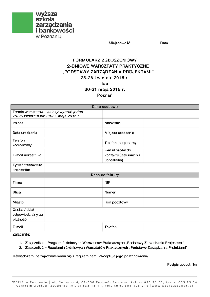 Miejscowość …………………… Data …………………… FORMULARZ ZGŁOSZENIOWY 2-DNIOWE WARSZTATY PRAKTYCZNE „PODSTAWY ZARZĄDZANIA PROJEKTAMI” 25-26 kwietnia 2015 r. lub 30-31 maja 2015 r. Poznań Dane osobowe Termin warsztatów – należy wybrać jeden 25-26 kwietnia lub 30-31 maja 2015 r. Imiona Nazwisko Data urodzenia Miejsce urodzenia Telefon komórkowy Telefon stacjonarny E-mail uczestnika E-mail osoby do kontaktu (jeśli inny niż uczestnika) Tytuł / stanowisko uczestnika Dane do faktury Firma NIP Ulica Numer Miasto Kod pocztowy Osoba / dział odpowiedzialny za płatność E-mail Telefon Załączniki: 1. Załącznik 1 – Program 2-dniowych Warsztatów Praktycznych „Podstawy Zarządzania Projektami” 2. Załącznik 2 – Regulamin 2-dniowych Warsztatów Praktycznych „Podstawy Zarządzania Projektami” Oświadczam, że zapoznałem/am się z regulaminem i akceptuję jego postanowienia. Podpis uczestnika PROGRAM 2-DNIOWE WARSZTATY PRAKTYCZNE „PODSTAWY ZARZĄDZANIA PROJEKTAMI” 25-26 kwietnia 2015 r. lub 30-31 maja 2015 r. Poznań Załącznik 1 1. Podstawowe pojęcia w zarządzaniu projektami 1.1 Projekt, Program, Portfel 1.2 Zakres 1.3 Potrójne ograniczenie 1.4 Cele, wymagania, ograniczenia, założenia 1.5 Interesariusze 1.6 Cykl życia projektu 2. Wybór i rozpoczęcie projektu 2.1 Potrzeba biznesowa jako pra-przyczyna projektów 2.2 Metody wyboru projektów 2.3 Karta projektu 2.4 Spotkanie otwierające – kick off meeting 2.5 Wymagania projektu 2.6 Interesariusze i zarządzanie relacjami 3. Planowanie projektu 3.1 Struktura podziału pracy (WBS) 3.2 Planowanie czasu – harmonogram 3.3 Planowanie kosztów 3.4 Planowanie i zarządzanie ryzykiem 4. Zarządzanie zespołem projektowym 4.1 Cykl życia zespołu 4.2 Sytuacje konfliktowe 4.3 Planowanie i realizacja spotkań w trakcie projektu 4.4 Komunikacja w projekcie 5. Zamykanie projektu i zarządzanie wiedzą 6. Test wiedzy z warsztatu Sobota, 25 kwietnia / 30 maja 2015 r. 9.00-13.00 13.00-14.00 14.00-17.00 Wprowadzenie do warsztatów Wprowadzenie do Zarządzania Projektami Lunch Rozpoczęcie Projektu Niedziela, 26 kwietnia / 31 maja 2015 r. 9.00-13.00 13.00-14.00 14.00-17.00 Planowanie Projektu Realizacja Projektu Lunch Zakończenie Projektu Test Certyfikat Certyfikat sygnowany przez MT&DC PMI Global R.E.P. potwierdzający uczestnictwo i zdobycie 16 punktów PDU otrzymają wszystkie osoby, które zdadzą test wiedzy z zakresu warsztatu. Firma MT&DC jako pierwsza w Polsce otrzymała status PMI Global Registered Education Provider i jest uznawana za dostawcę najwyższej jakości usług edukacyjnych. REGULAMIN 2-DNIOWE WARSZTATY PRAKTYCZNE „PODSTAWY ZARZĄDZANIA PROJEKTAMI” 25-26 kwietnia 2015 r. lub 30-31 maja 2015 r. Poznań Załącznik 2 §1 Informacje ogólne 1. Niniejszy regulamin, zwany dalej Regulaminem, określa zasady uczestnictwa w 2dniowych Warsztatach Praktycznych „Podstawy Zarządzania Projektami”. 2. Organizatorem Warsztatów Praktycznych „Podstawy Zarządzania Projektami” jest Wyższa Szkoła Zarządzania i Bankowości w Poznaniu. 3. Warsztaty Praktyczne „Podstawy Zarządzania Projektami” odbędą się w terminie 25-26 kwietnia 2015 r. (sobota w godzinach 9.00-17.00, niedziela w godzinach 9.00-17.00) oraz w terminie 30-31 maja 2015 r. (sobota w godzinach 9.00-17.00, niedziela w godzinach 9.00-17.00) w siedzibie Wyższej Szkoły Zarządzania i Bankowości w Poznaniu – ul. Robocza 4, 61-538 Poznań. §2 Definicje Ilekroć w niniejszym Regulaminie stosuje się poniższe określenia i definicje, należy je rozumieć, jak następuje: Warsztat - zorganizowany przez Wyższą Szkołę Zarządzania i Bankowości w Poznaniu 2dniowe Warsztaty Praktyczne „Podstawy Zarządzania Projektami” o którym mowa w ust. 1 Zamawiający - osoba fizyczna lub prawna, która zdecydowała się delegować Uczestnika do udziału w Warsztacie. Uczestnik - osoba, która została oddelegowana przez Zamawiającego do udziału w Warsztacie. §3 Zgłoszenie 1. Skan podpisanego zgłoszenia, o którym mowa w ust. 1 należy dostarczyć Organizatorowi za pomocą poczty elektronicznej na adres [email protected] w terminie 7 dni przed datą rozpoczęcia Warsztatu. Organizator zastrzega sobie prawo do wydłużenia powyższego terminu. 2. Wydrukowane i podpisane zgłoszenie, o którym mowa w ust. 1 należy dostarczyć Organizatorowi w terminie 7 dni przed datą rozpoczęcia Warsztatu. Organizator zastrzega sobie prawo do wydłużenia powyższego terminu. 3. Ilość osób mogących wziąć udział w warsztacie jest ograniczona i wynosi 20. O zakwalifikowaniu do uczestnictwa decyduje kolejność zgłoszeń. 4. Uczestnicy, którzy nie zakwalifikują się do udziału w Warsztacie z uwagi na brak miejsc zostaną wpisani przez Organizatora na listę rezerwową. 5. W przypadku, gdy któryś z uczestników zakwalifikowanych do udziału w Warsztacie zgodnie z ust. 3 zrezygnuje z uczestnictwa lub z innej przyczyny nie będzie mógł wziąć udziału w Warsztacie Organizator informuje telefonicznie osoby, o których mowa w ust. 4 zgodnie z kolejnością na liście rezerwowej o możliwości wzięcia udziału w Warsztacie 6. Po otrzymaniu Zgłoszenia, o którym mowa w ust. 1 Organizator informuje Zamawiającego za pośrednictwem poczty elektronicznej o zakwalifikowaniu Uczestnika do udziału w Warsztacie zgodnie z ust. 3 lub o wpisaniu go na listę rezerwową zgodnie z ust. 4 7. W przypadku, gdy Uczestnik nie weźmie udziału w Warsztacie z uwagi na brak miejsc Organizator zwróci Zamawiającemu wniesioną opłatę w terminie 7 dni od zakończenia Warsztatu 8. Warunkiem dopuszczenia do uczestnictwa w Warsztacie jest zapłata ceny zgodnie z §4. §4 Cena, Rabaty, Warunki płatności 1. Cena za udział w Warsztacie wynosi 750 zł brutto i obejmuje materiały dla Uczestników, poczęstunki kawowe i lunch każdego dnia. 1. Po otrzymaniu zgłoszenia Organizator wystawia fakturę proforma, na podstawie której Zamawiający zobowi